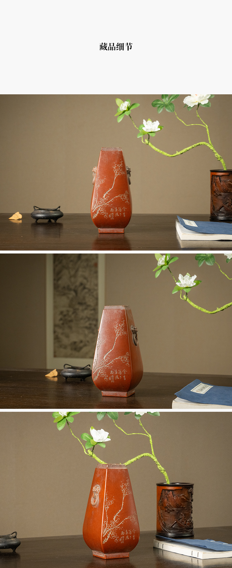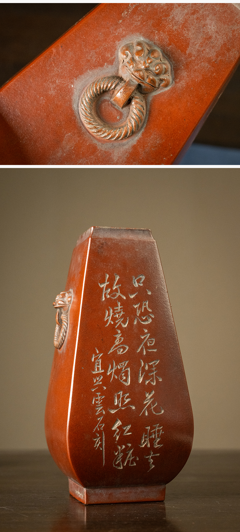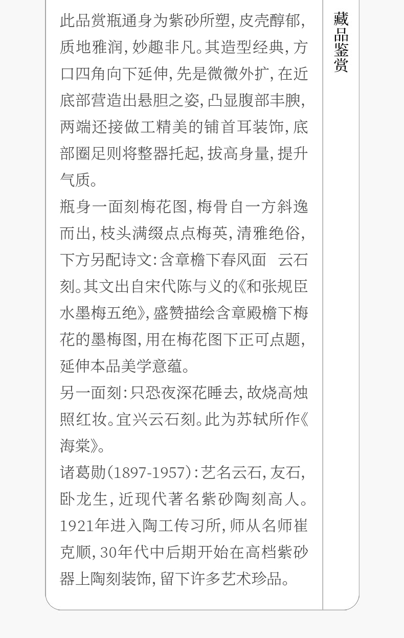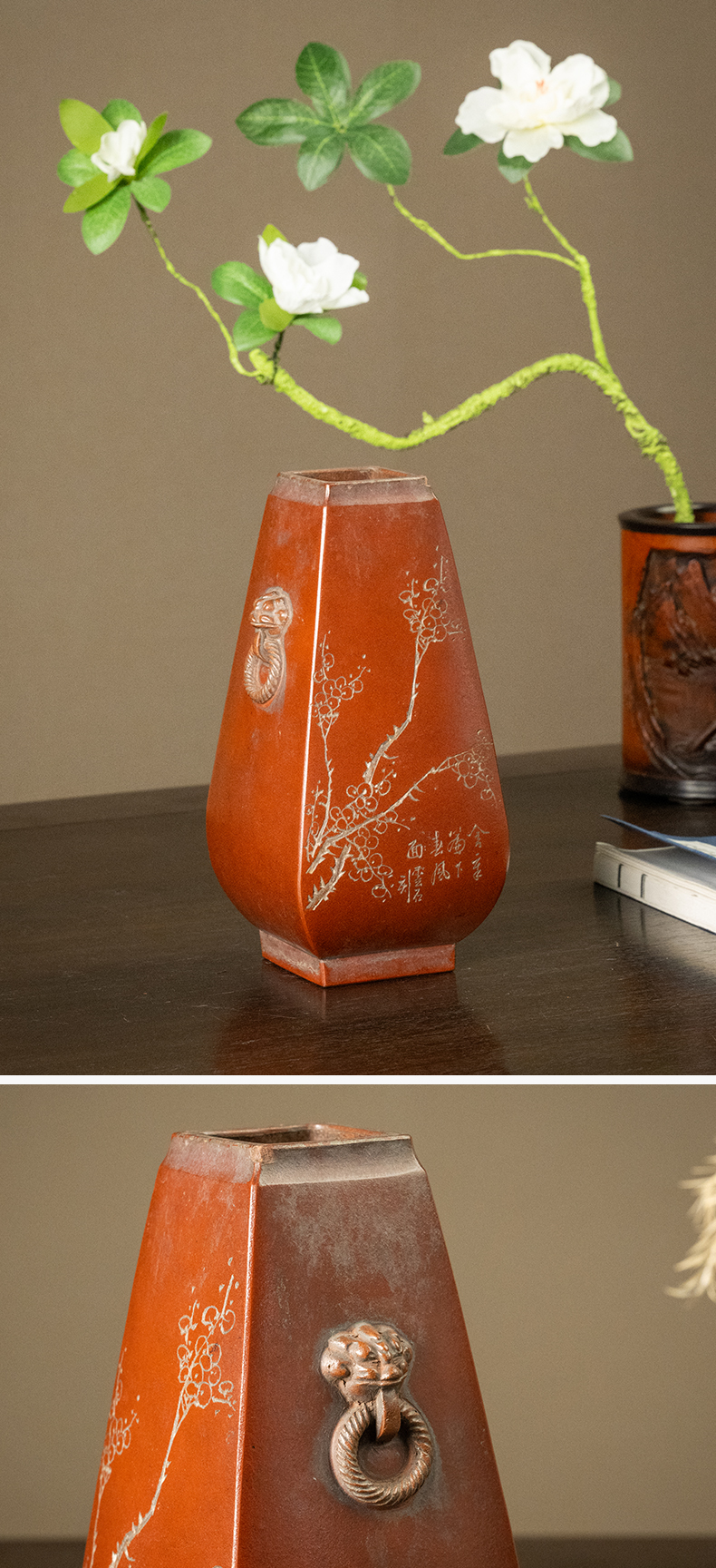 民国 紫砂阴刻梅花诗文方形赏瓶