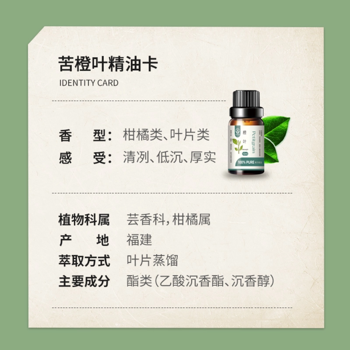 苦橙叶精油取自橙树的树叶与嫩枝,气味清新,是橙香中略带苦味的绿叶香气,持续力强,有着天然的舒缓魔力,放松身心,疗愈心灵,感受大自然的“苦尽甘来”。
