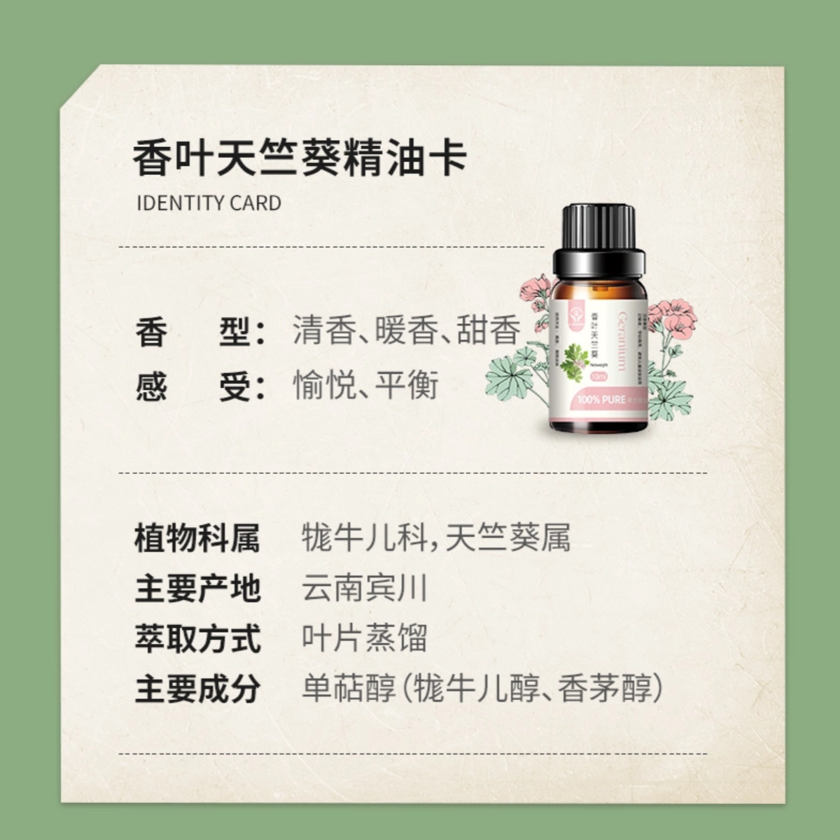 “平衡大师”香叶天竺葵,多分子组合令其气味美丽又多层次,浓郁的花香和些许清凉甜美的类似玫瑰花的味道,有着闻香即放松的力量。