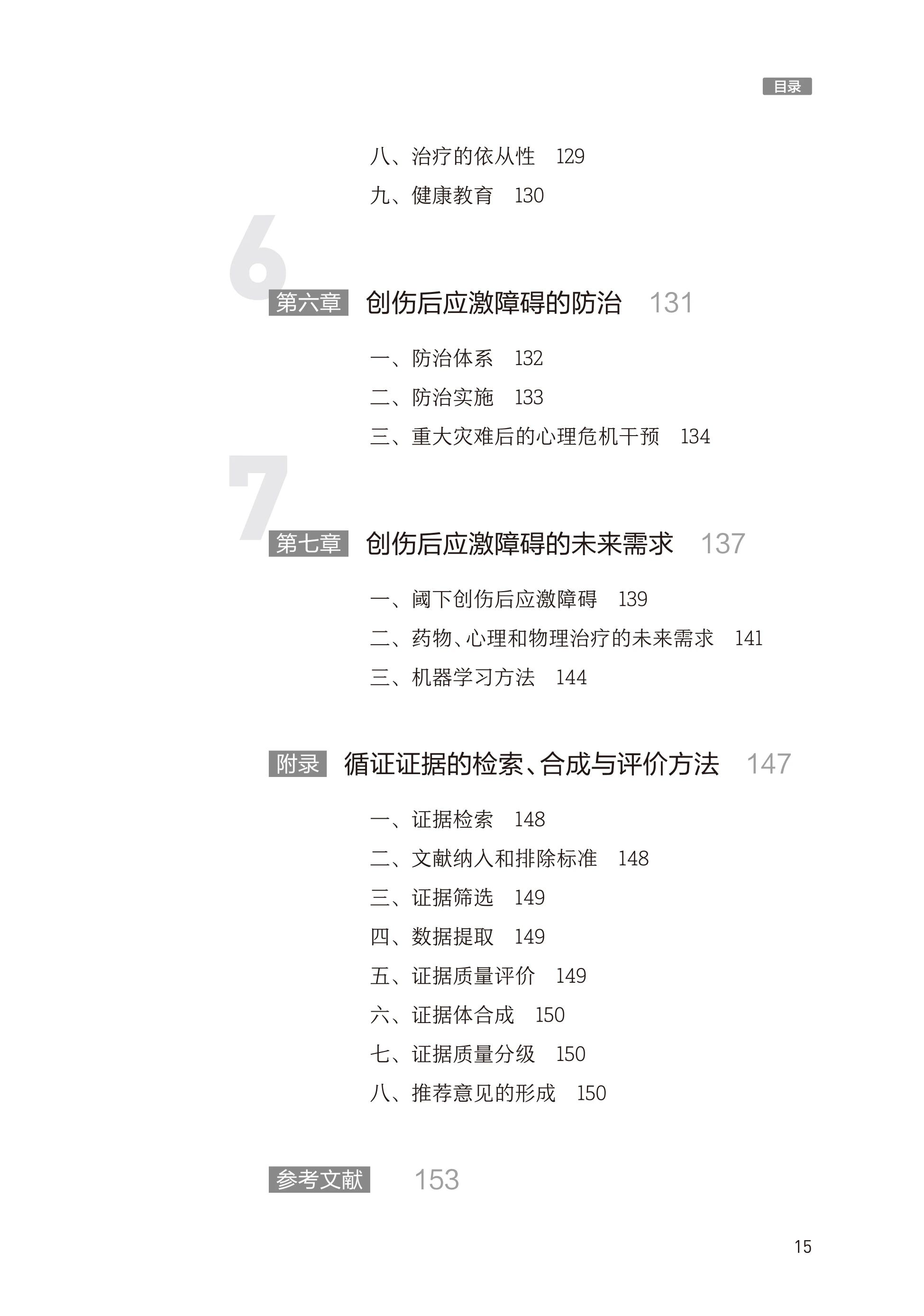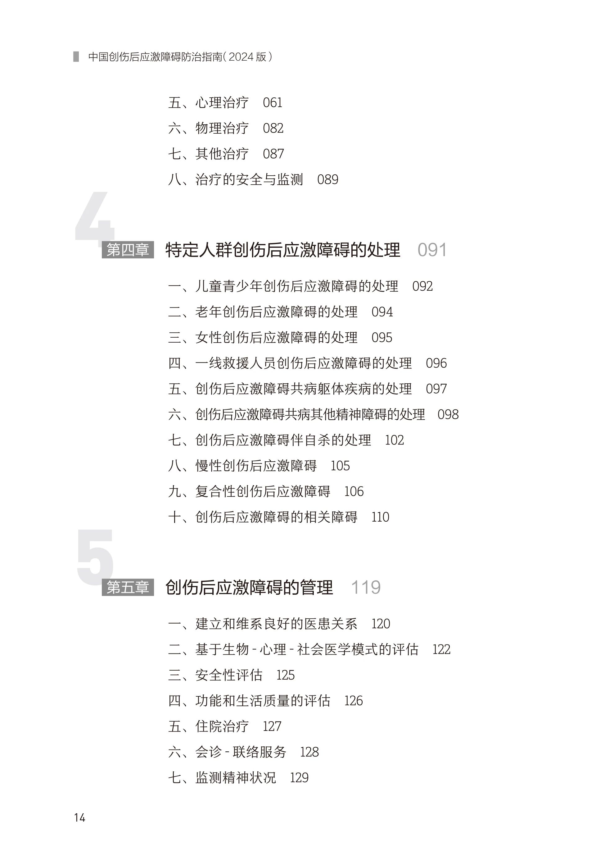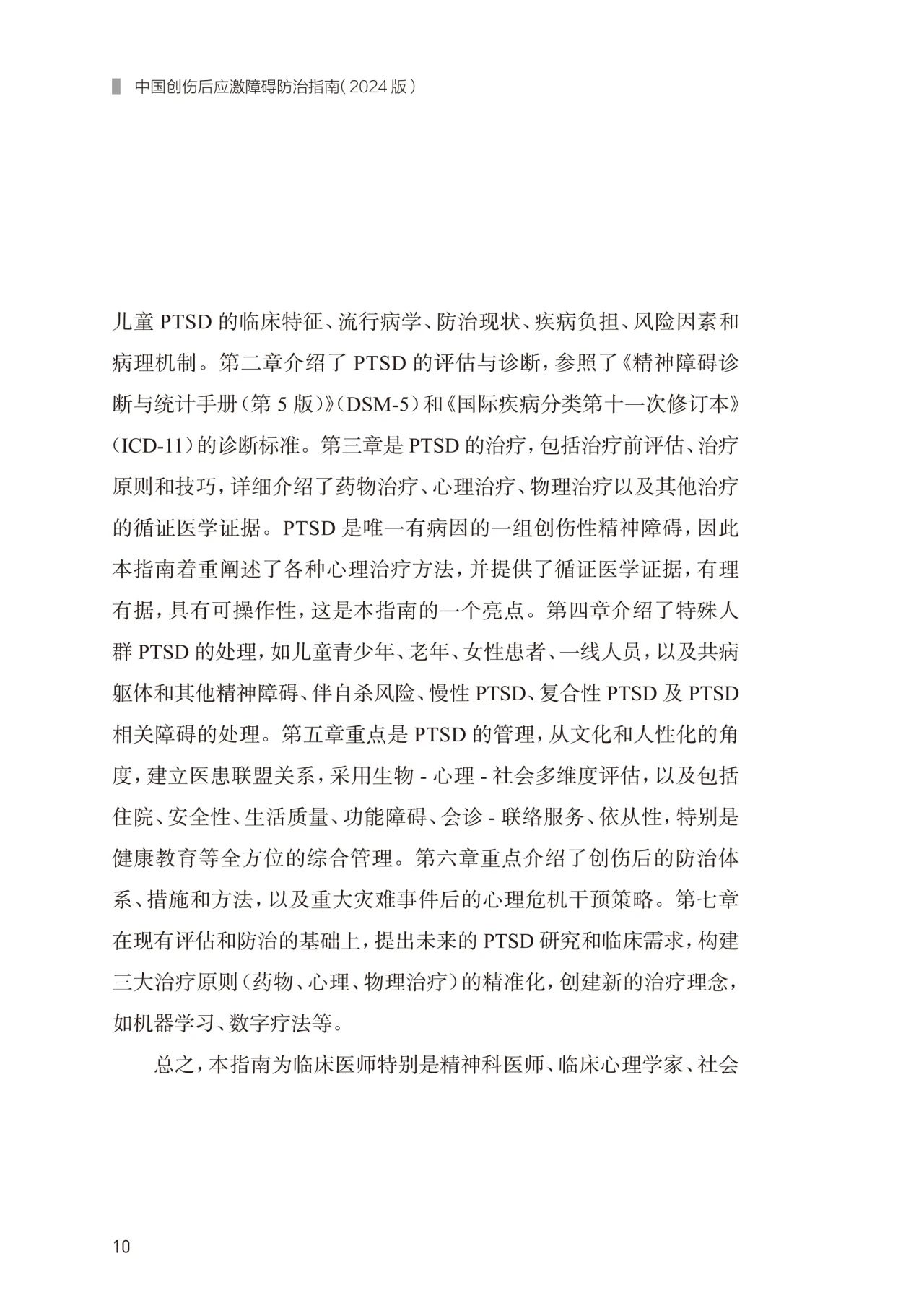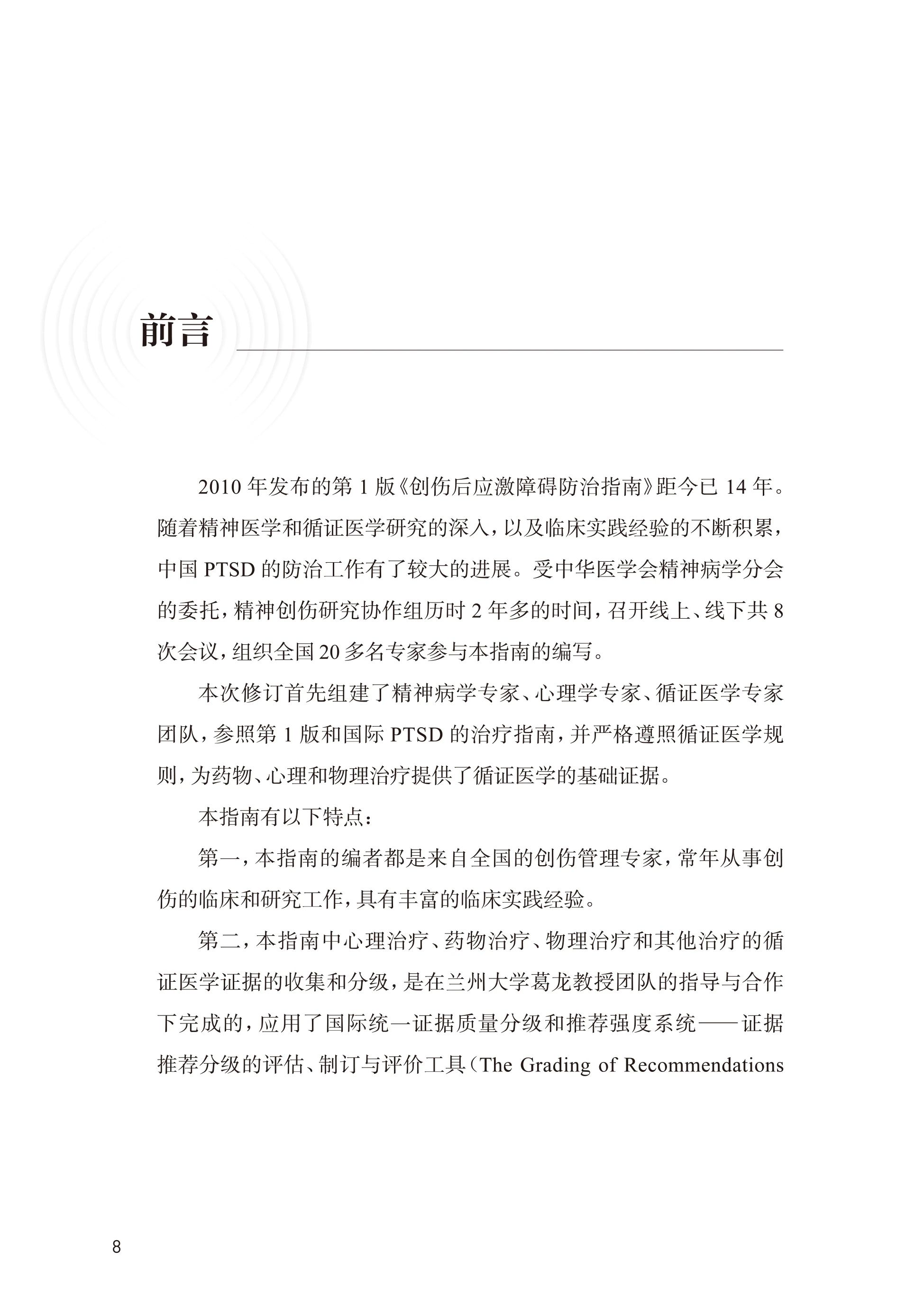 《中国创伤后应激障碍防治指南(2024版)》本着传承和创新的精神,组建了由精神病学专家、心理学专家、循证医学专家组成的指南制订团队,严格遵照循证医学规则,采用以证据水平和推荐强度标准提出推荐意见的方法,为药物、心理和物理疗法提供了循证医学的基础证据,并将近年来国内外的最新研究成果与我国的具体国情和实践相结合,在着重介绍诊治等相关内容的同时,也重点介绍了预防和康复等重要理念及方法。本指南可读性及操作性强,可为一线临床医生和科研工作者提供实践指导和参考依据,也可为政府相关决策者、社区工作者提供专业的指导意见和工作规范。