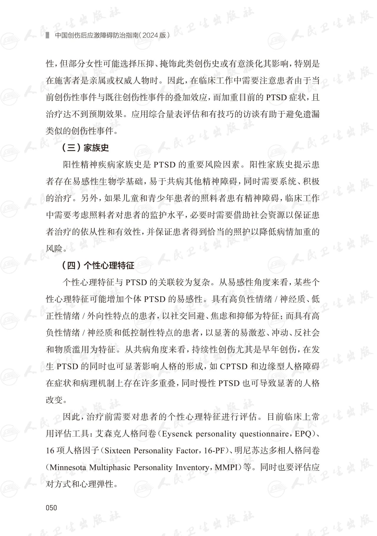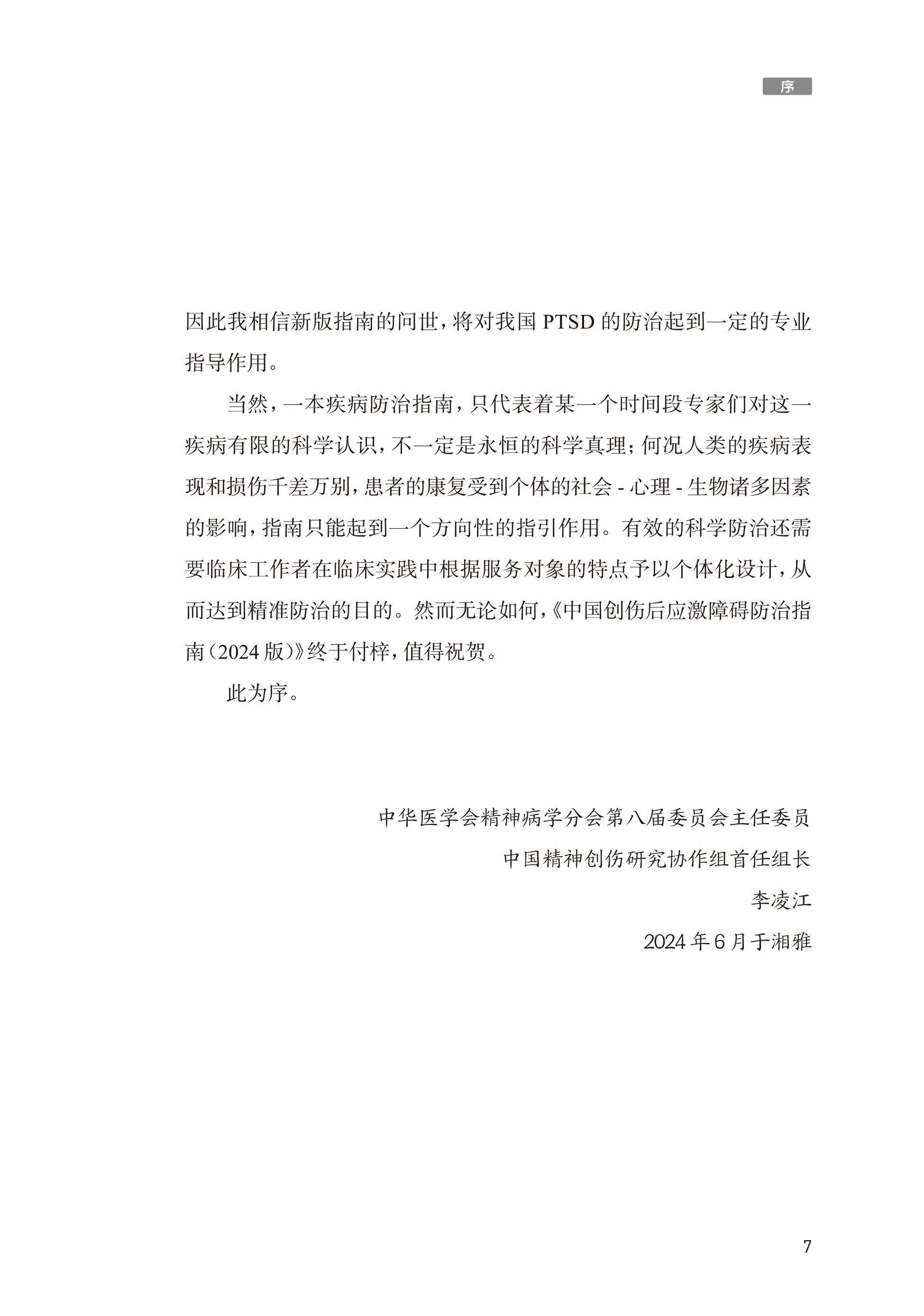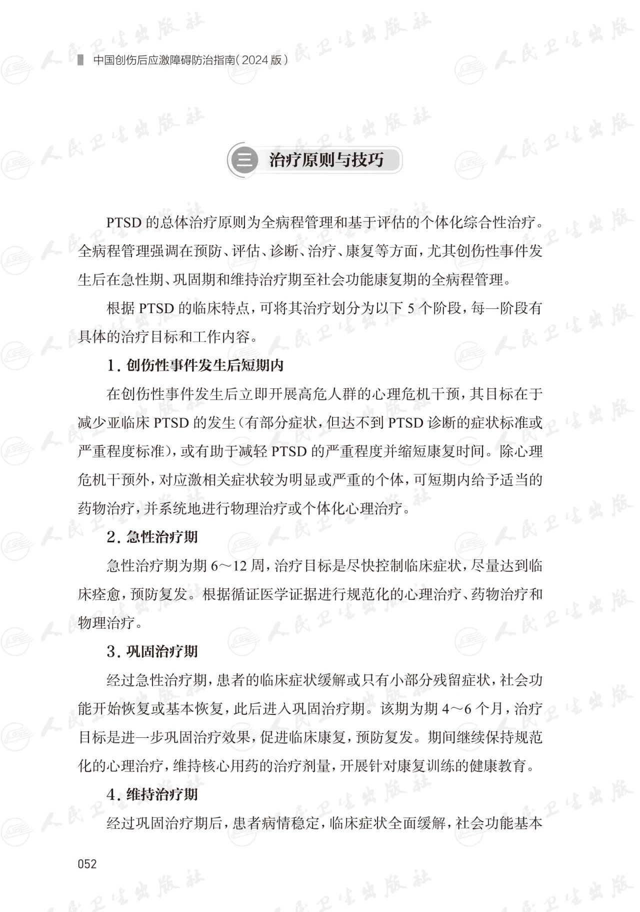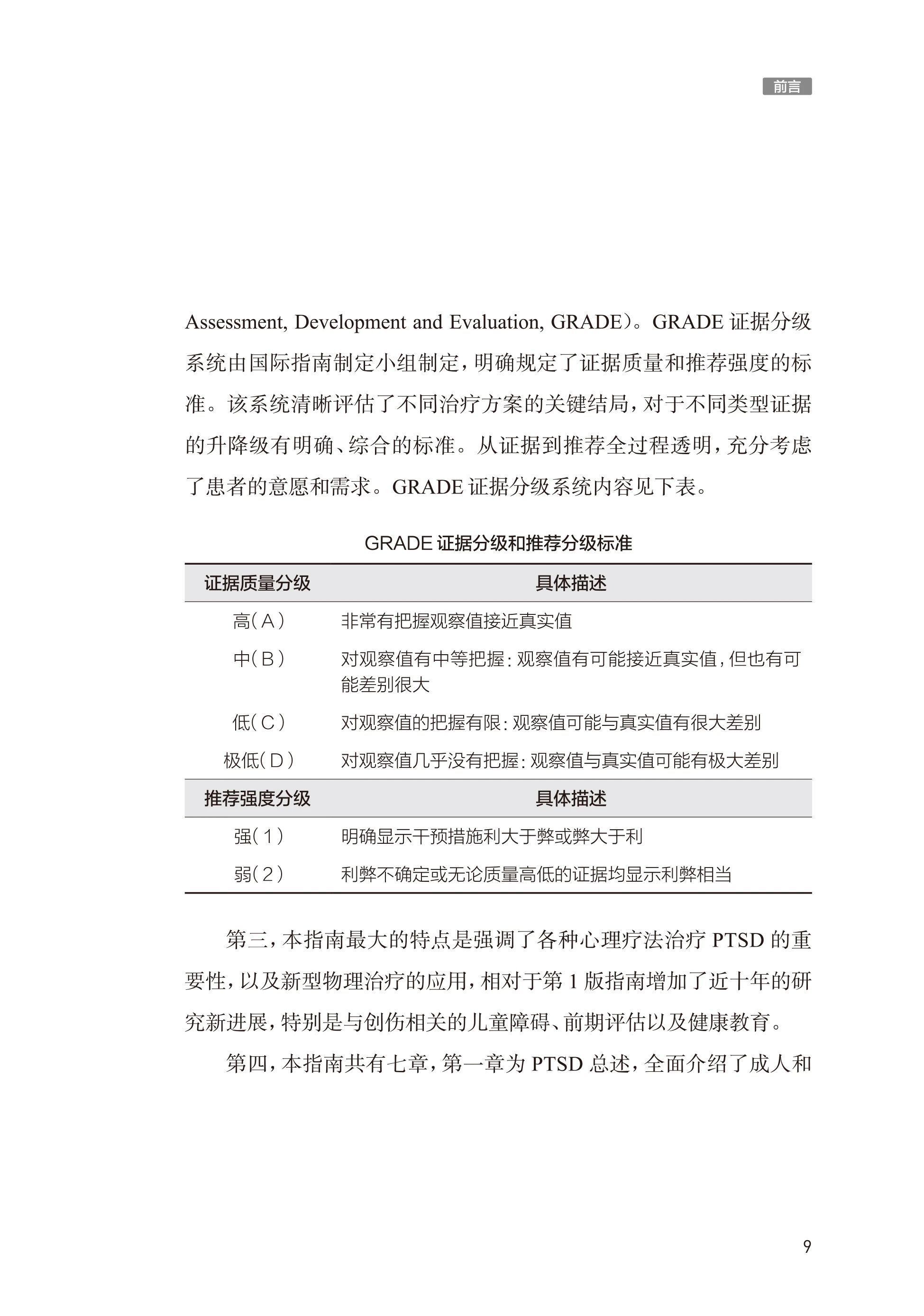 《中国创伤后应激障碍防治指南(2024版)》本着传承和创新的精神,组建了由精神病学专家、心理学专家、循证医学专家组成的指南制订团队,严格遵照循证医学规则,采用以证据水平和推荐强度标准提出推荐意见的方法,为药物、心理和物理疗法提供了循证医学的基础证据,并将近年来国内外的最新研究成果与我国的具体国情和实践相结合,在着重介绍诊治等相关内容的同时,也重点介绍了预防和康复等重要理念及方法。本指南可读性及操作性强,可为一线临床医生和科研工作者提供实践指导和参考依据,也可为政府相关决策者、社区工作者提供专业的指导意见和工作规范。