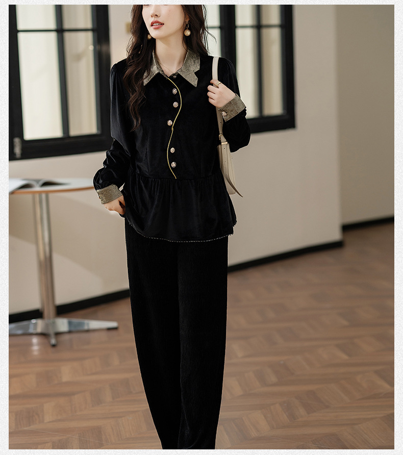 AHM msdm2801时尚优雅丝绒拼接纽扣小衫翻领上衣 商品图0