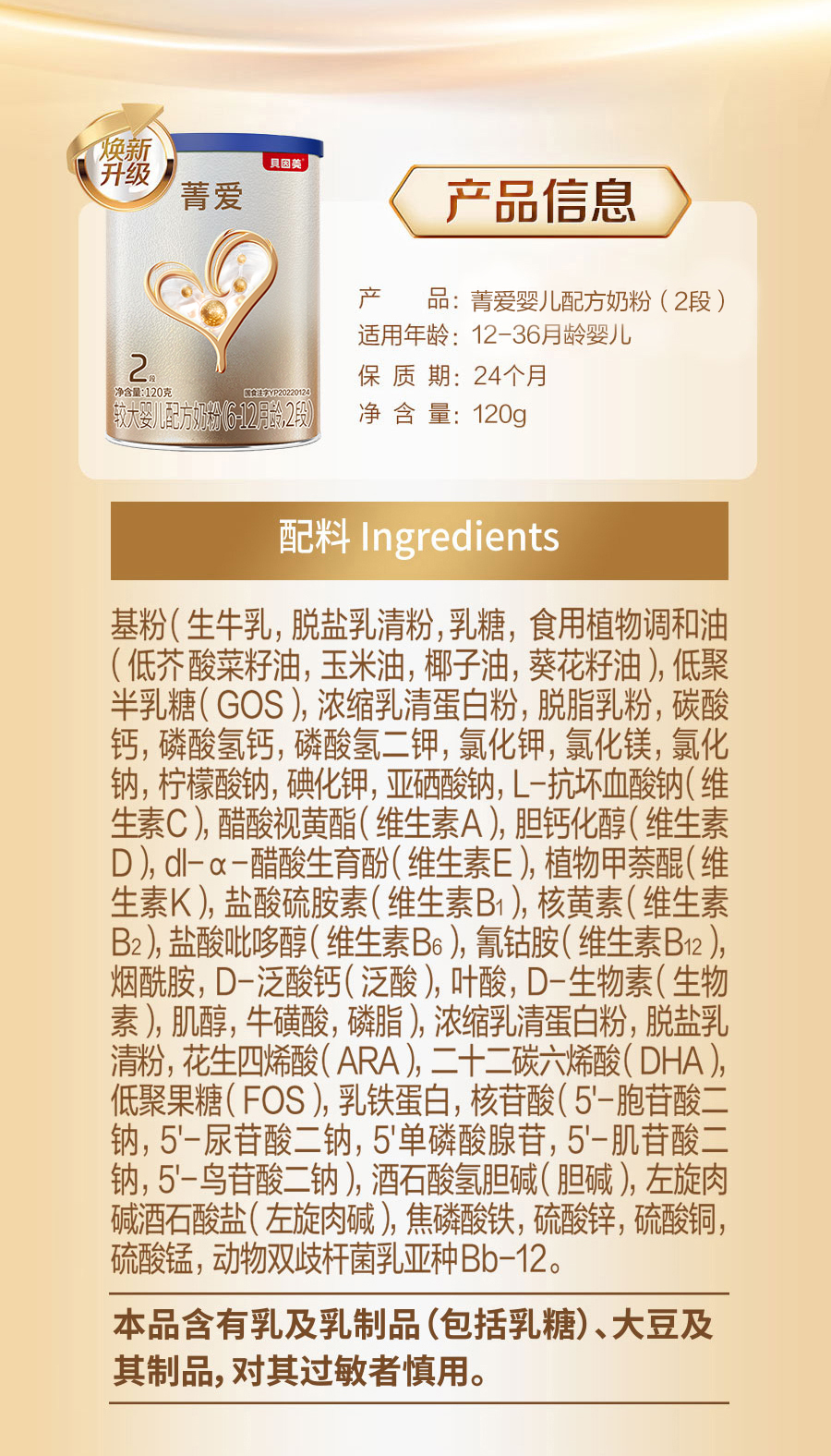 【贝因美】菁爱A2奶源2段奶粉乳铁蛋白120g新客试用