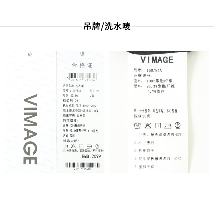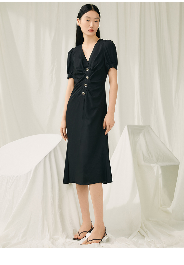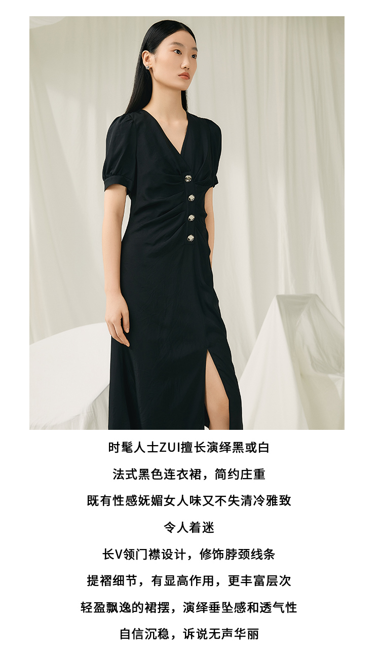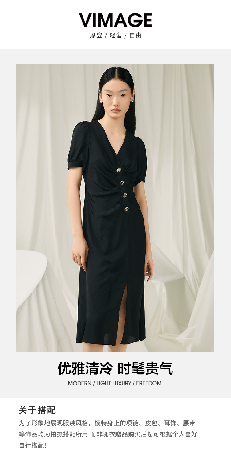 VIMAGE纬漫纪夏季新款V领高腰时尚显瘦百褶泡泡袖裙摆开叉连衣裙V1907535