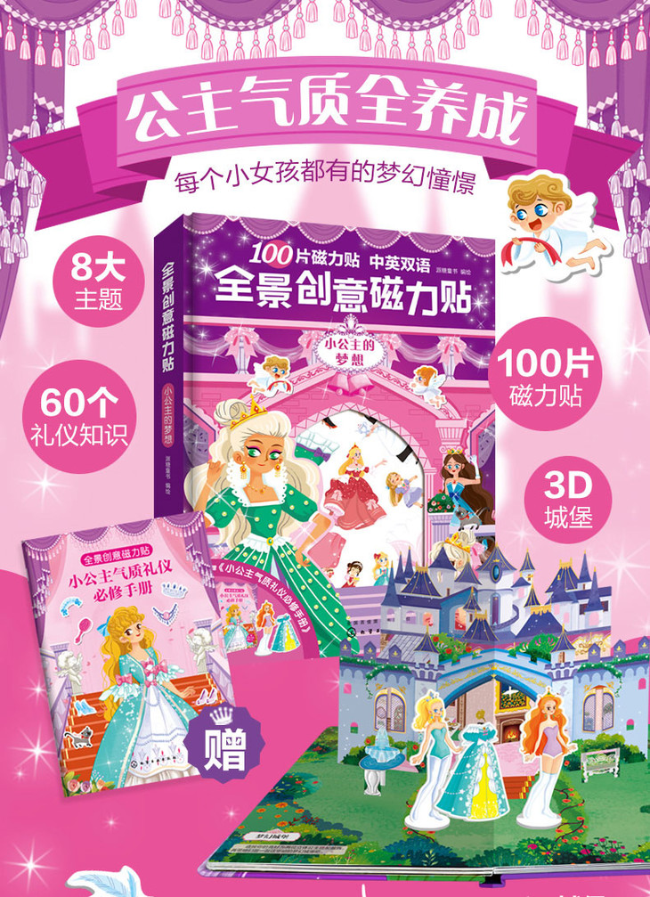 每个女孩都有一个公主梦,每位父母都像呵护公主一样呵护自己的女儿。这本《全景创意磁力贴·小公主的梦想》专为3—12岁女孩打造,孩子可在8大主题场景中,用100片磁力贴片,贴人物、讲故事、贴衣服、贴饰品,还可在华丽的3D立体城堡中畅游。不仅体验梦想的公主生活,还能学习气质礼仪、进餐礼仪、舞会礼仪、服装知识、文化知识等超值内容。超100个中英双语单词,能玩能学。更有贴心收纳袋,让孩子养成好习惯,妈妈更省心。精装大开本,送礼自用都适宜。