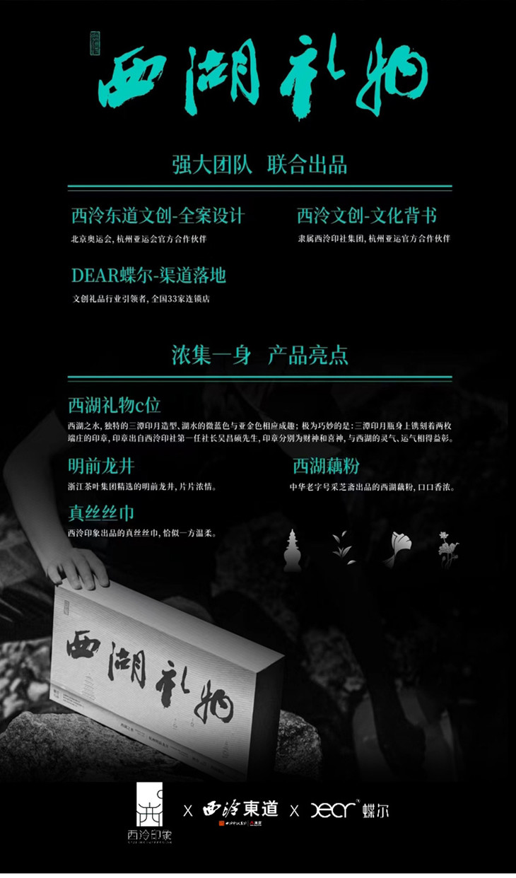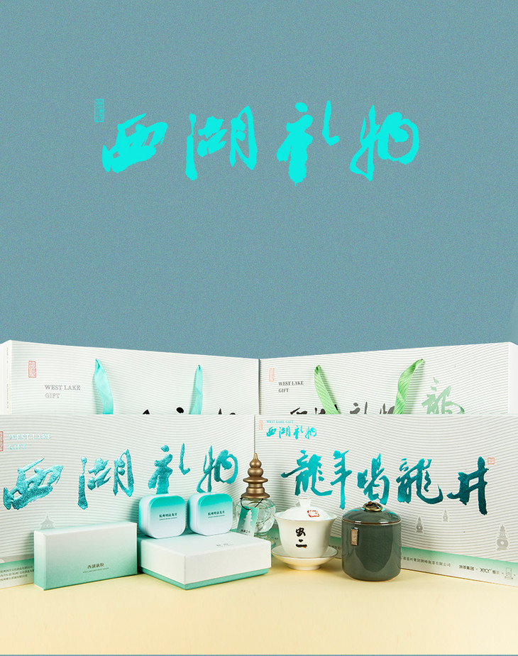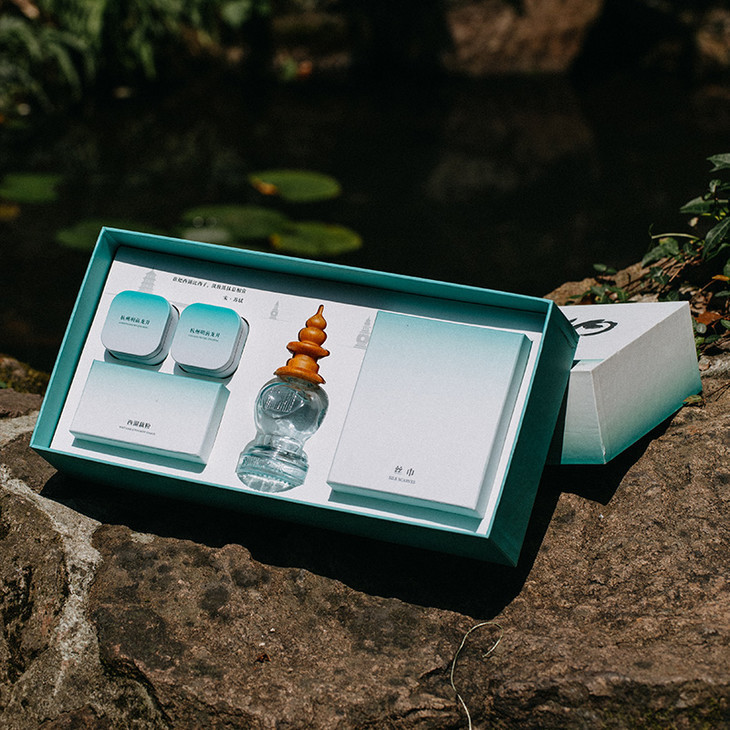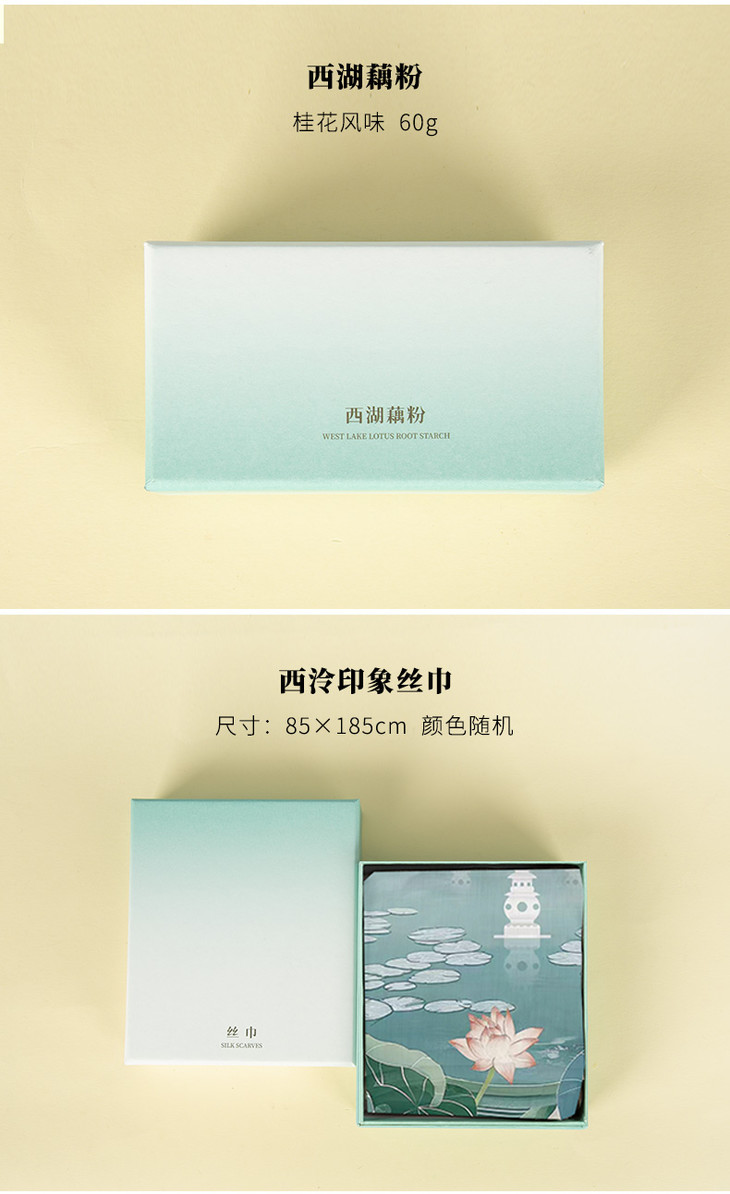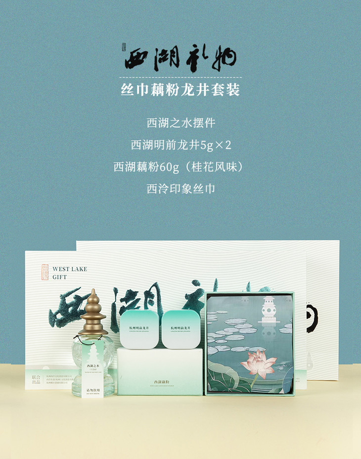 由西湖之水、明前龙井、西湖藕粉、真丝丝巾组成,将人文、地理、美食、美景浓集一身,龙井、藕粉、丝绸、西湖水相映成趣。