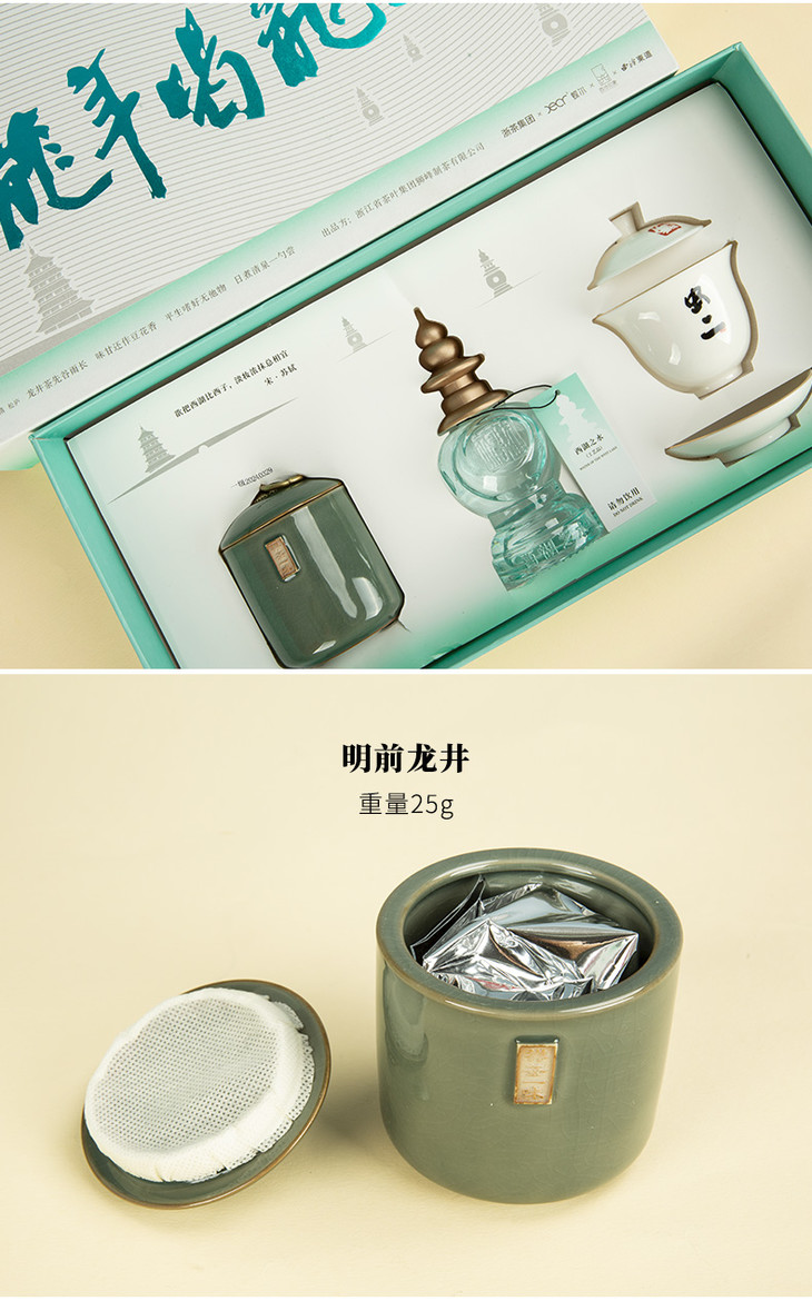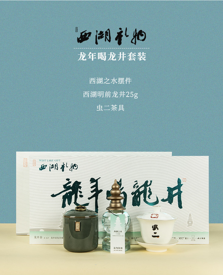 2023年的升级版,保留了西湖之水、明前龙井,增加了虫二盖碗、青瓷茶叶罐,有请“龙年喝龙井”哦。