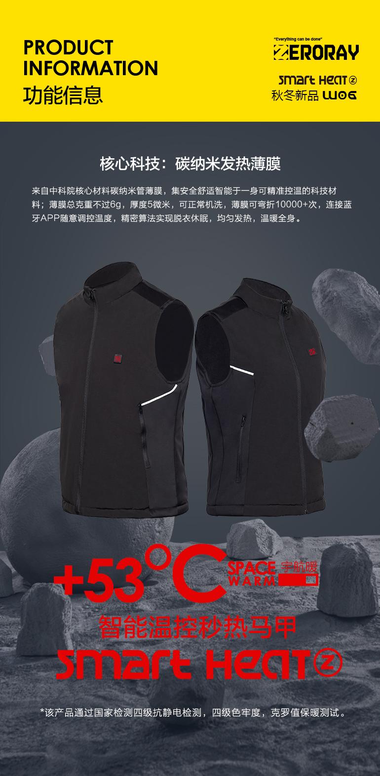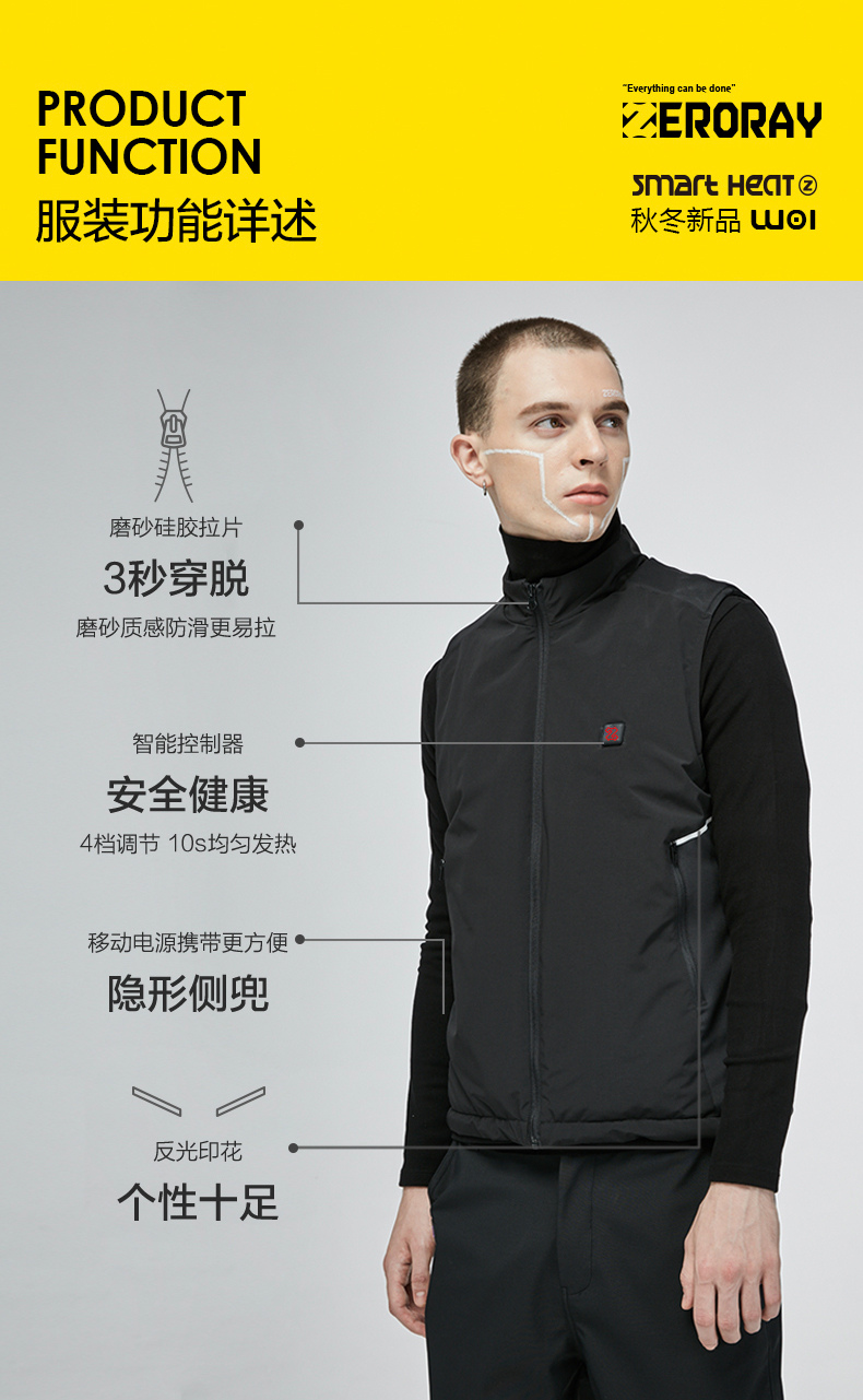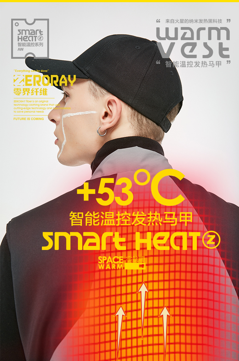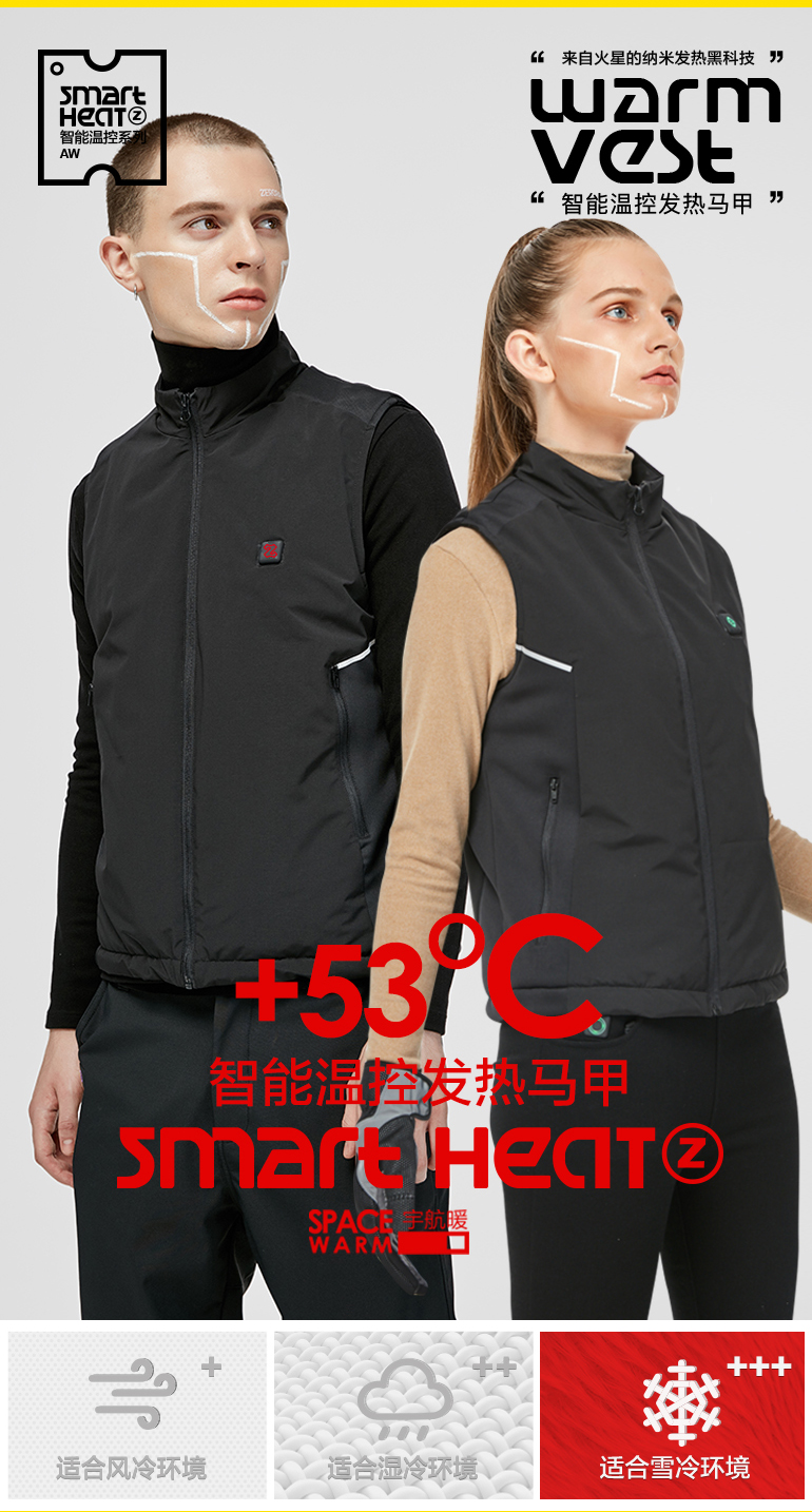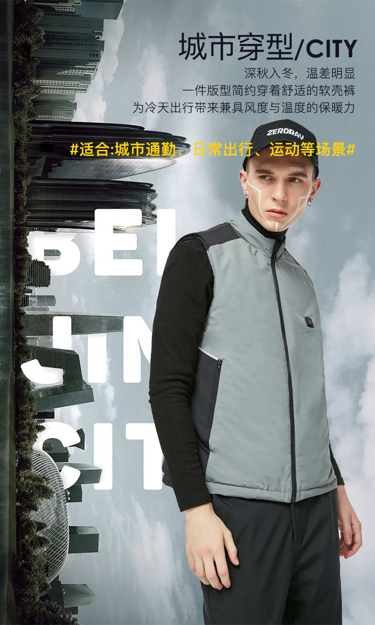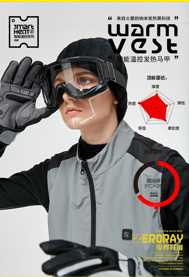 ZERORAY发热马甲电加热背心无袖立领黑灰色智能温控男女同款保暖