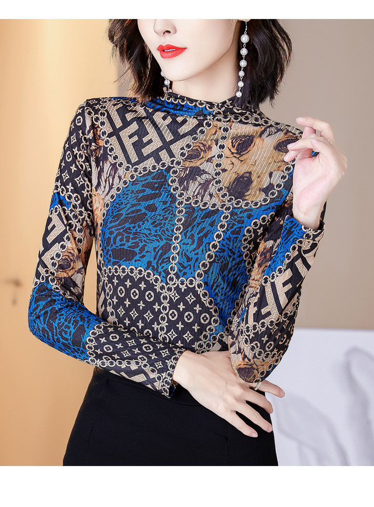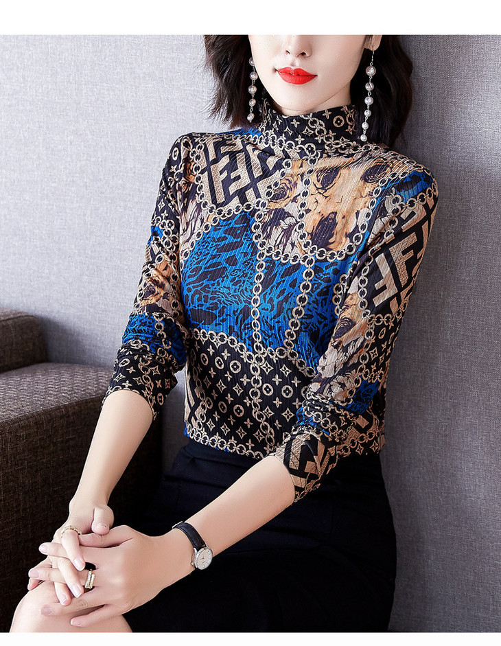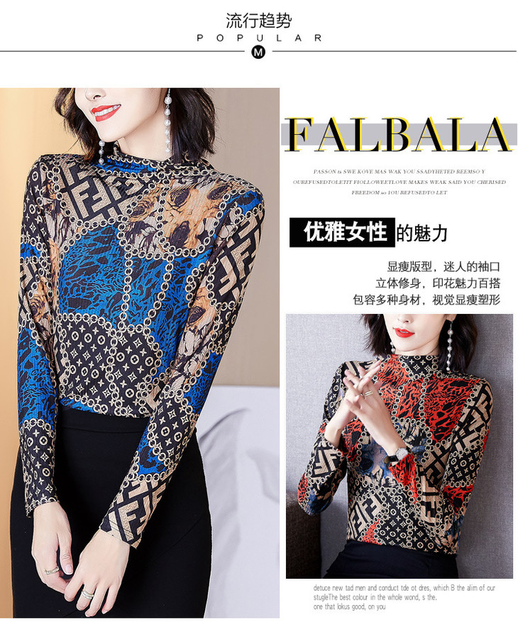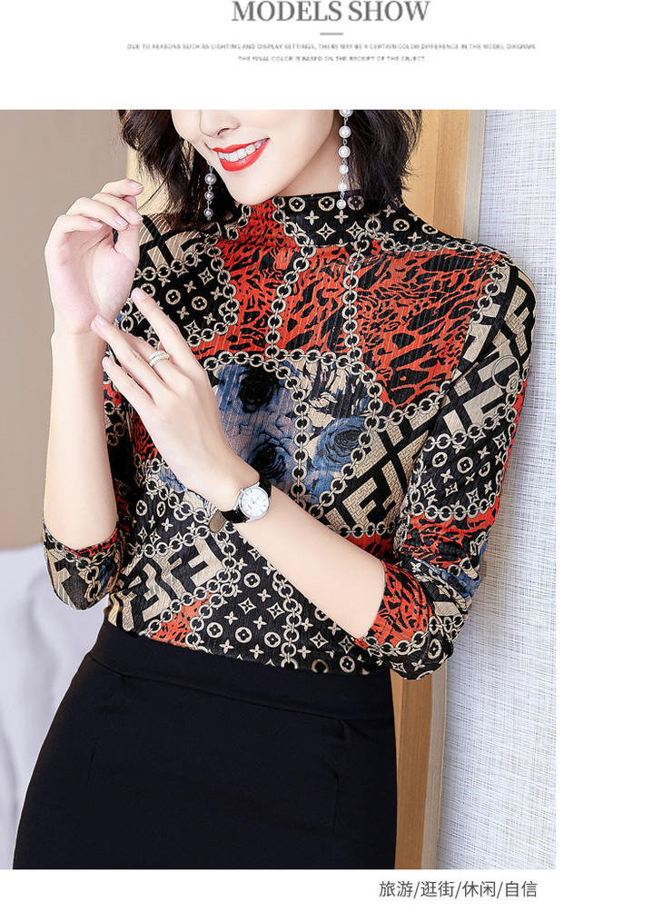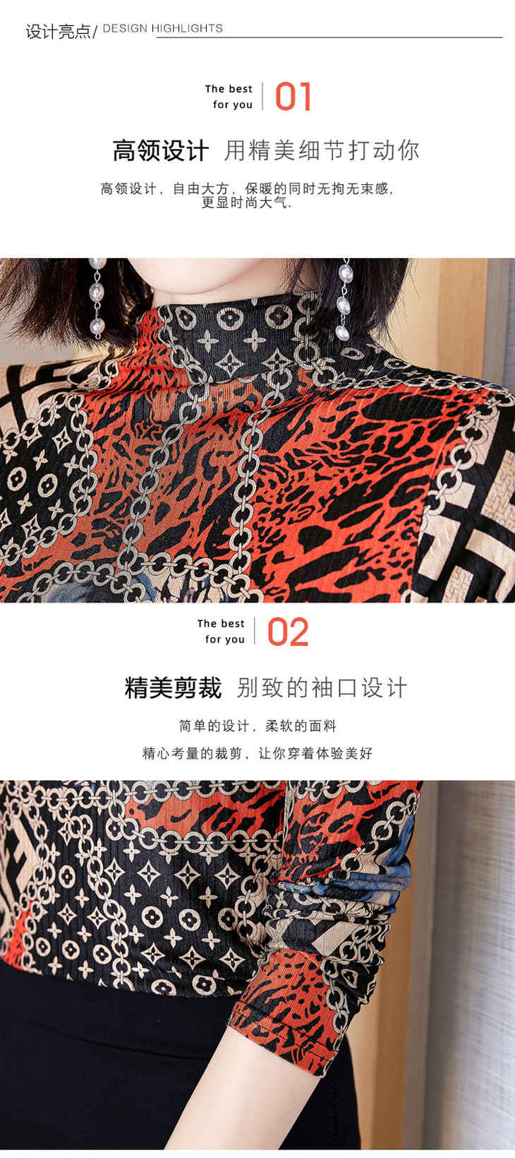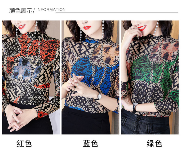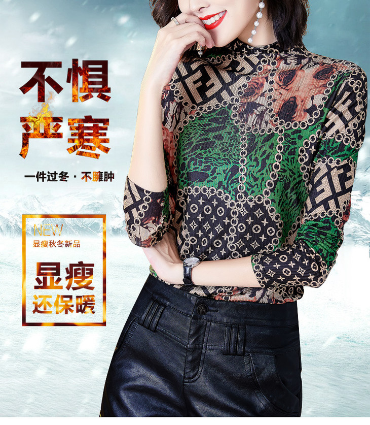 MZ-MZ7162秋冬季新款高领印花网纱加绒打底衫