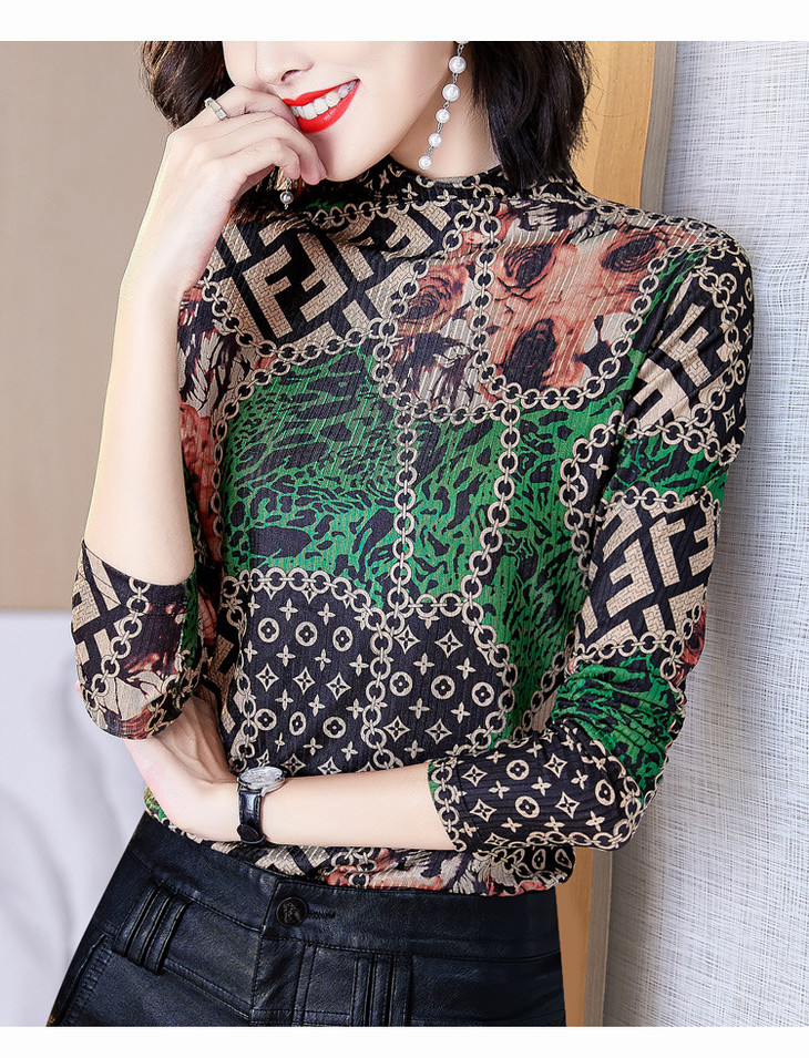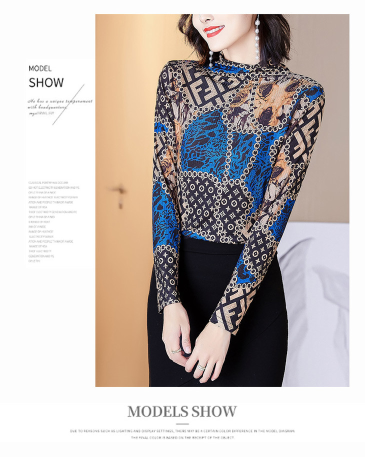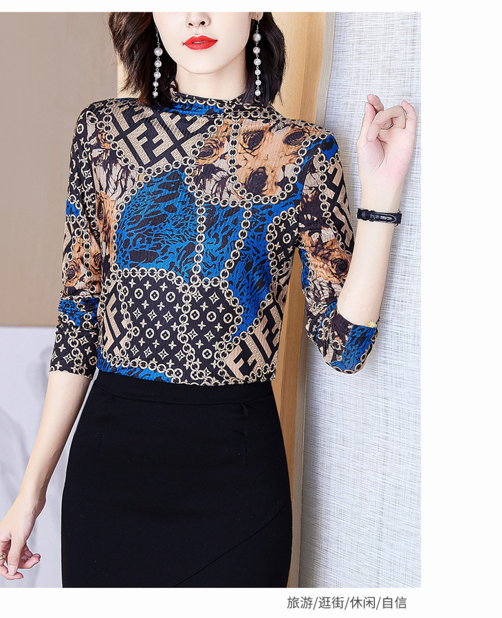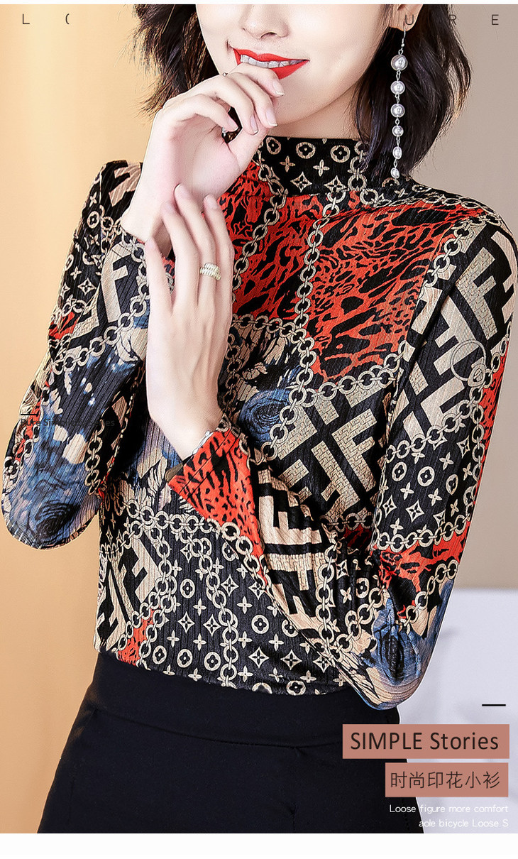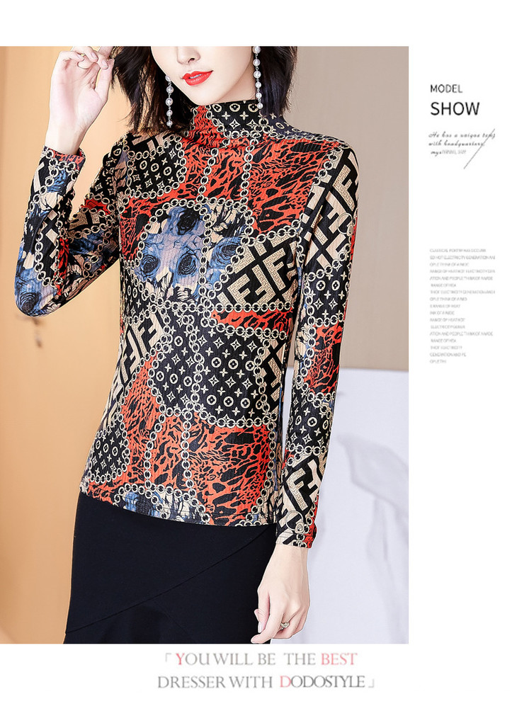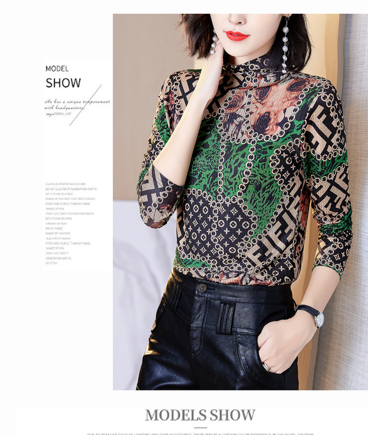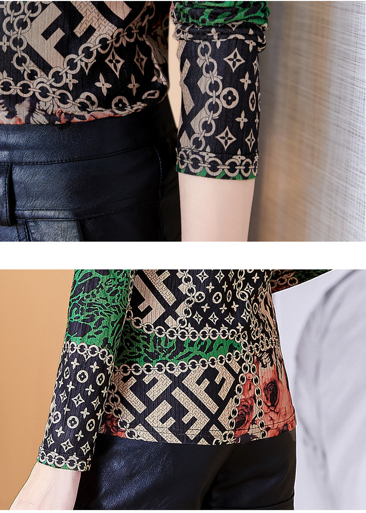MZ-MZ7162秋冬季新款高领印花网纱加绒打底衫