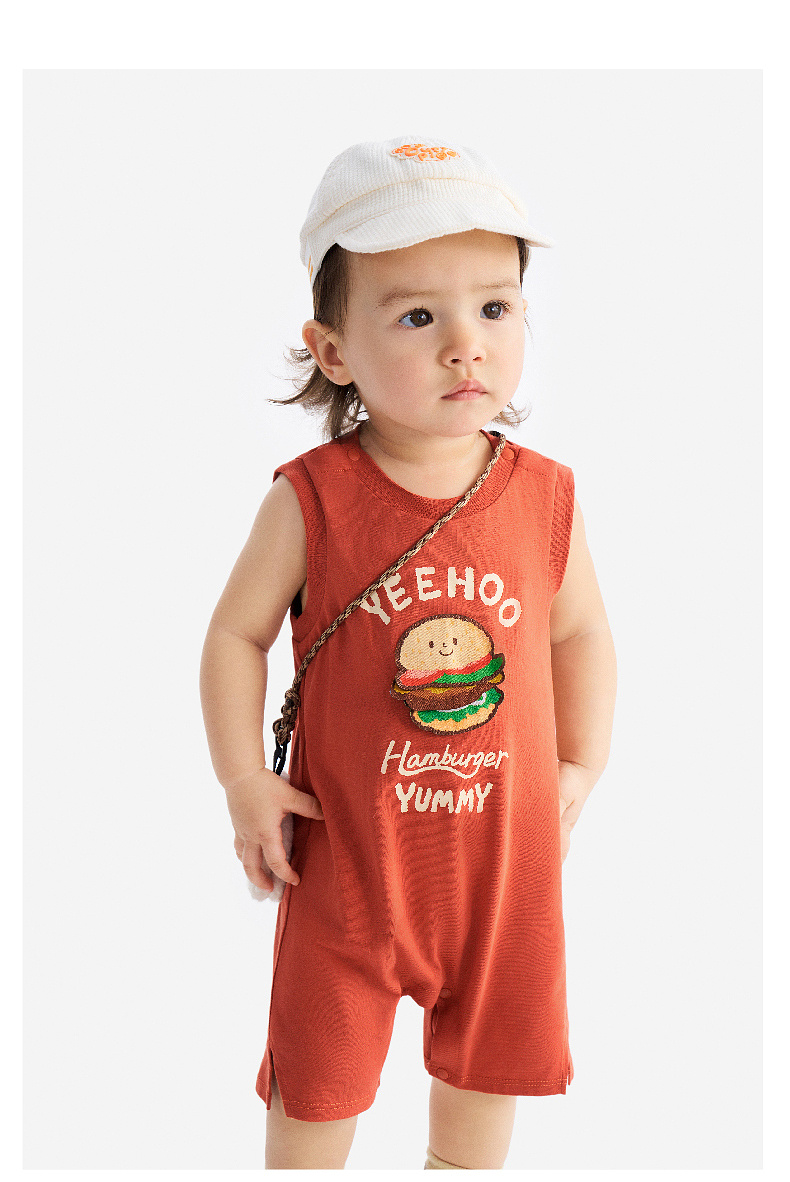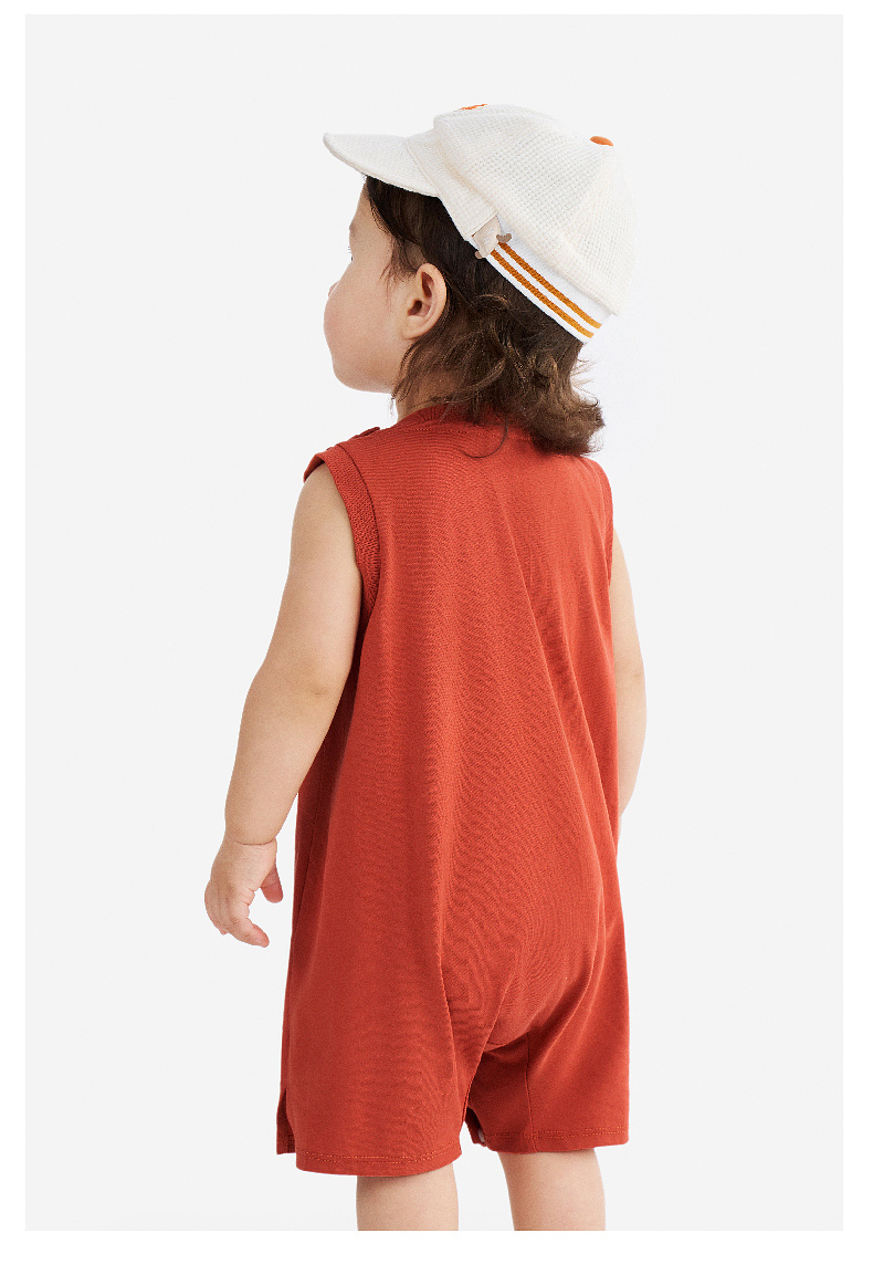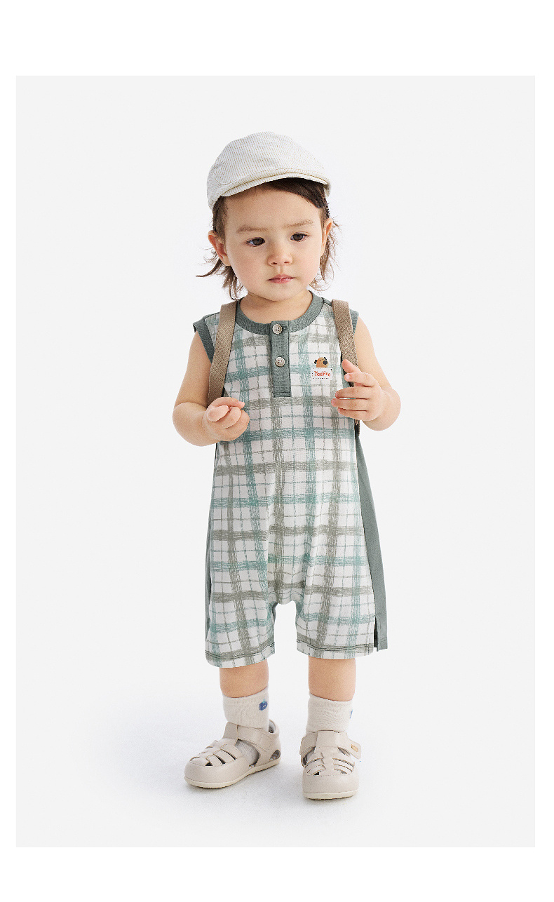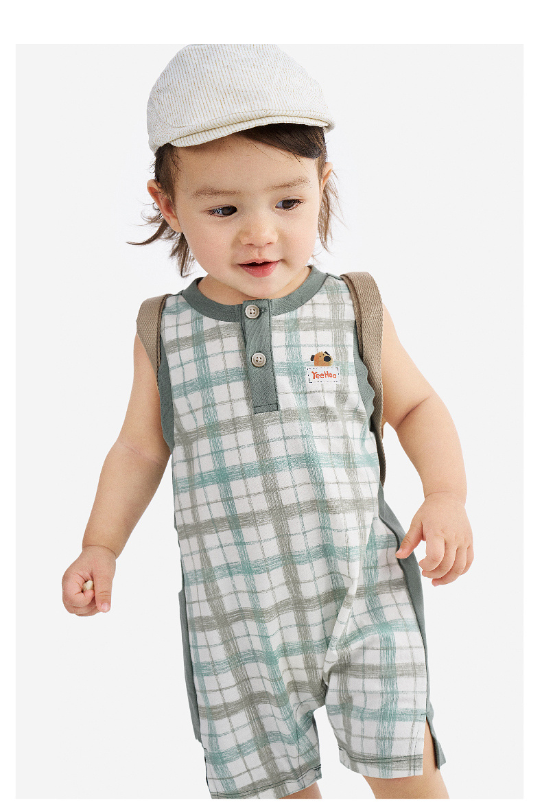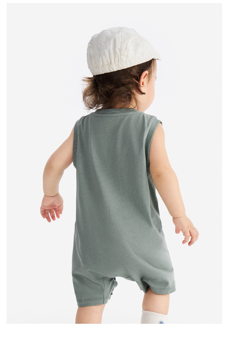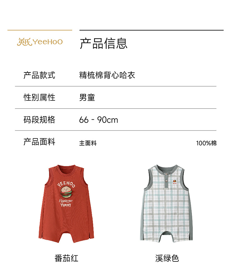 【100%精梳棉】英氏婴儿衣服夏季男宝宝背心条纹纯棉连体衣薄款男童户外卡通哈衣