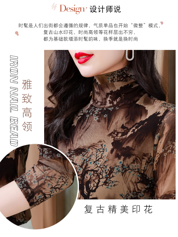KQL 654T9133高领长袖加绒打底衫洋气复古印花T恤