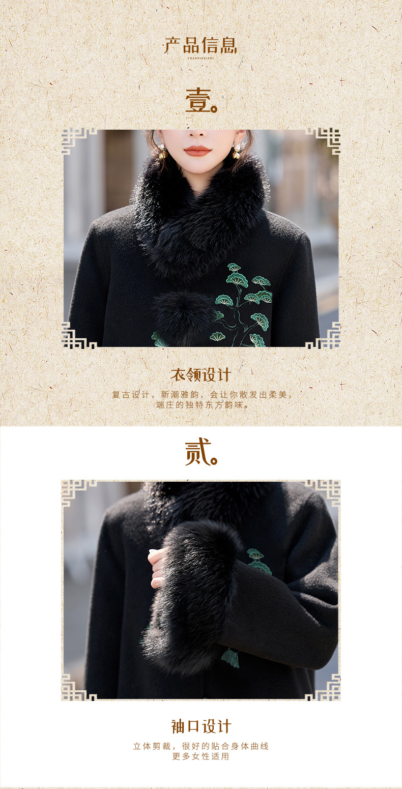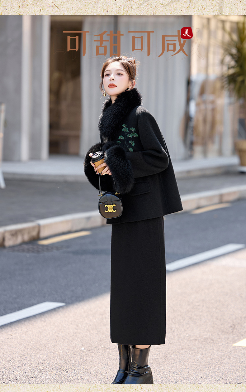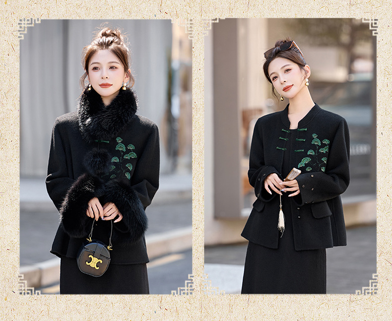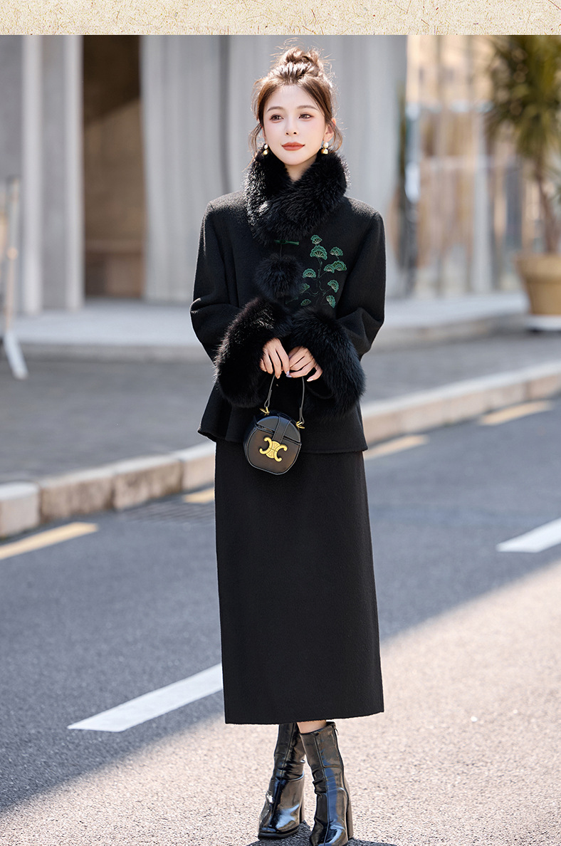 HR ZMFS25917新中式风套装裙气质刺绣立领盘扣呢子外套半身裙两件套 商品图3