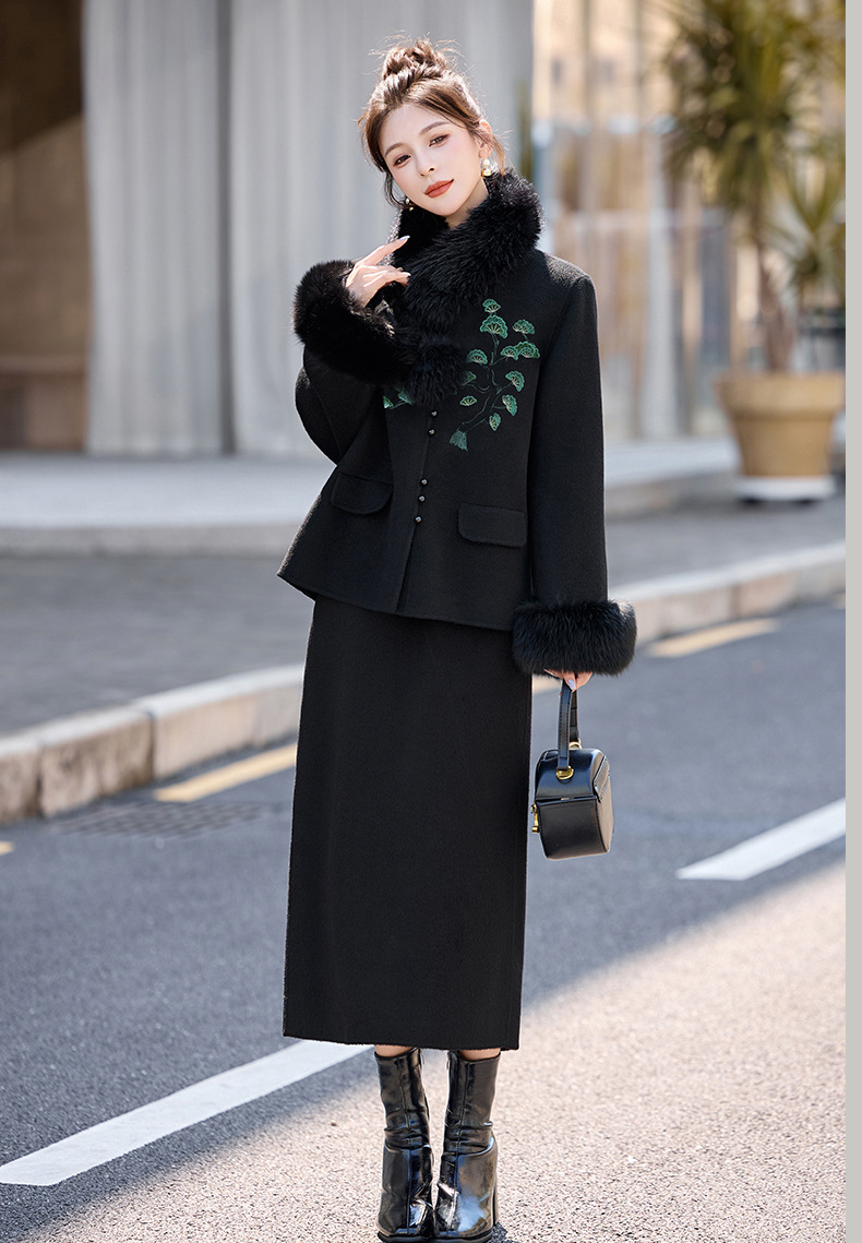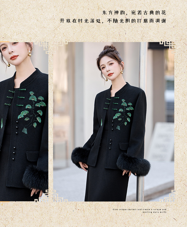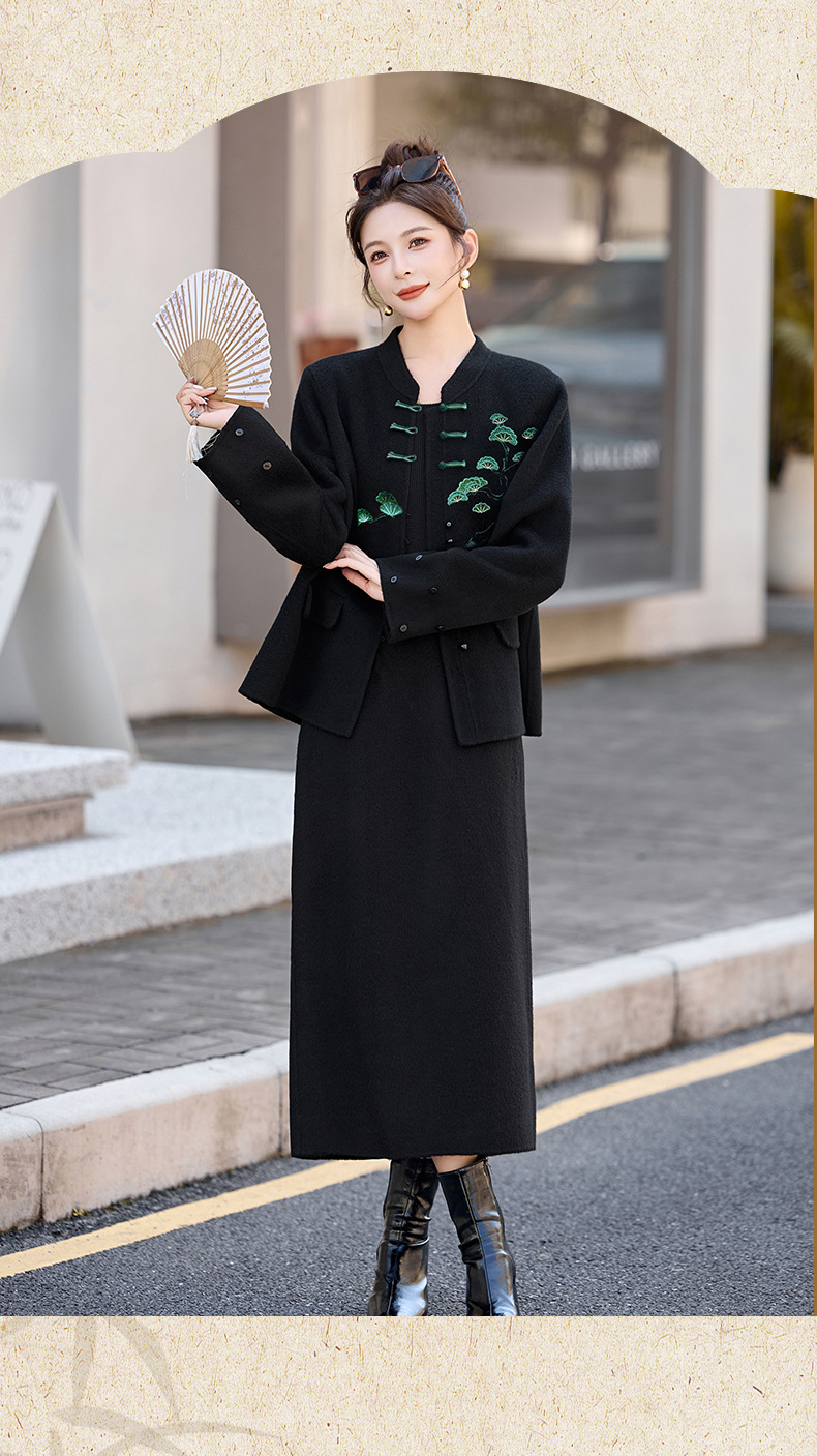HR ZMFS25917新中式风套装裙气质刺绣立领盘扣呢子外套半身裙两件套 商品图0
