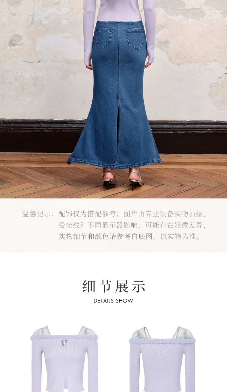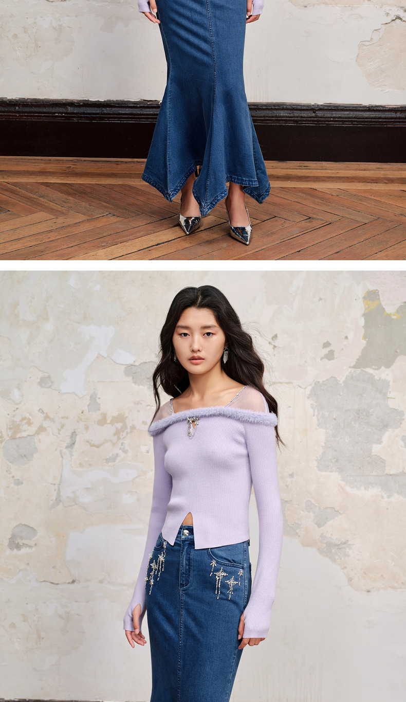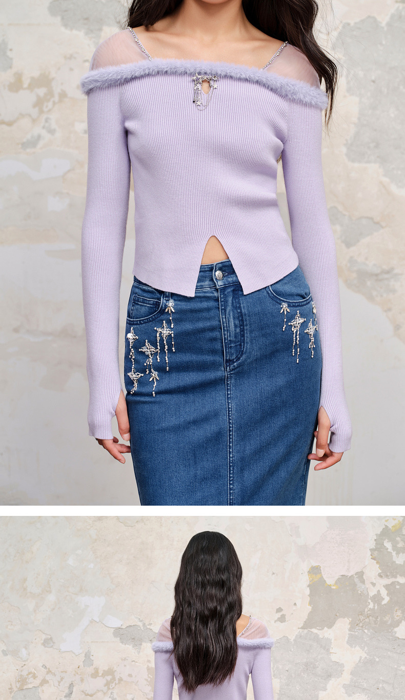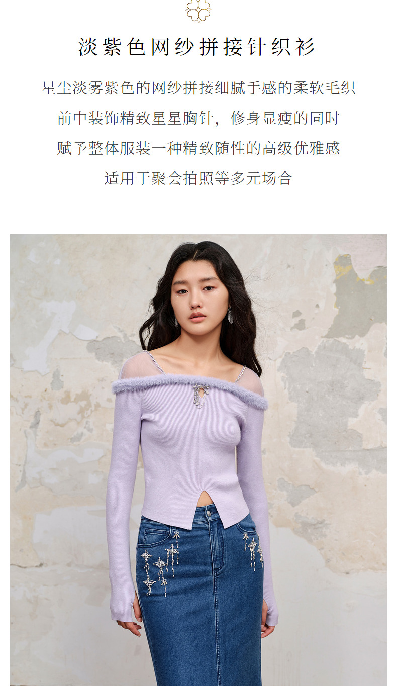 MAXRIENY*浪漫感网纱拼接套头针织修身长袖上衣(货号:MC88SW518)