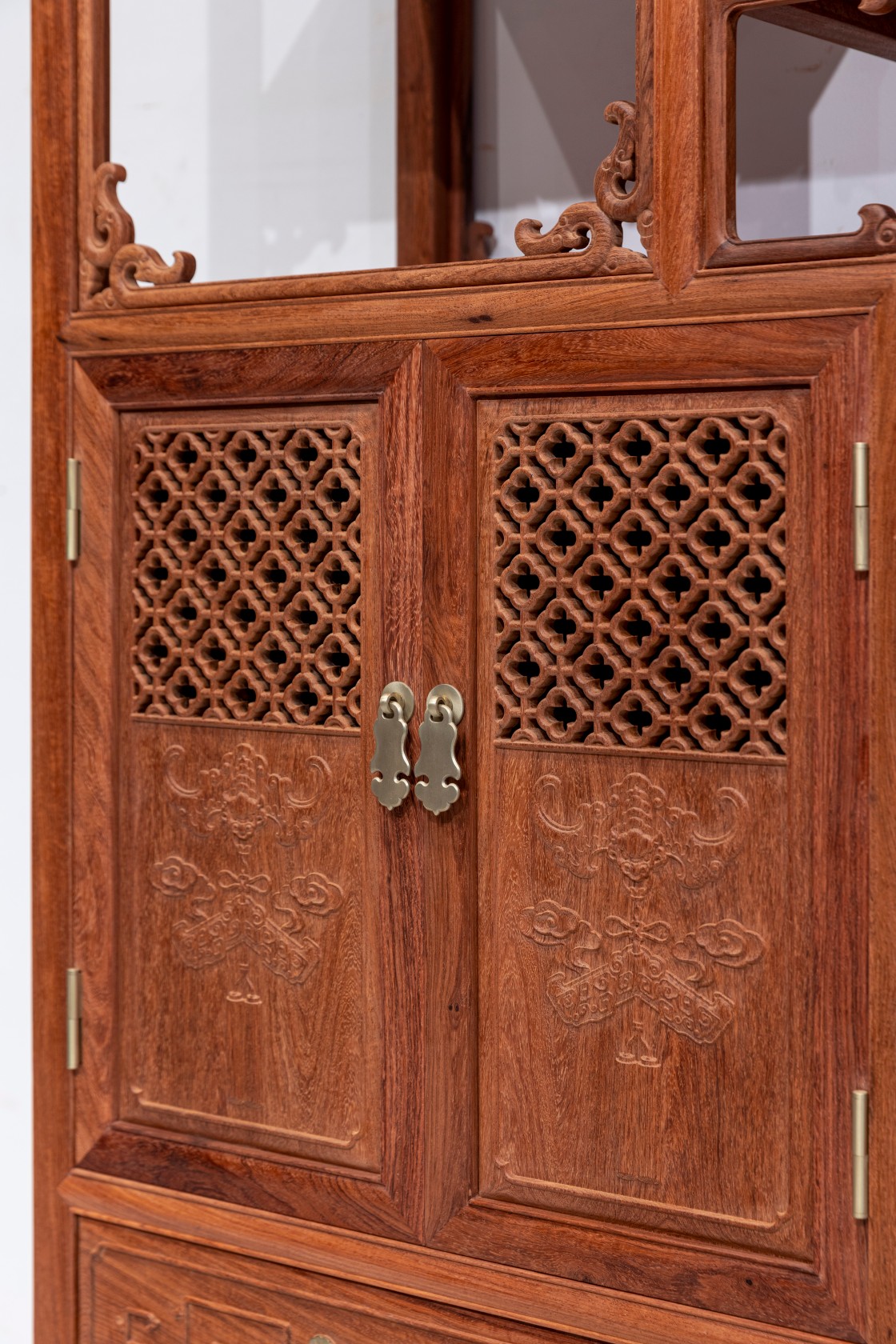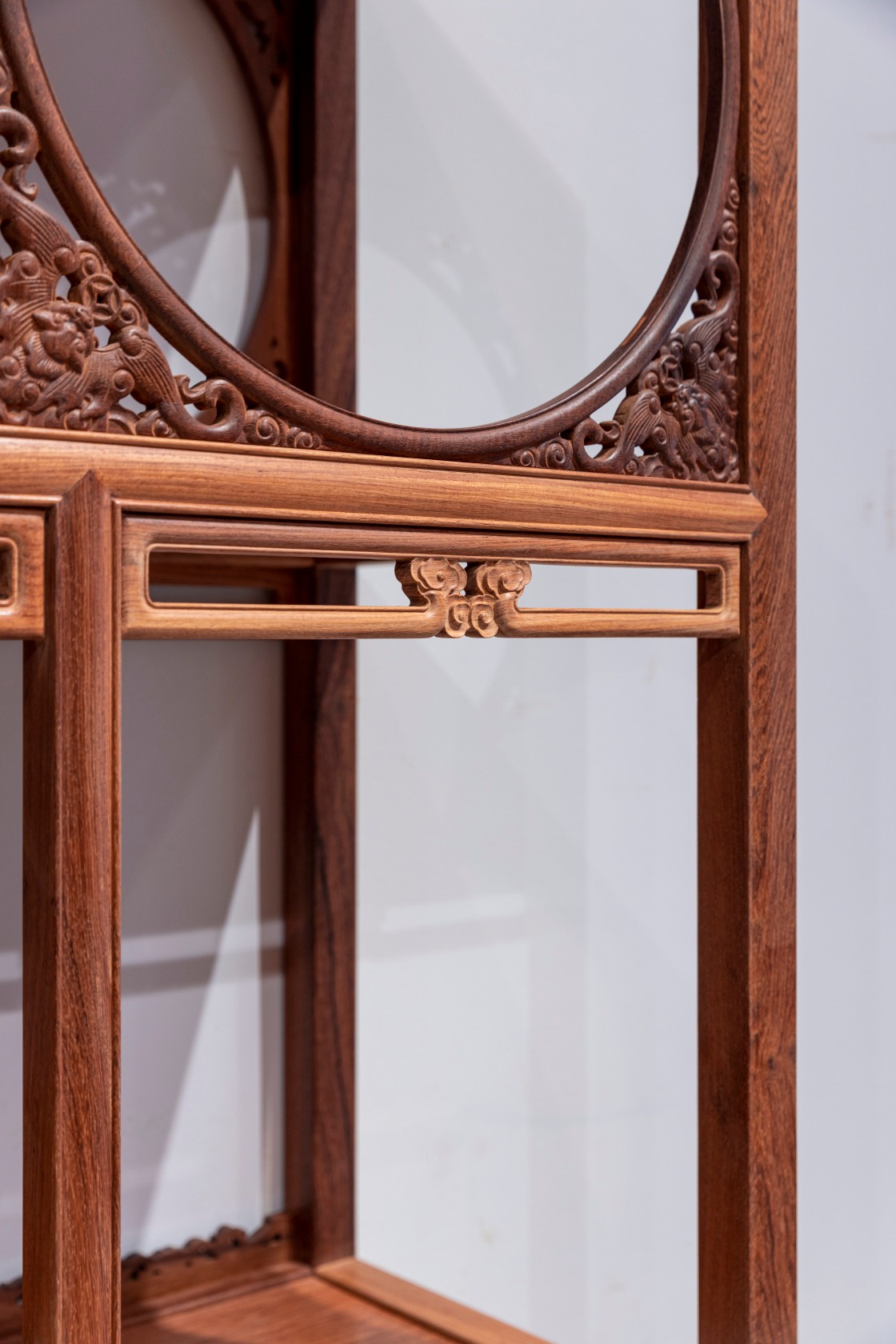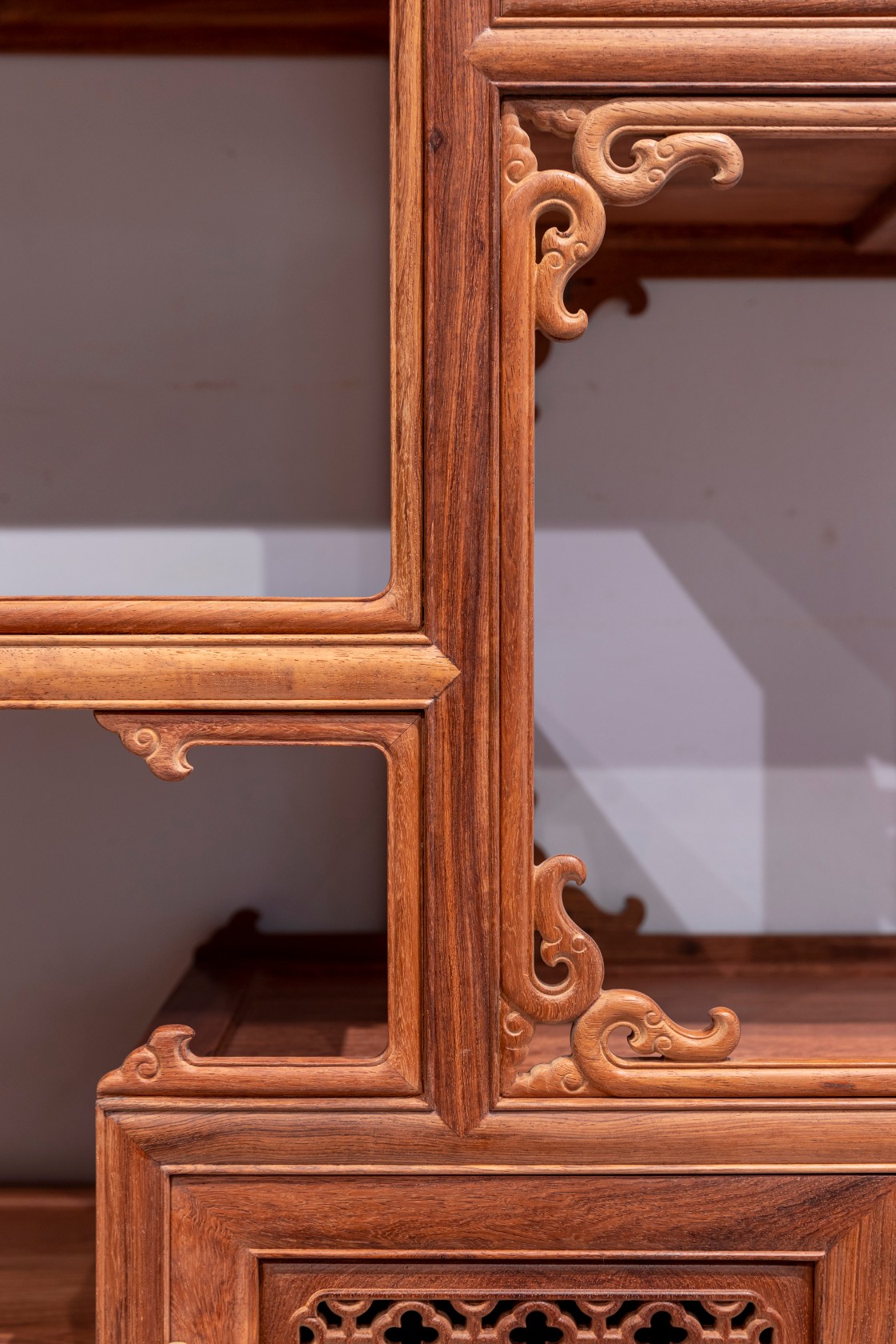 此款博古架简清风格,蝙蝠、磬、祥云、如意纹等寓意十分吉祥,格板或月洞形、或加细边纹饰矮挡板,琳琅可观。