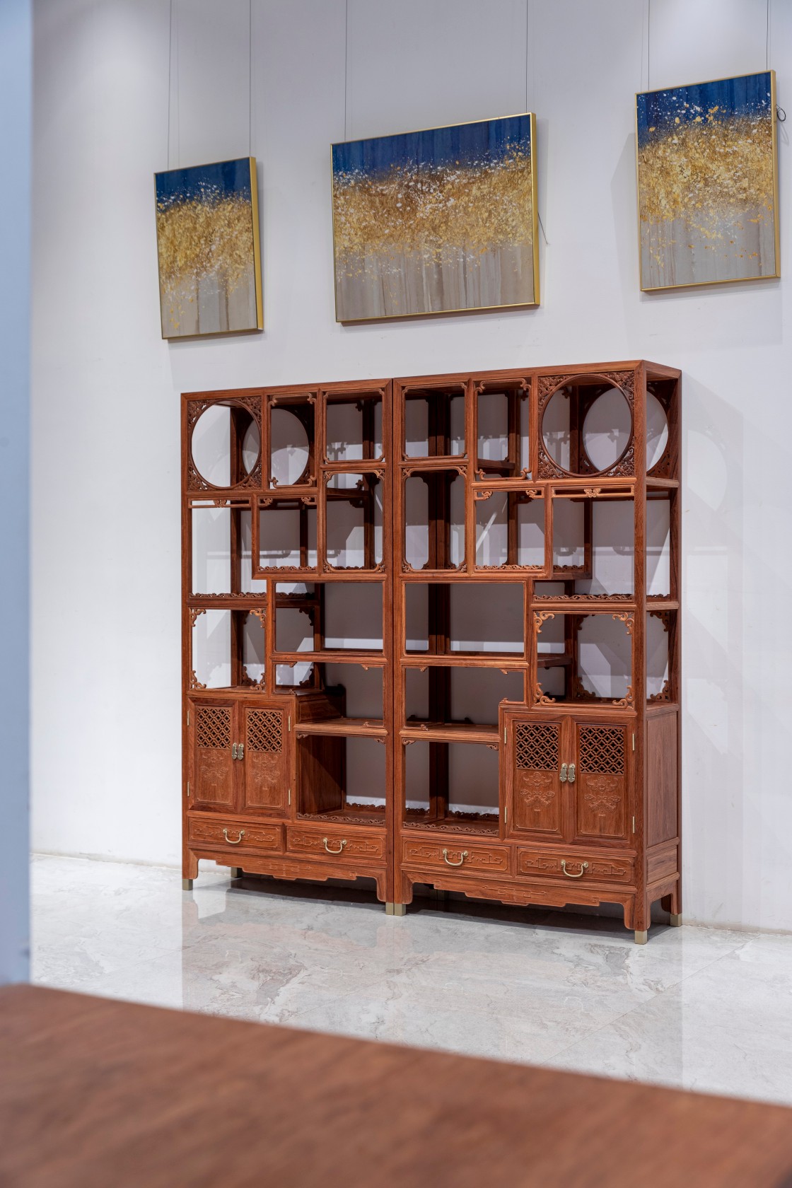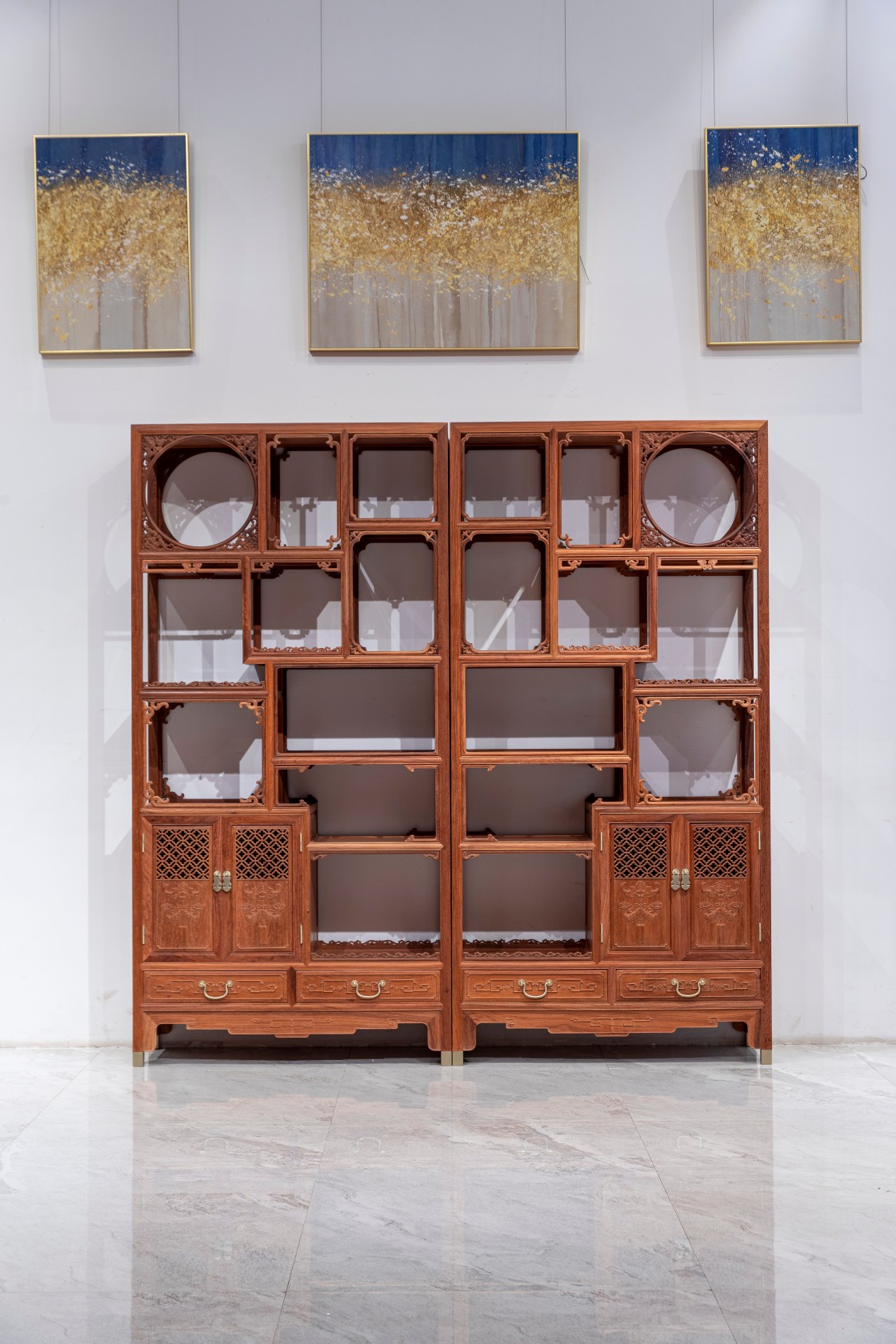 博古架一般成对或成排陈设,兼有空间隔断功能。