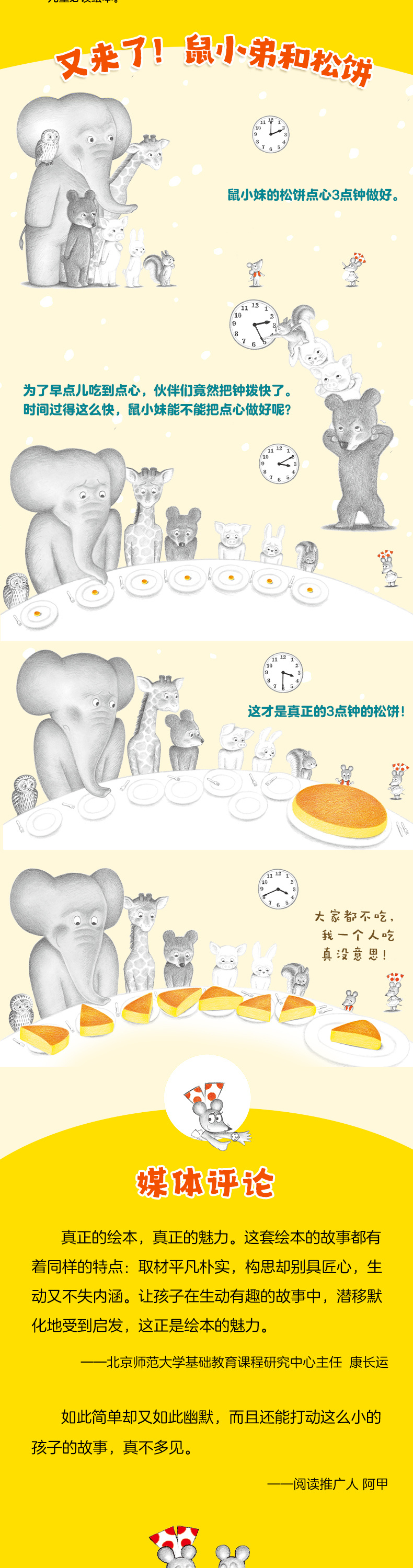 鼠小弟系列绘本的的故事题材没有什么惊天动地的大事件,而是全部来源于日常生活。例如苹果、小背心、松饼等等,都是我们熟悉的事物,这样更容易把孩子带入故事的情境中去。大量留白的画面设计、极其简短的文字,反而更加能够调动孩子们的想象力。——神奈川近代文学馆展览学艺员高桥祐子