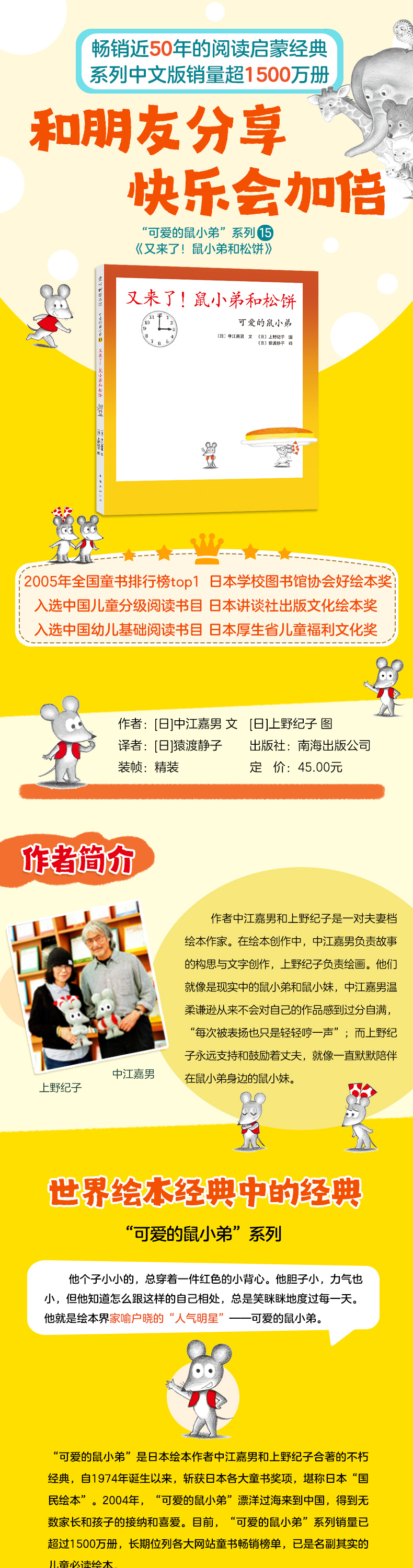 “可爱的鼠小弟”系列是日本绘本作者中江嘉男和上野纪子合著的不朽经典,自1974年诞生以来,斩获日本各大童书奖项——日本学校图书馆协会好绘本奖、日本产经儿童出版文化奖、日本讲谈社出版文化绘本奖、日本厚生省儿童福利文化奖,堪称日本“国民绘本”。