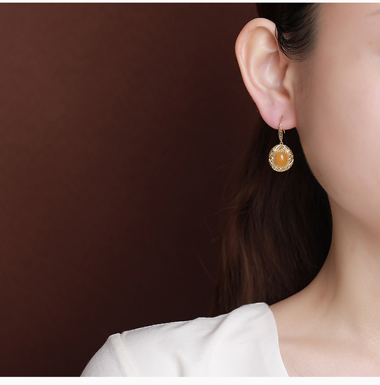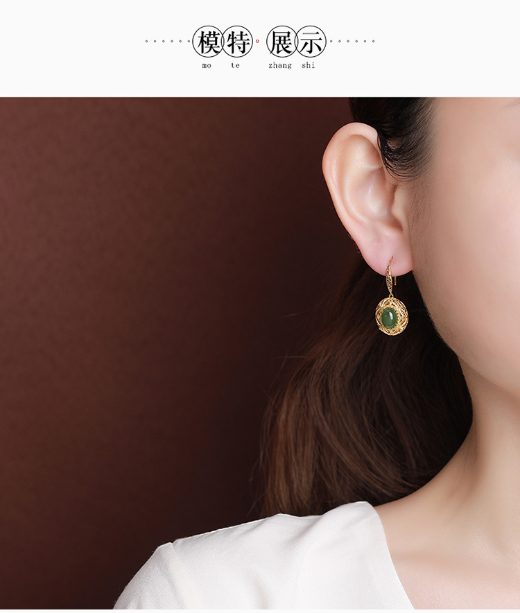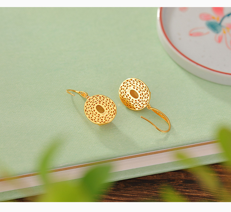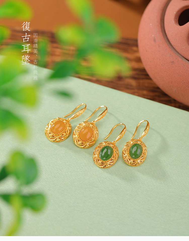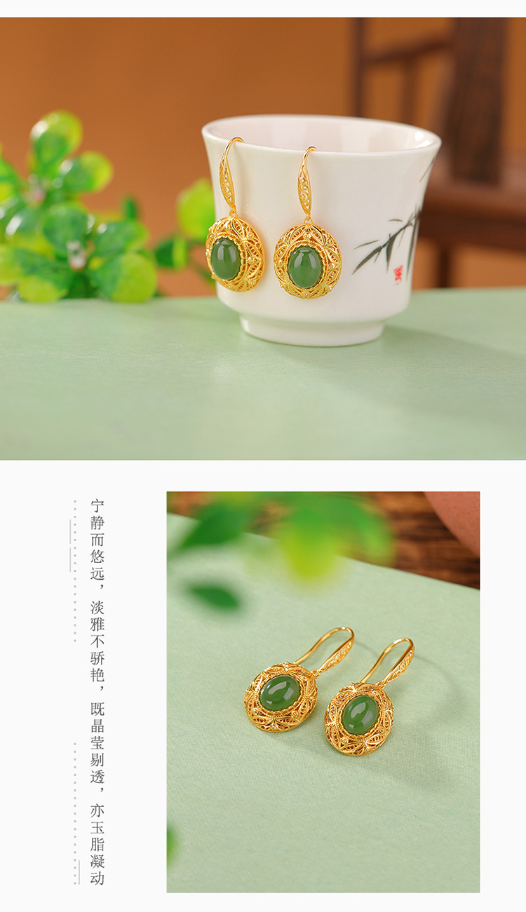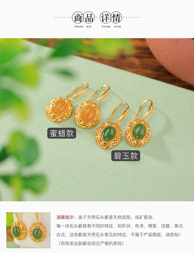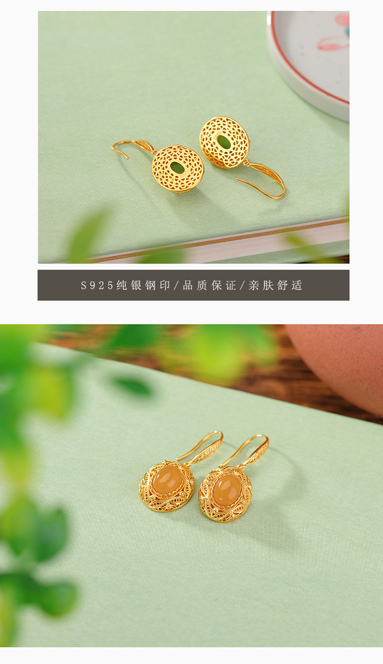 S925纯银镀金和田玉碧玉蜜蜡复古花丝镂空蛋面耳坠CW