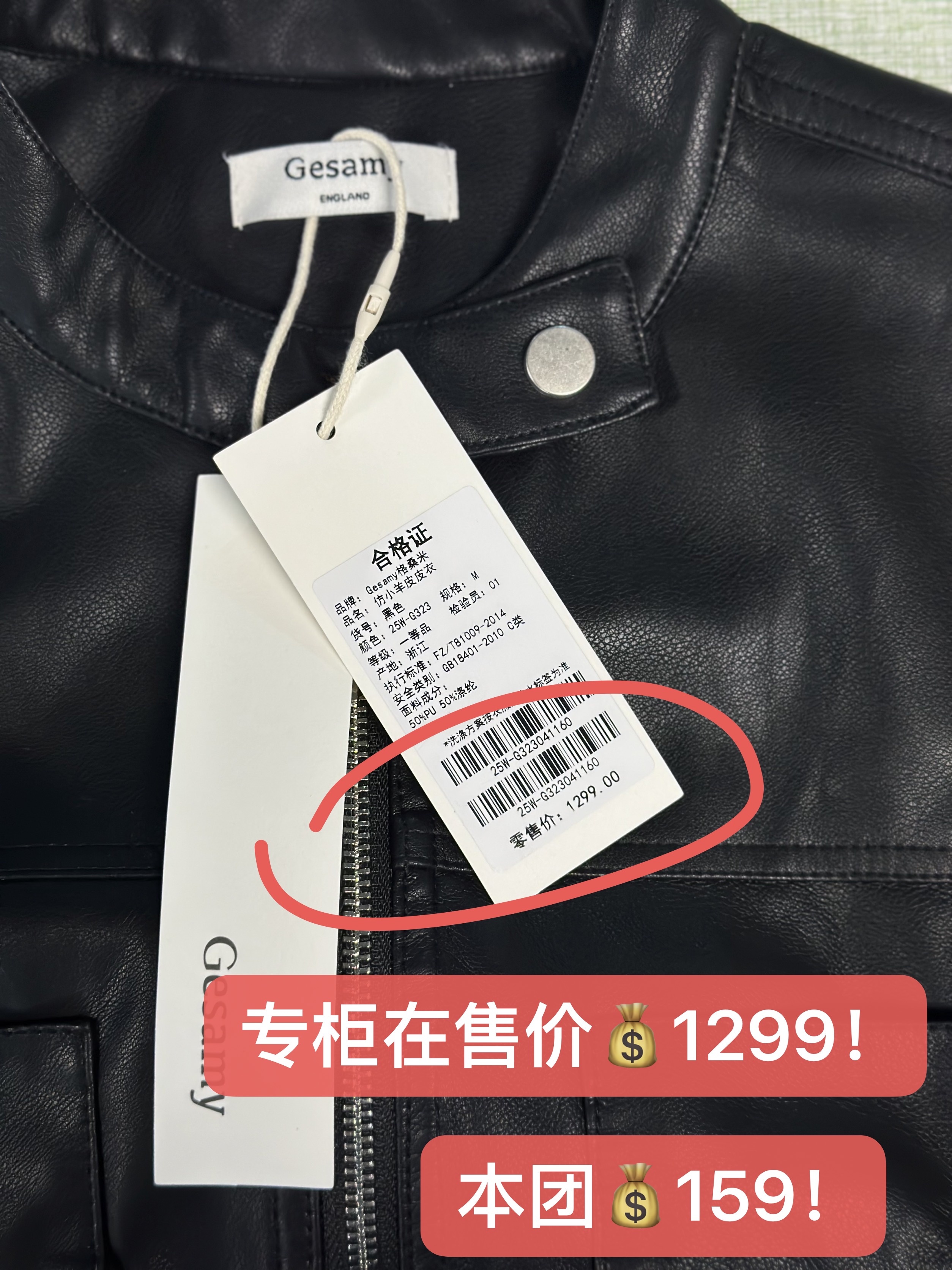 【品名】仿小羊皮皮衣【品牌】Gesamy【吊牌价】1299【开团价】159【颜色】黑色【尺码】M-L【面料成分】外层:50%PU 50%涤纶 里层:100%聚酯纤维