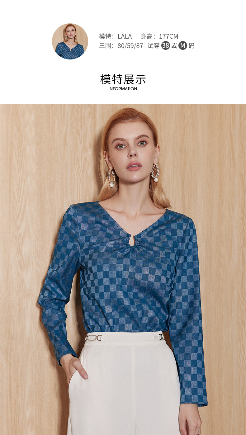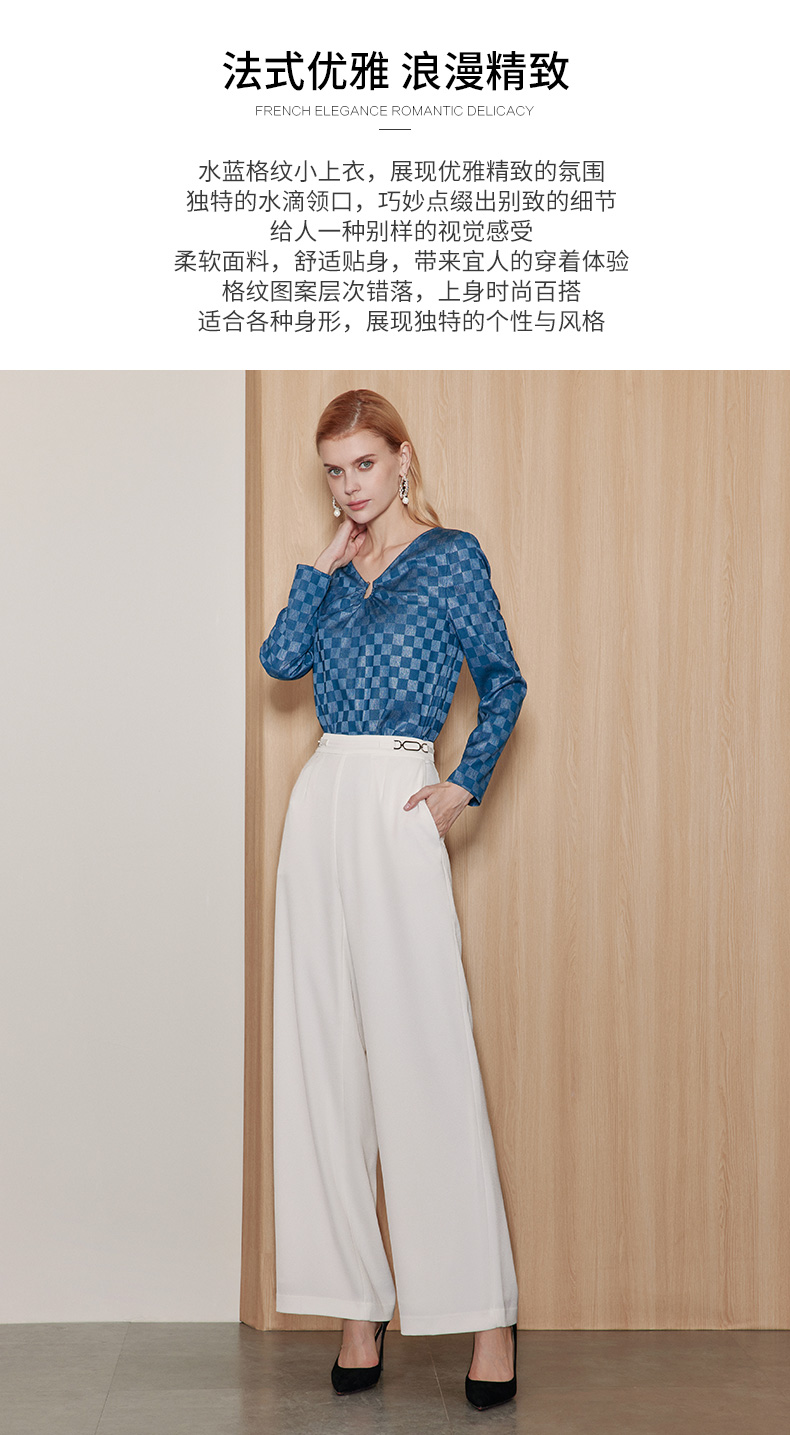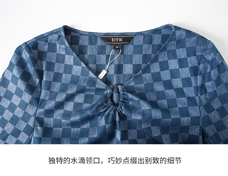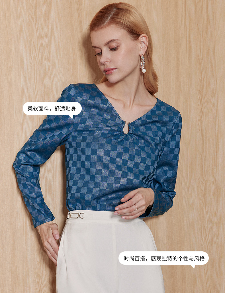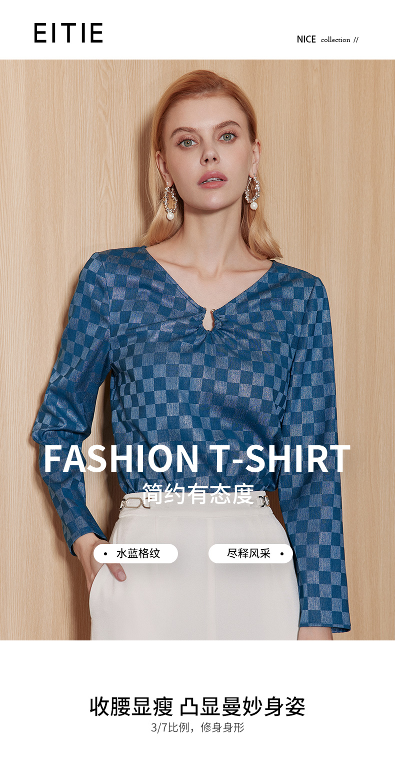EITIE爱特爱气质V领时尚蓝色印花高级通勤直筒显瘦上衣秋季新款C2313204