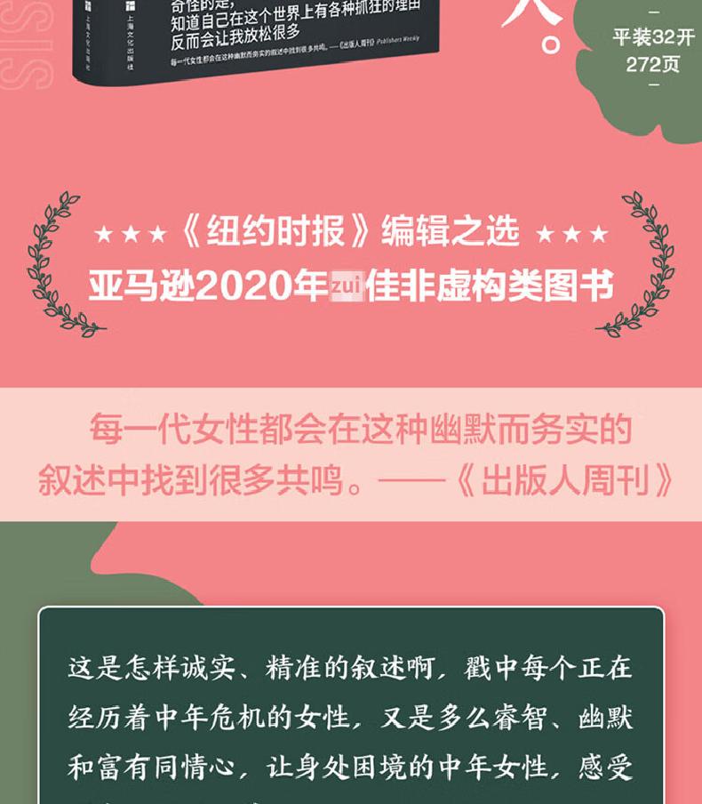 ★《纽约时报》编辑之选,亚马逊2020年佳非虚构类图书 在幽默而务实的叙述中,呈现中年女性的物质、心灵困境,引起广泛共鸣,疏解焦虑。