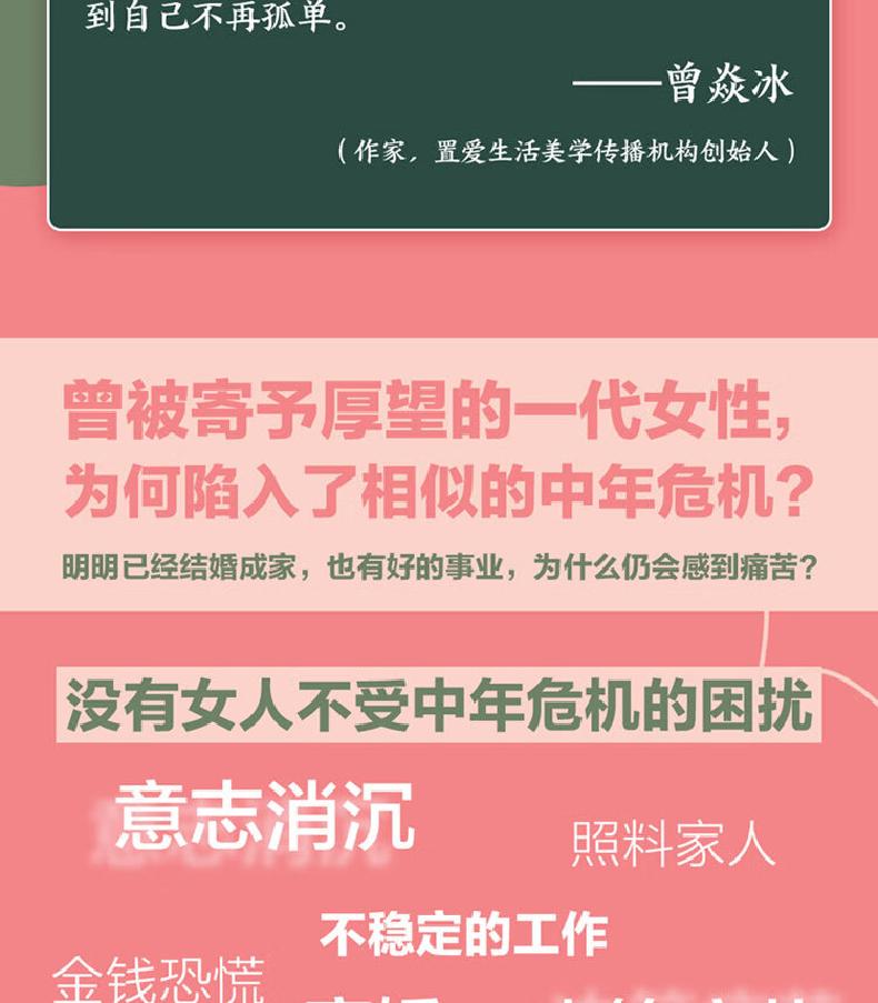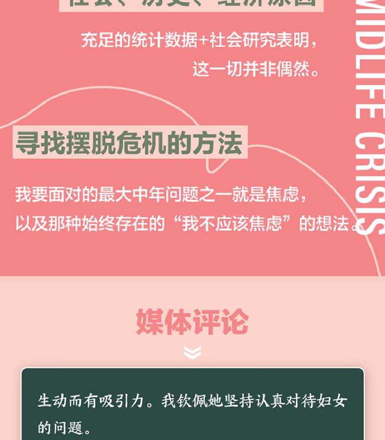★个人故事和社会研究的美结合,揭示危机背后的文化、政治背景 本书呈现了丰富的中年女性样本,无论婚姻状况如何,无论事业是否有成,为什么在步入中年后都有相似的愤怒和无力,通过她们的自我陈述,结合社会学家、心理学家的评论和统计数字,揭露了女性中年危机后的文化、社会变迁。