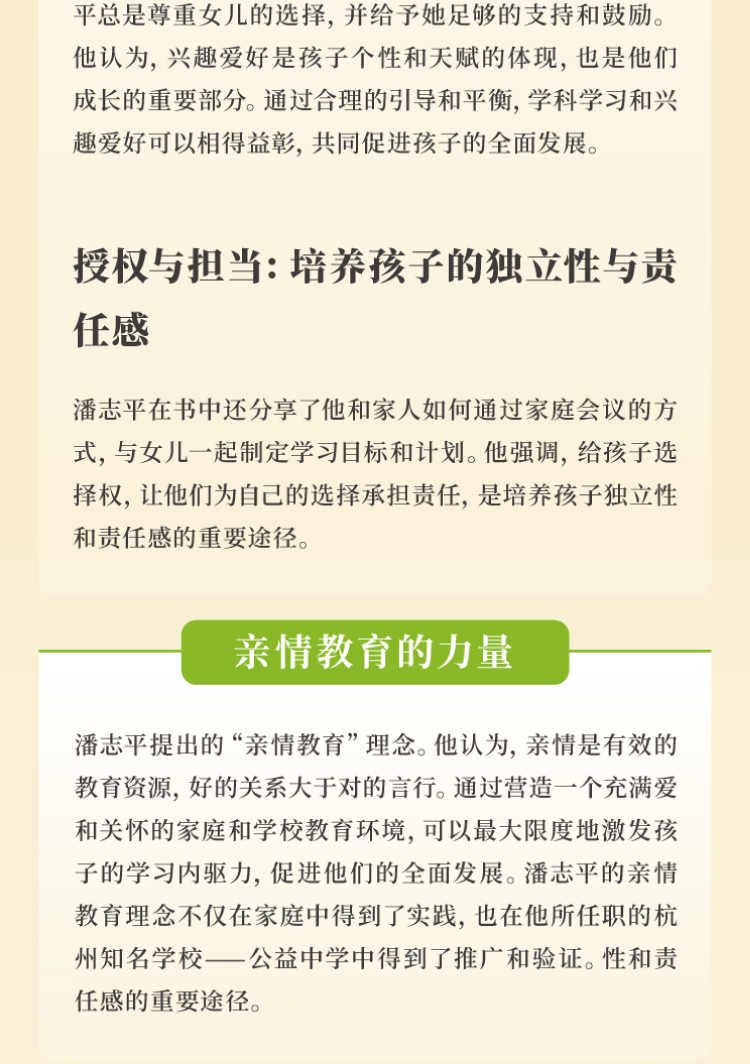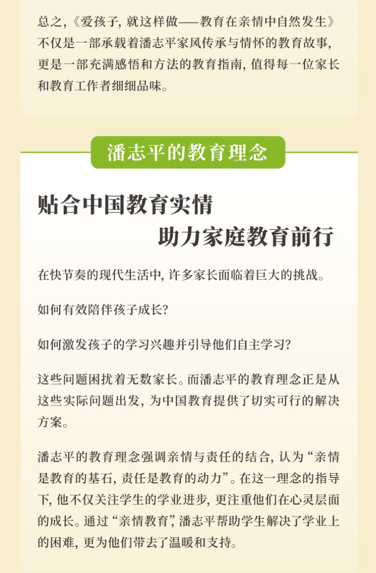 总之,《爱孩子,就这样做——教育在亲情中自然发生》不仅是一部承载着潘志平家风传承与情怀的教育故事,更是一部充满感悟和方法的教育指南,值得每一位家长和教育工作者细细品味。