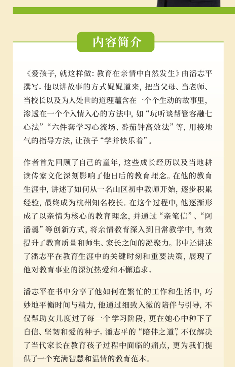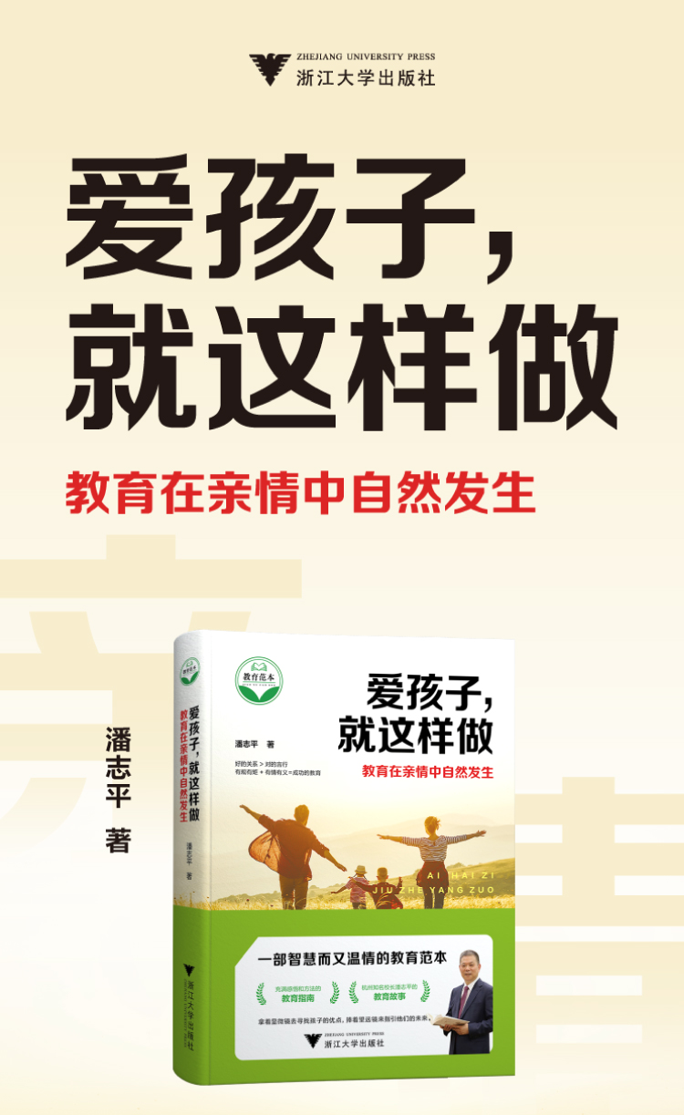 《爱孩子,就这样做——教育在亲情中自然发生》由潘志平撰写。他以讲故事的方式娓娓道来,把当父母、当老师、当校长以及为人处世的道理蕴含在一个个生动的故事里,渗透在一个个入情入心的方法中,如“玩听谈帮管容融七心法”“六件套学习心流场、番茄钟高效法”等,用接地气的指导方法,让孩子“学并快乐着”。