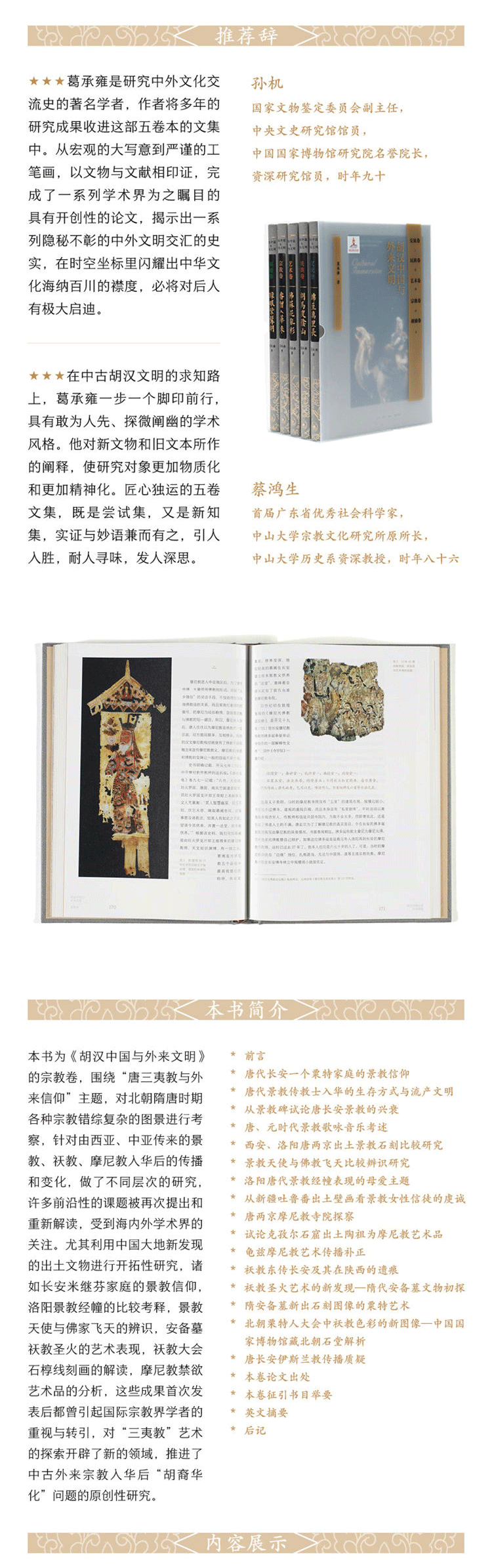 全书总书名为《胡汉中国与外来文明》,分为五卷,即《交流卷:绵亘万里长》《民族卷:胡马度阴山》《艺术卷:拂菻花乱彩》《宗教卷:番僧入华来》《胡俑卷:绿眼紫髯胡》。在书中,作者纵论胡汉文化如何在汉唐时期进行深入交流互动,具体考察了入华胡人的生活状况,探讨外来文明对中原建筑、书法、绘画、雕塑以及生活习俗等方面的影响,挖掘祆教、摩尼教、景教等在中原地区的传播。作者长期工作于考古文博的一线,亲身接触大量新出土但尚未刊布的考古文物及文献成果,在此基础上,作者撰写多篇文章并配以重要的图片,这些研究文章对于推动历史学、考古学的研究,对于建立中国学者与国际学术界的交流有着极其重要的意义。同时,作者关注的地域空间大多与汉唐以来丝路沿线的族群、政权相关联,对于这些地区的历史、文化、宗教、艺术的基础性研究,对于扎实推进“一带一路”构想有着积极作用。