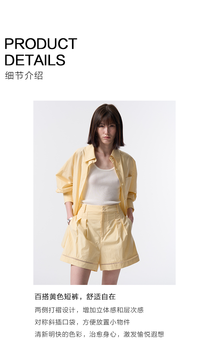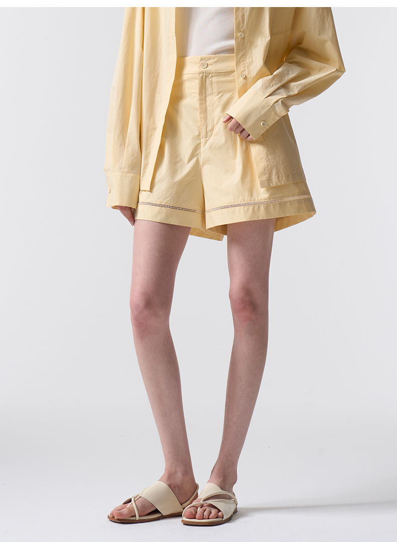 VIMAGE纬漫纪纯棉高腰镂空花边舒适休闲浅黄色短裤2026春季新款V2505207