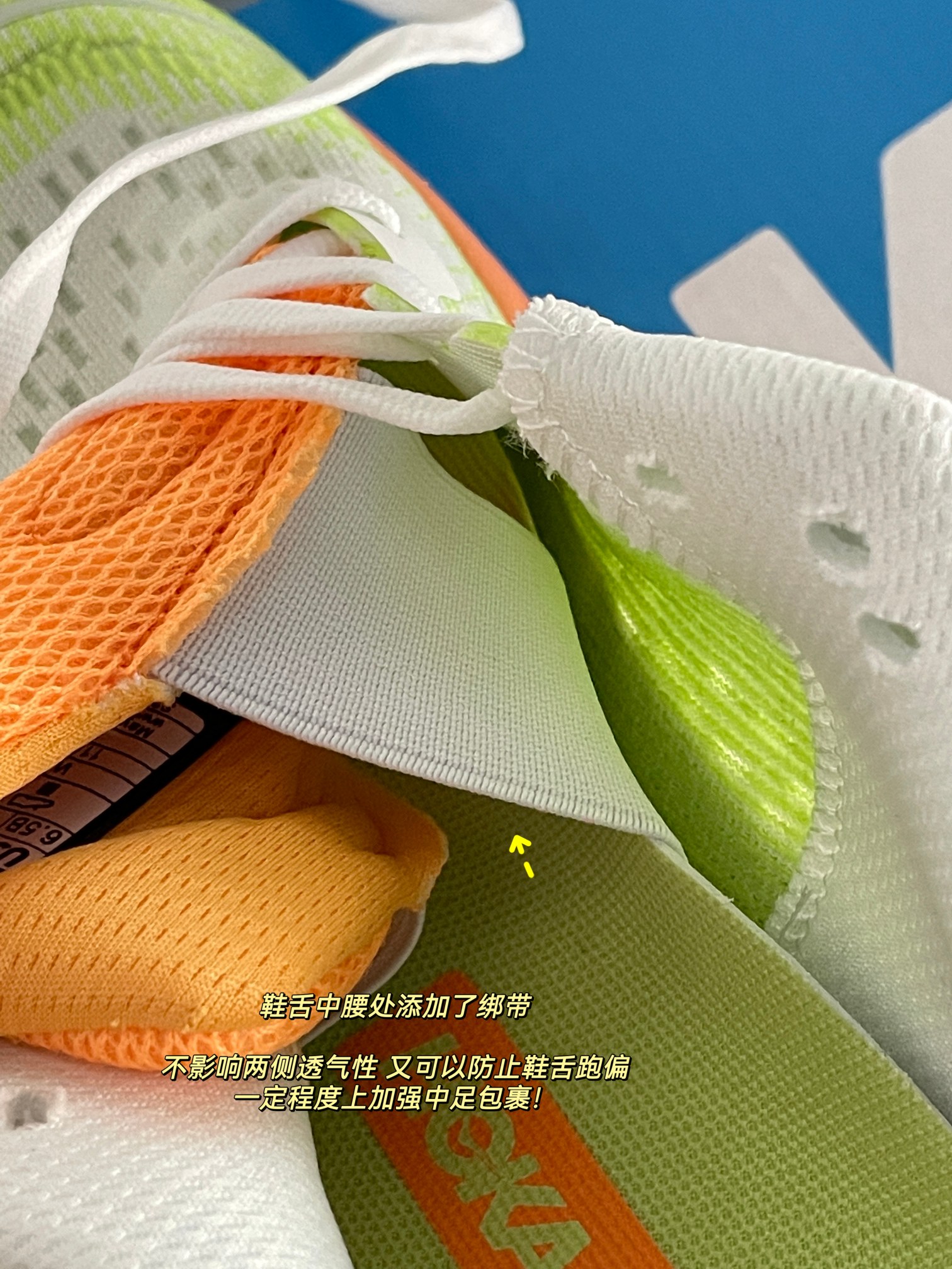 鞋舌中腰处添加了绑带,不影响两侧透气性,又可以防止鞋舌跑偏,一定程度上加强中足包裹