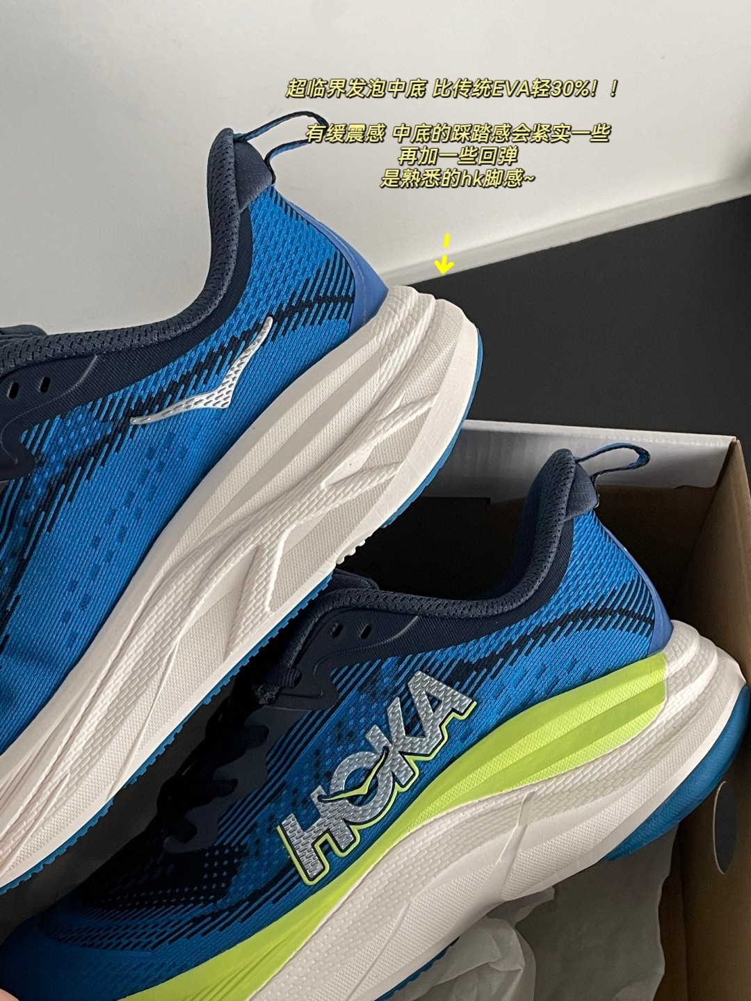 超临界发泡中底 比传统EVA轻30%!!有缓震感 中底的踩踏感会紧实一些 再加一些回弹,是熟悉的hk脚感~