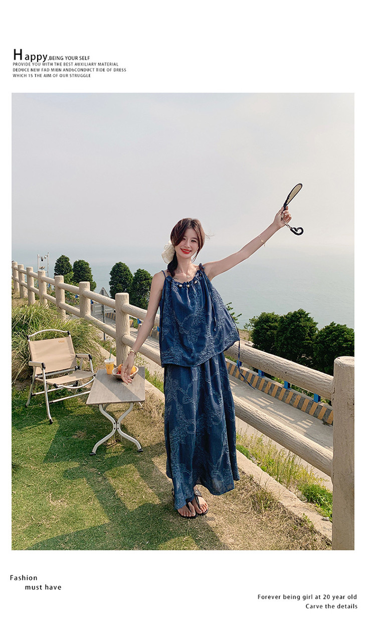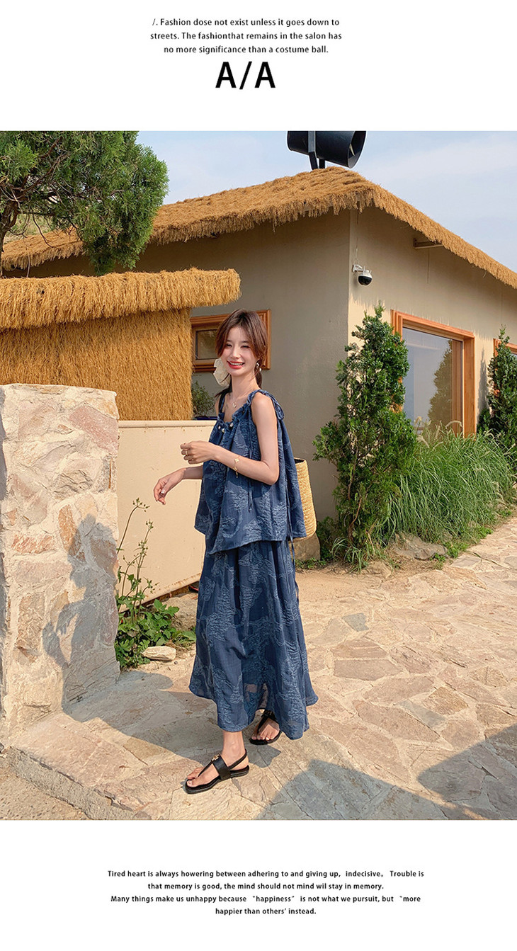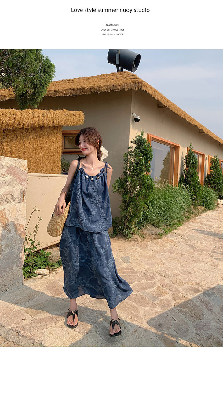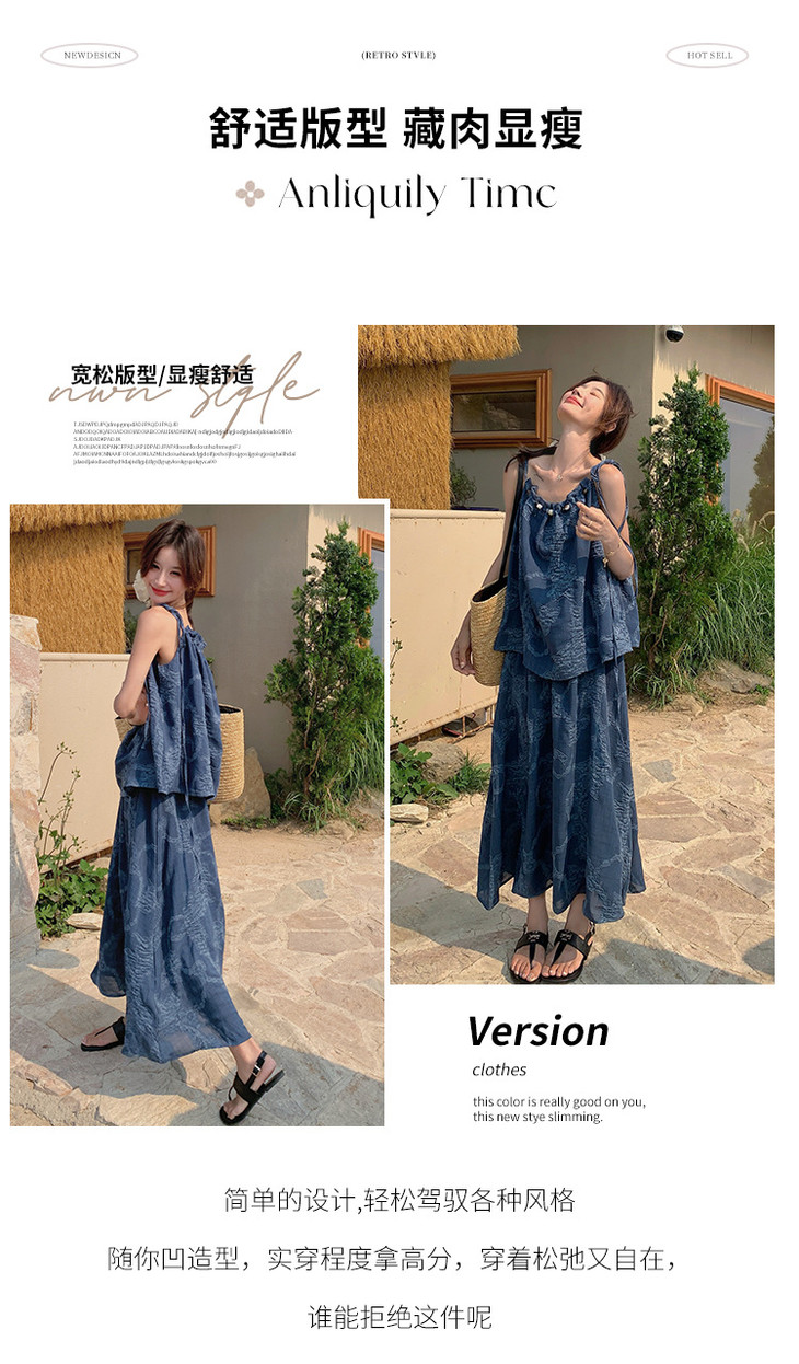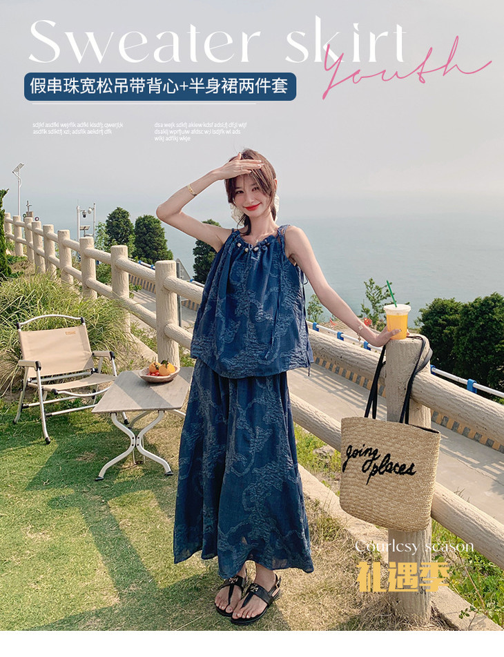 蓝色度假风复古印花无袖背心套装,宽松减龄半身裙两件套HR-6117