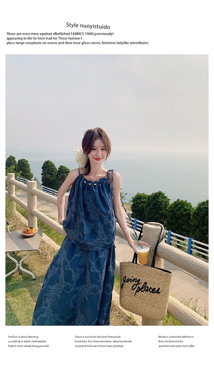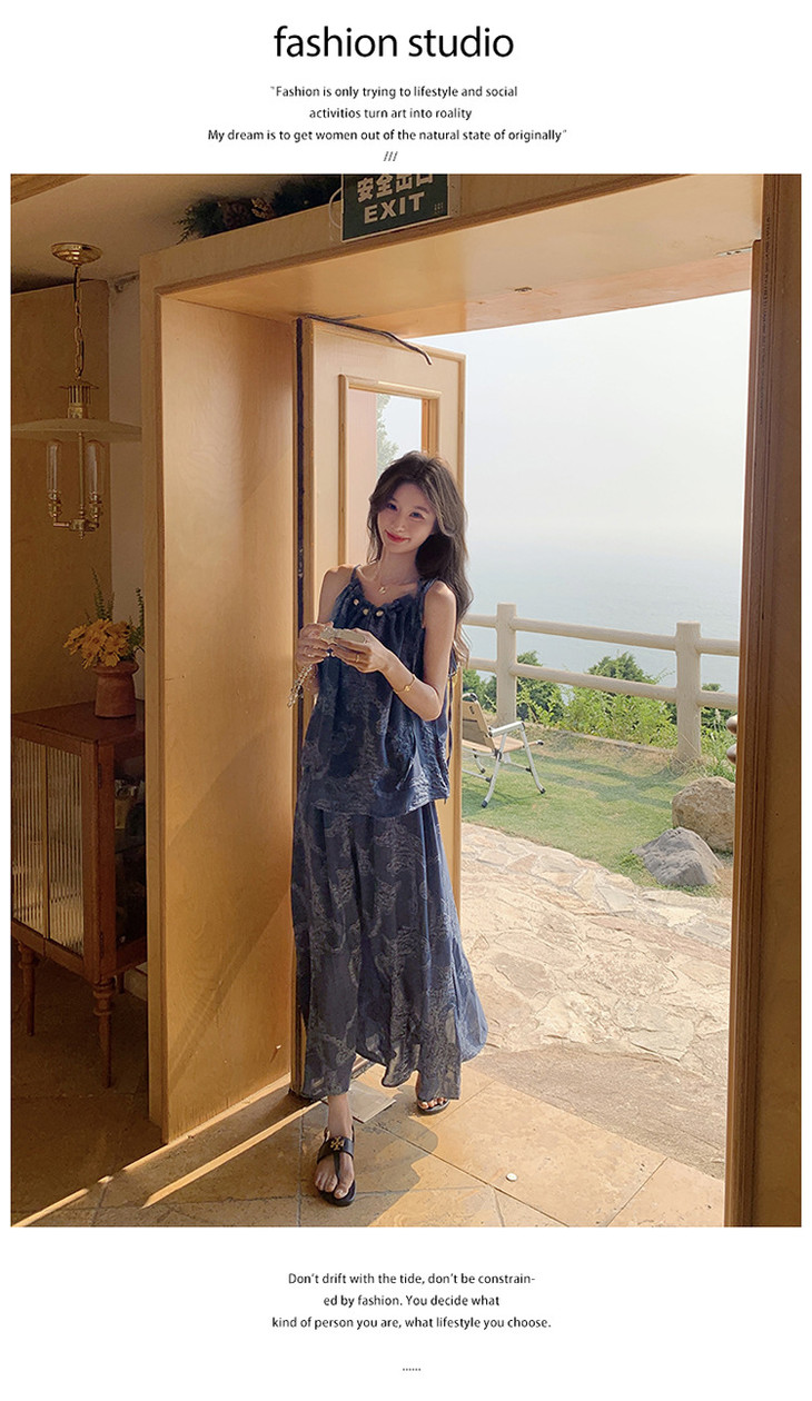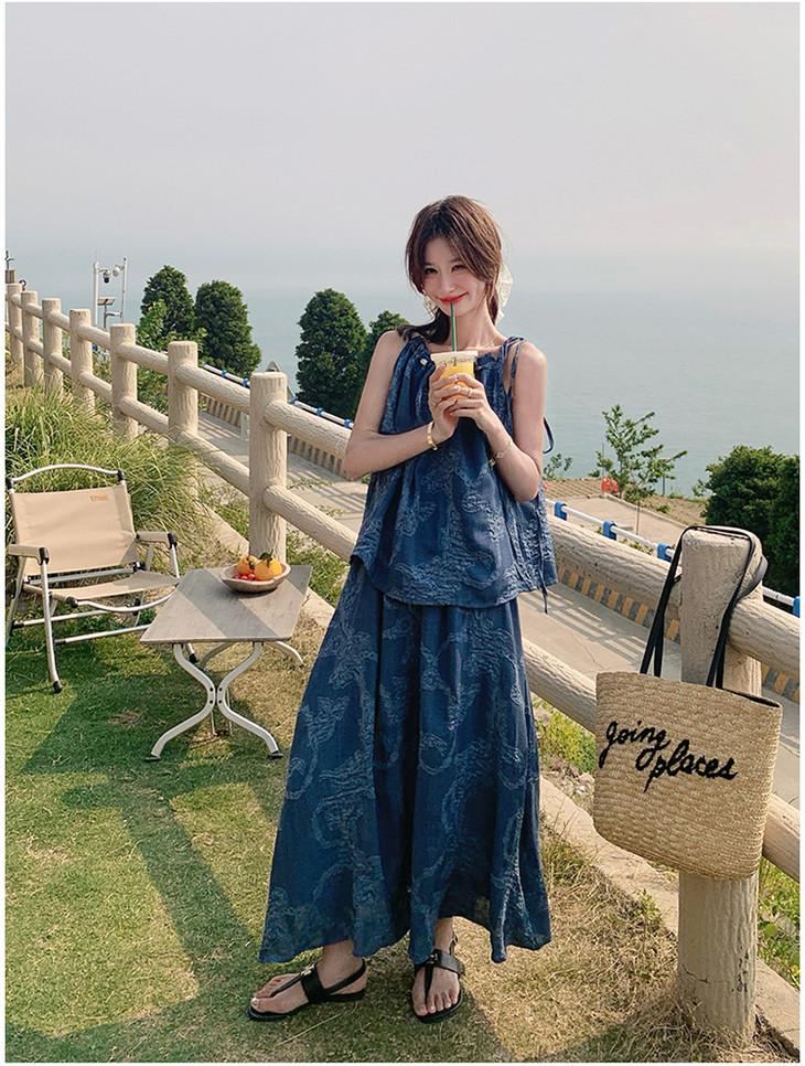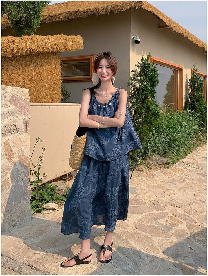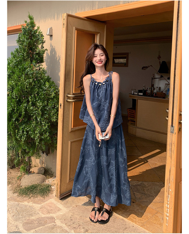 蓝色度假风复古印花无袖背心套装,宽松减龄半身裙两件套HR-6117