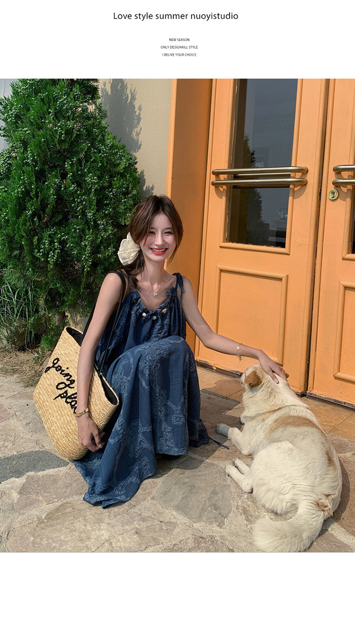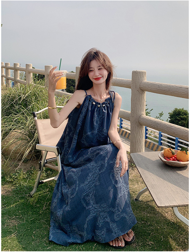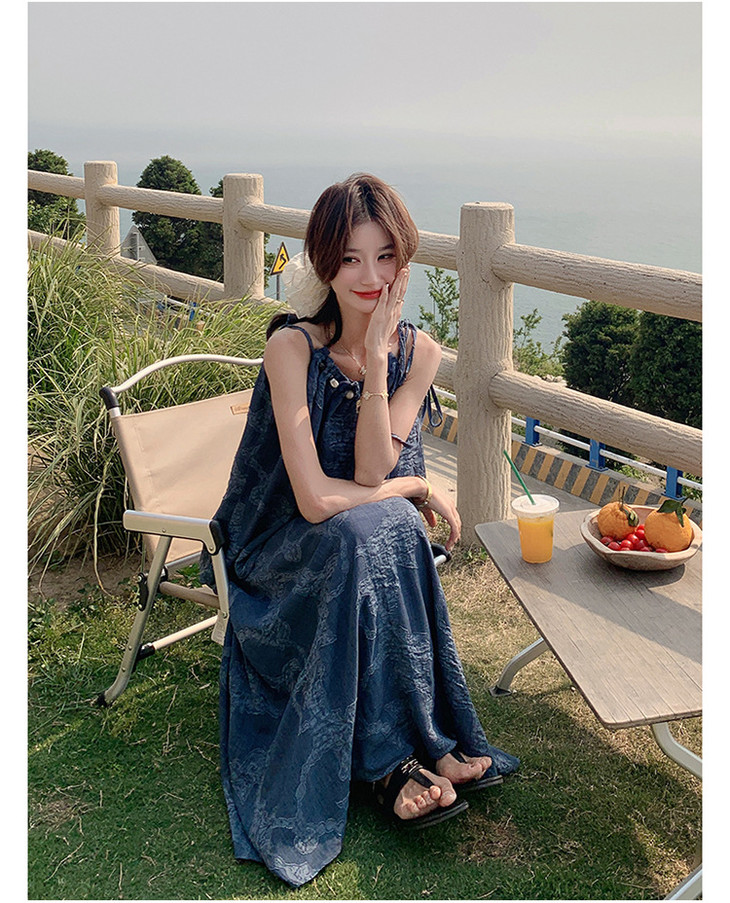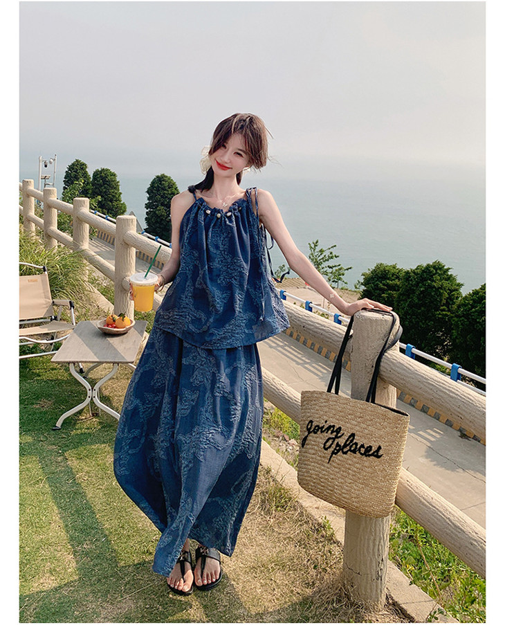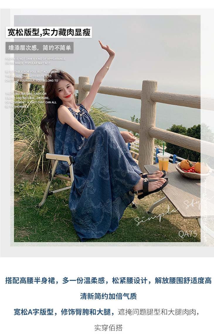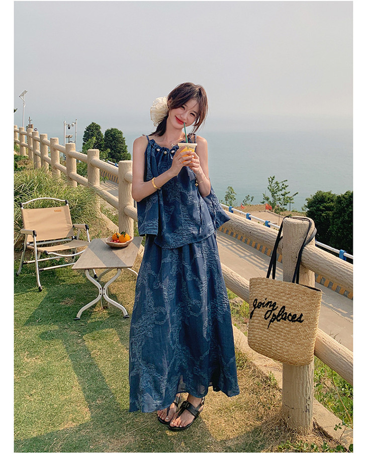 蓝色度假风复古印花无袖背心套装,宽松减龄半身裙两件套HR-6117