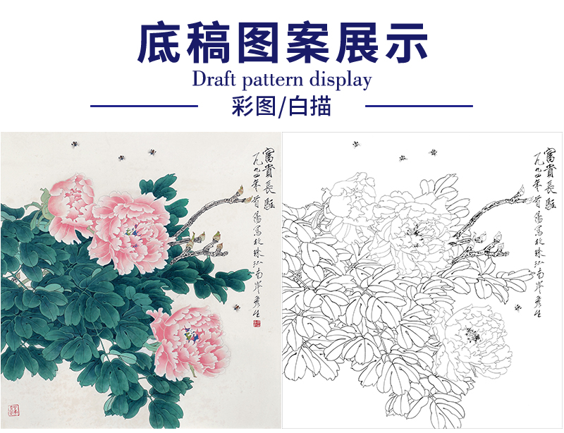 周彦生花鸟工笔画白描底稿《富贵长驻》临摹勾线高清打印稿A665