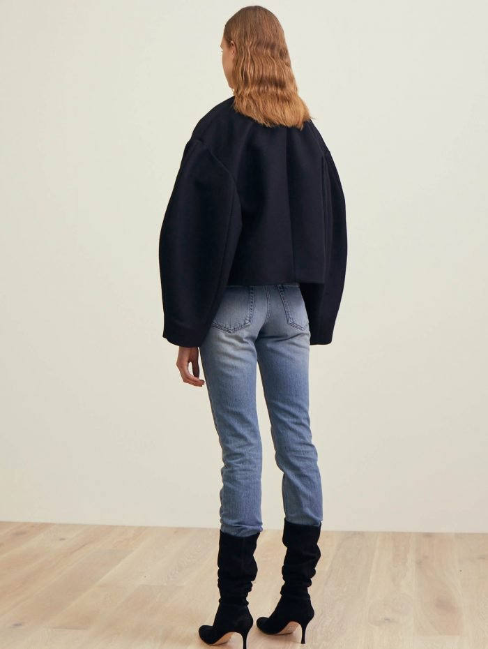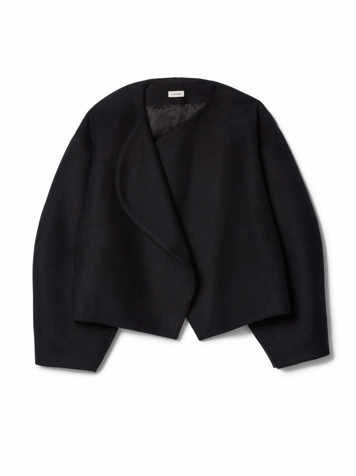 建筑感廓形外套,袖子一个弧度的设计相较于直筒袖更为合理,更能撑起衣服的整体形状。外套前片扇形开口,开合两种穿法。羊毛制,有一定份量感。