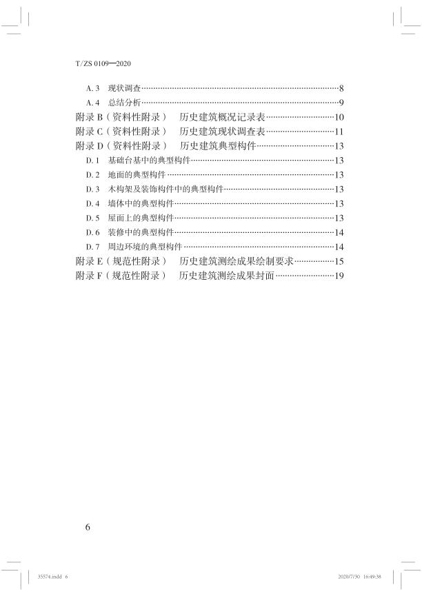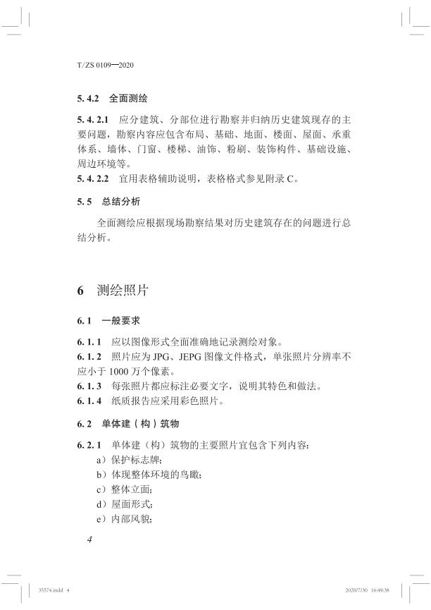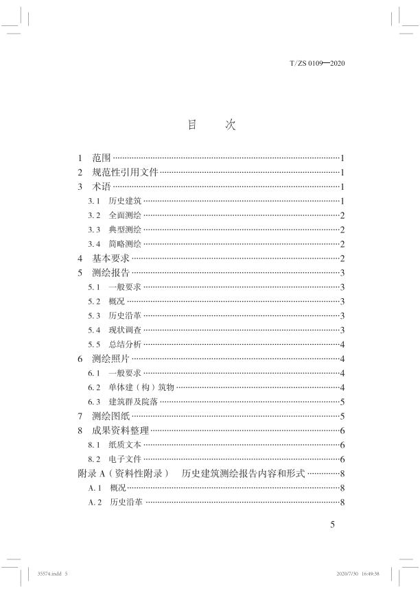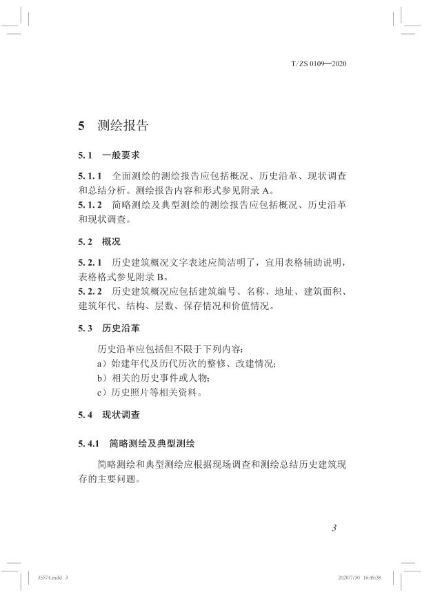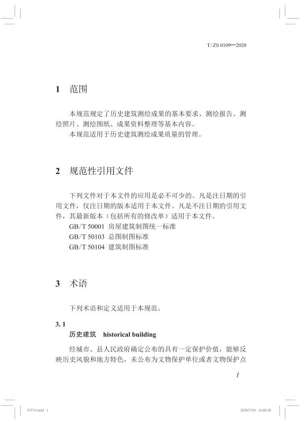 本标准起草单位:杭州市历史建筑保护管理中心、浙江大学建筑设计研究院有限公司、浙江风土工程设计有限公司、浙江省古建筑设计研究院、浙江省长三角标准技术研究院。本标准主要起草人:楼舒、王青春、南白苏、俞佳峰、孙 战、李忠慈、吴晓晖、肖民、黄立变、谢欢欢、邓铭庭。本规范规定了历史建筑测绘成果的基本要求、测绘报告、测绘照片、测绘图纸、成果资料整理等基本内容。 本规范适用于历史建筑测绘成果质量的管理。本标准内容包括范围、规范性引用文件、术语、基本要求、测绘报告、测绘照片、测绘图纸、资料整理等内容。