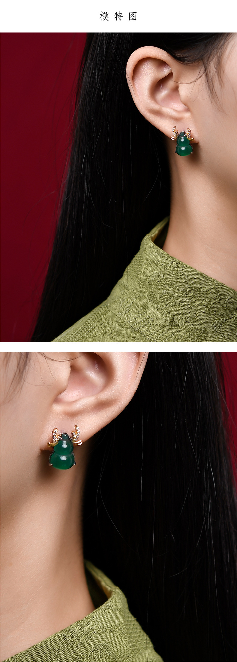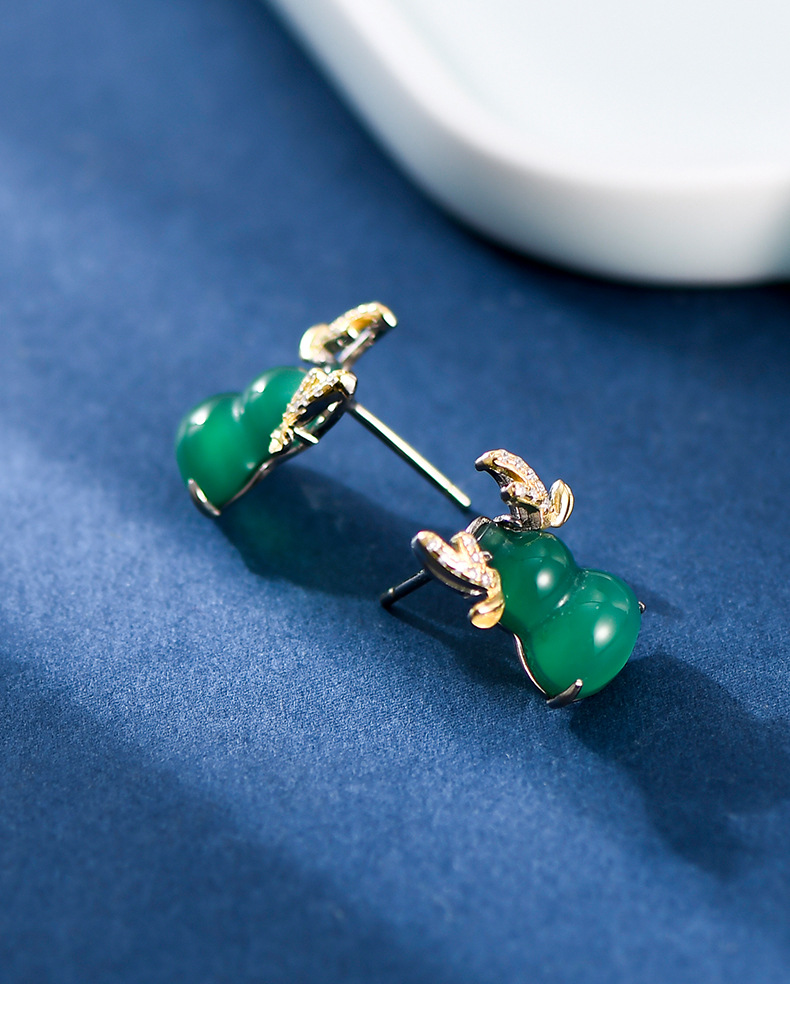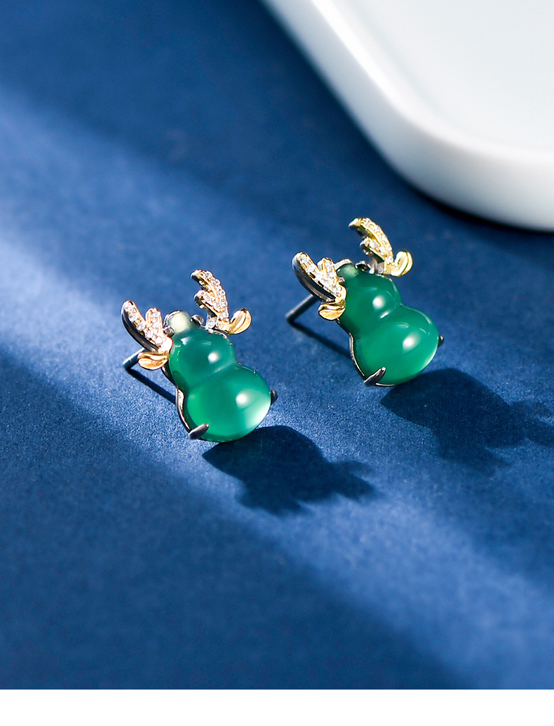 s925银绿玛瑙驯鹿葫芦耳钉女,复古立体小众设计冰种绿宝石耳饰TKT-DY3403755