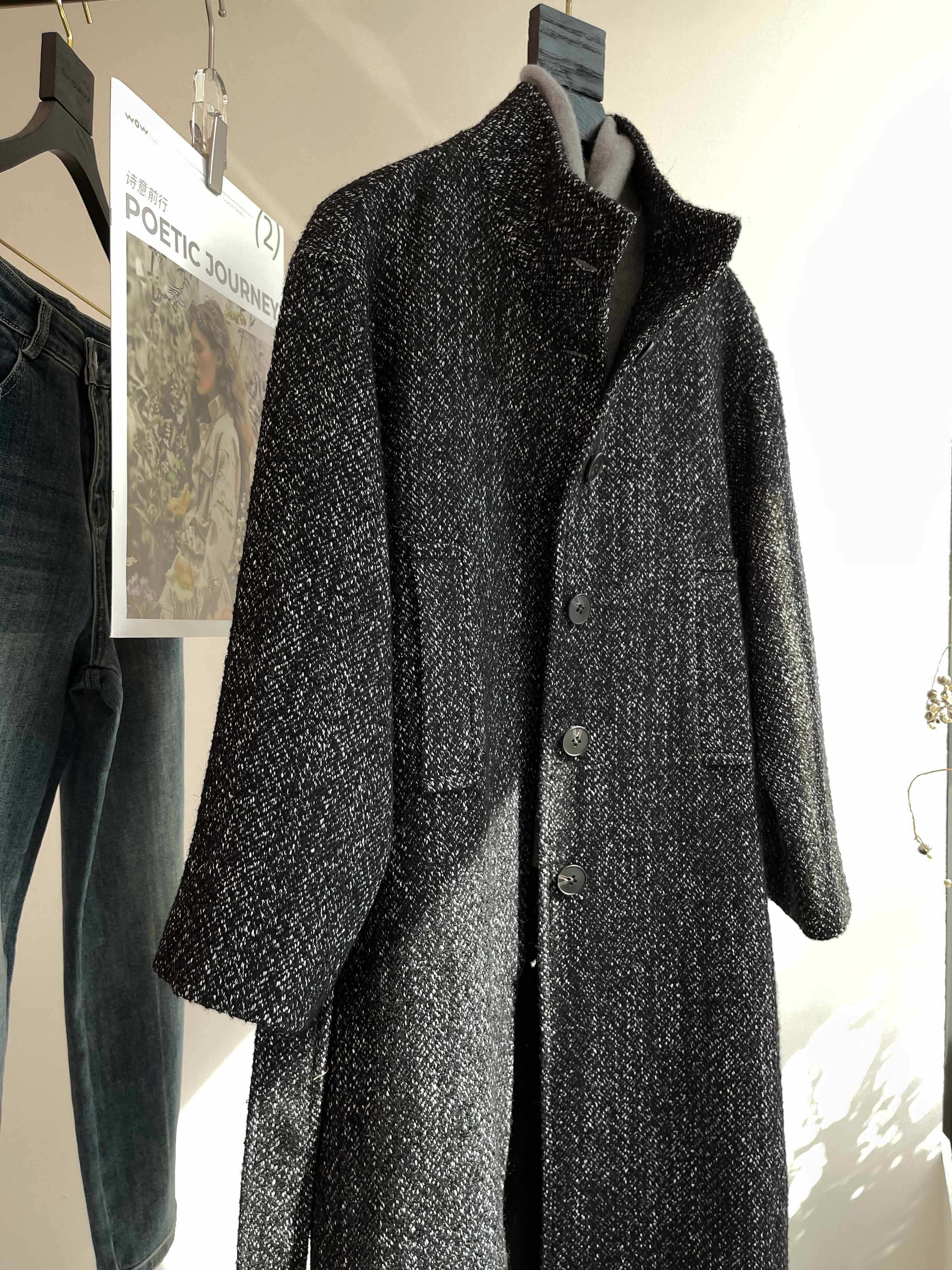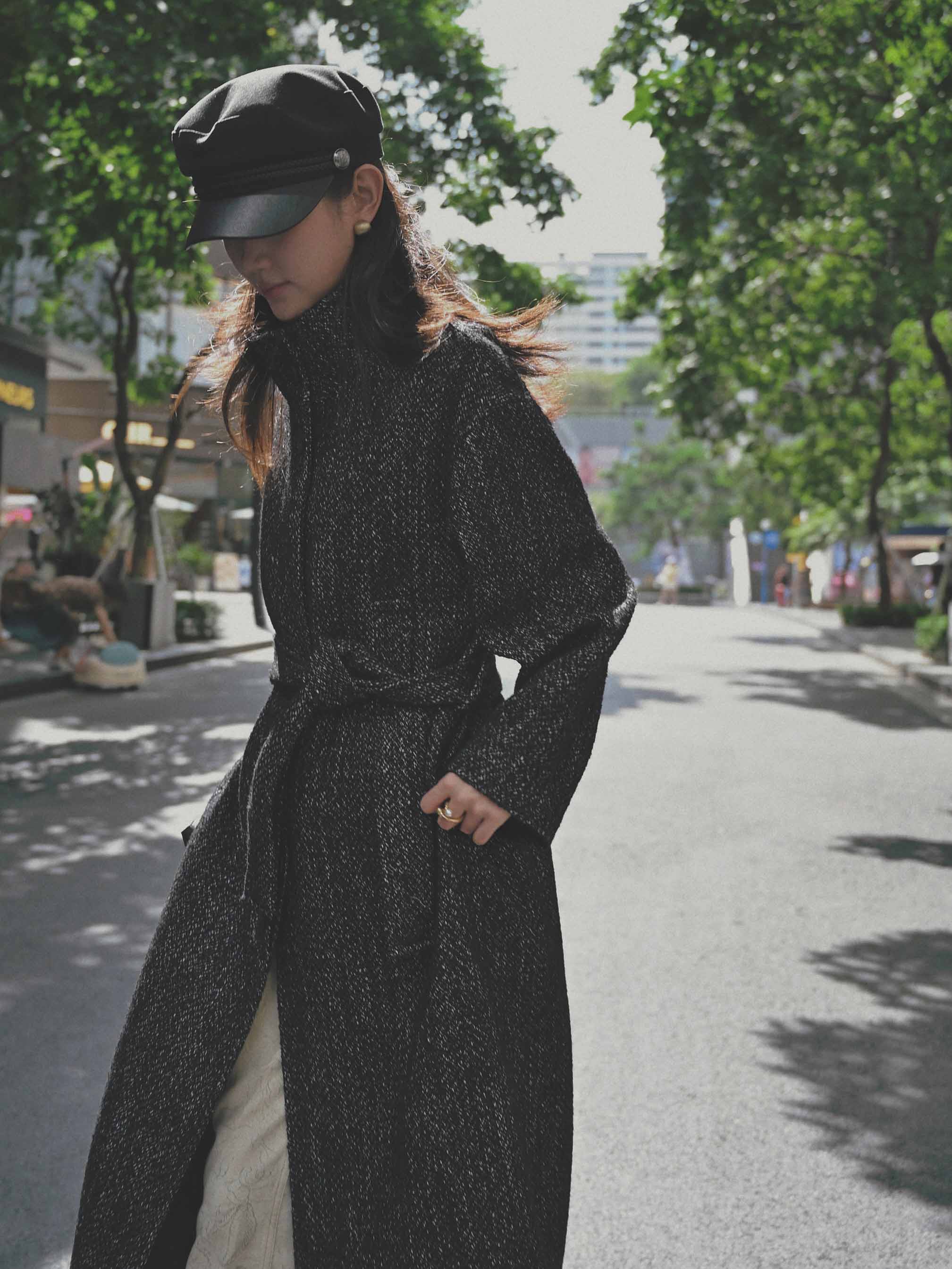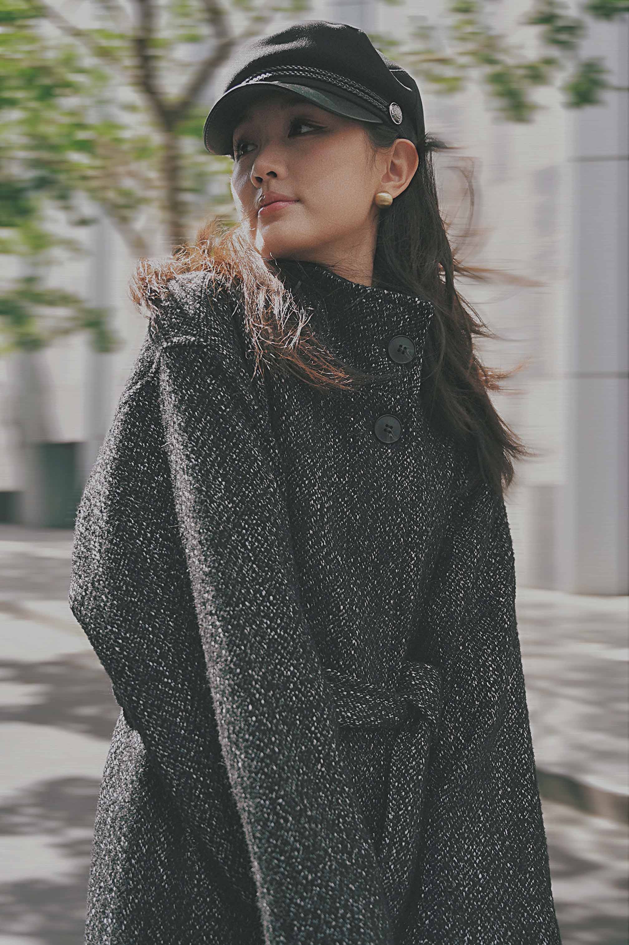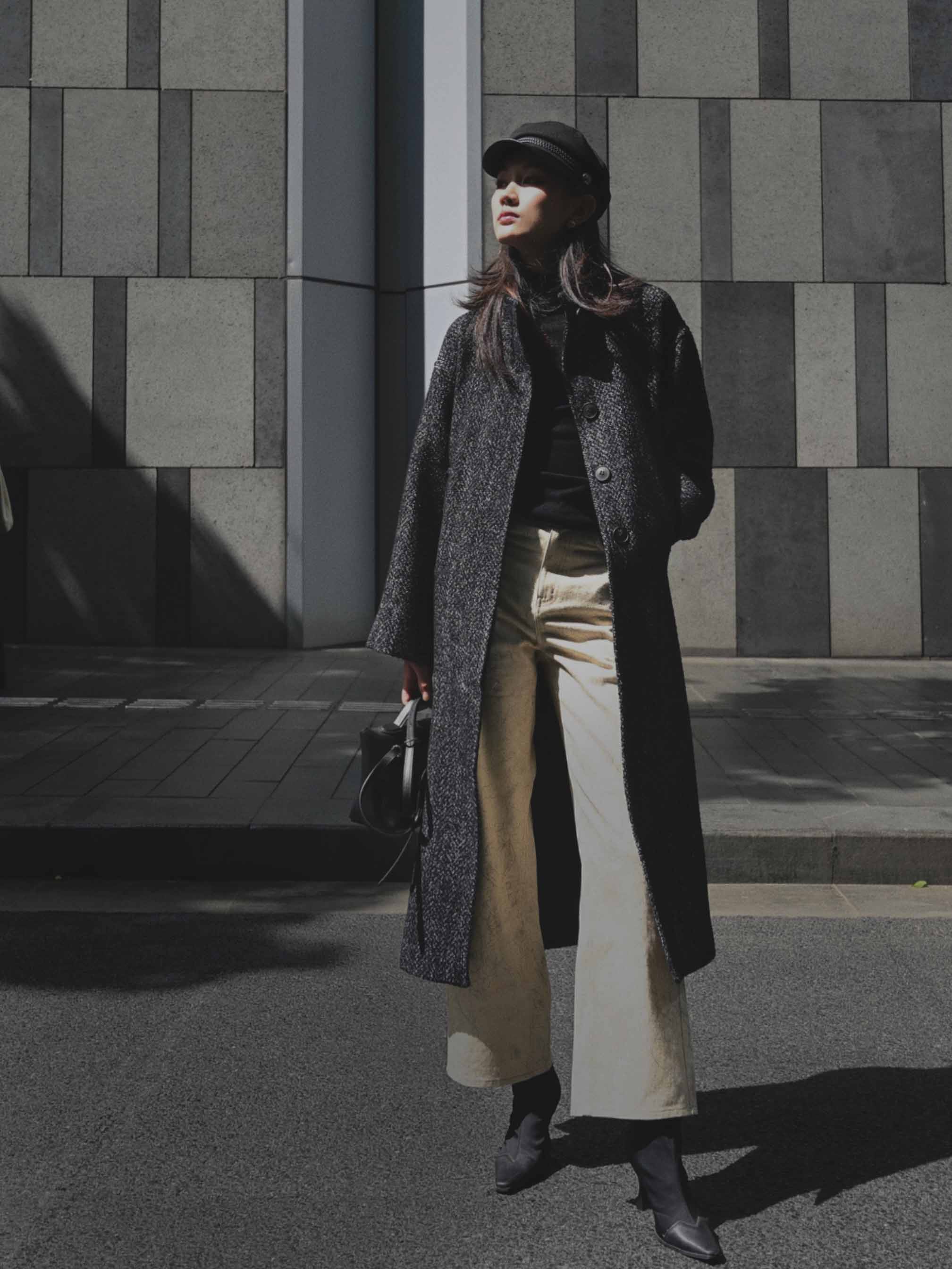 经典百搭的灰黑杂色风衣,立领帅气高级,直线门襟的穿搭更显修长