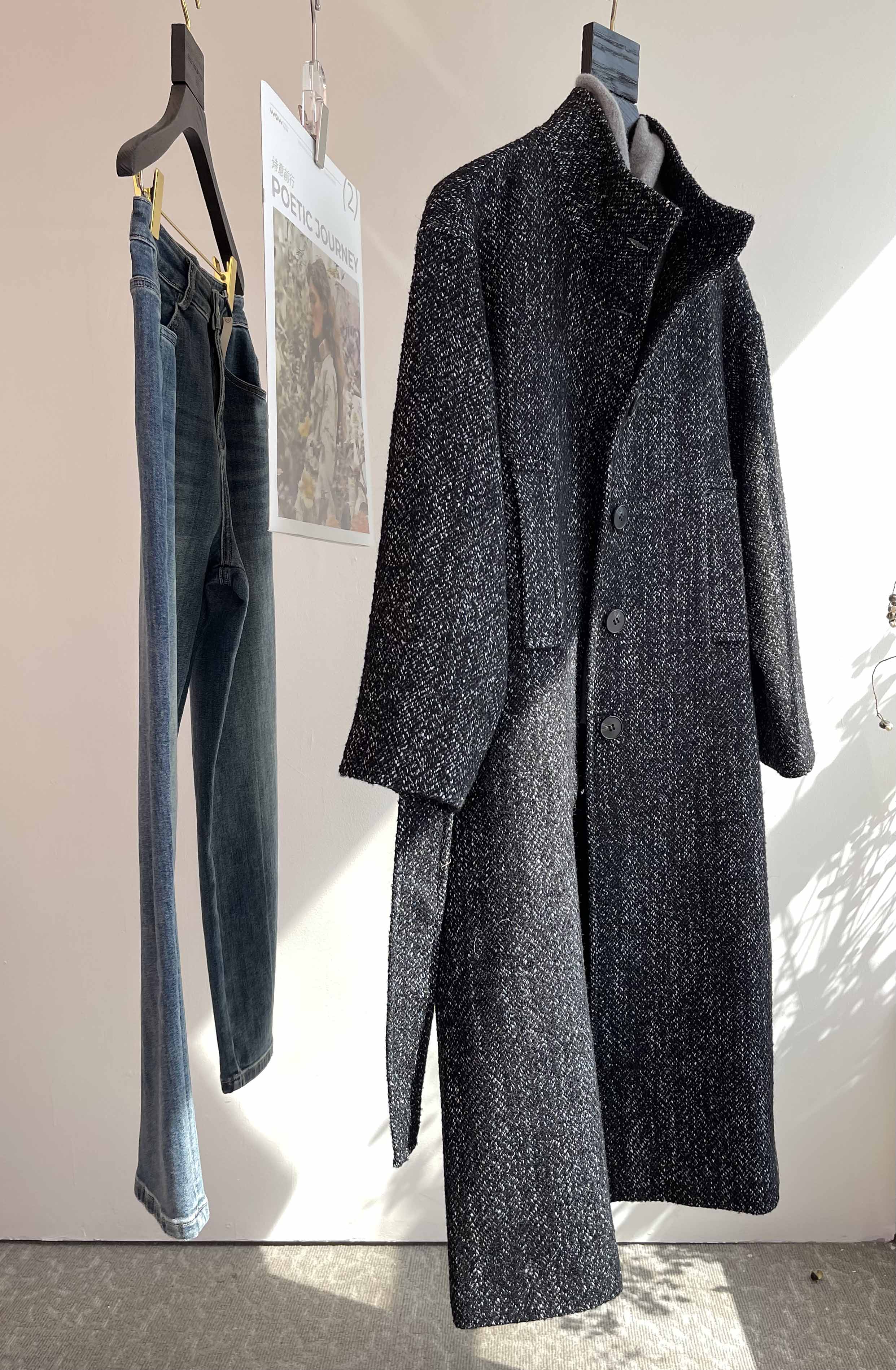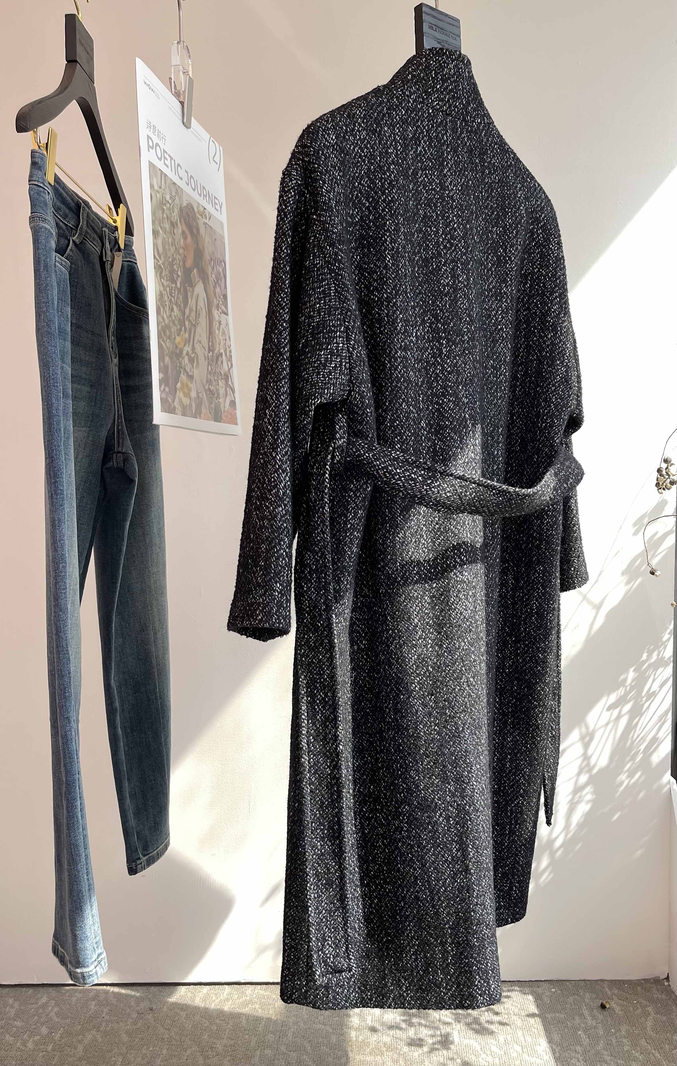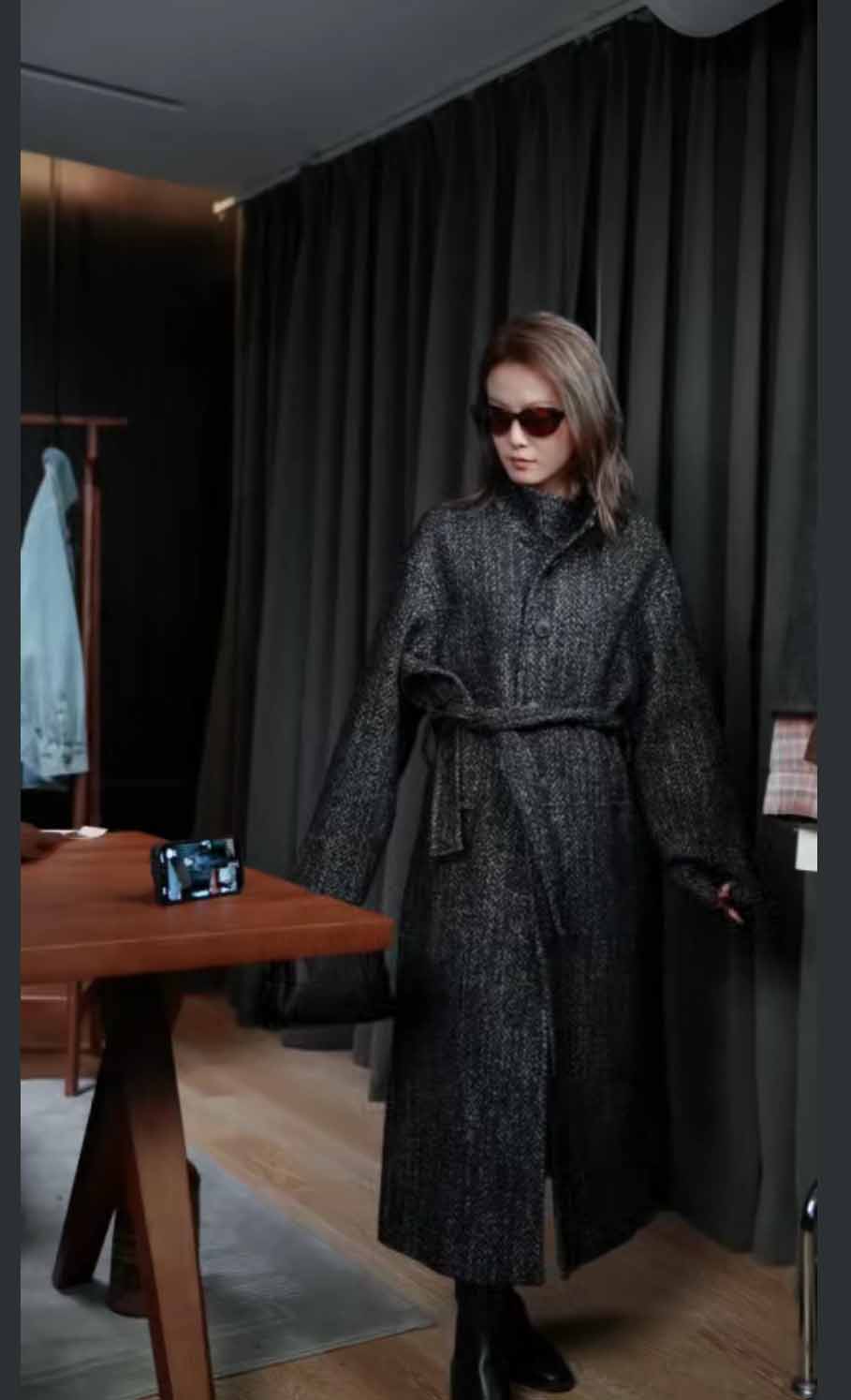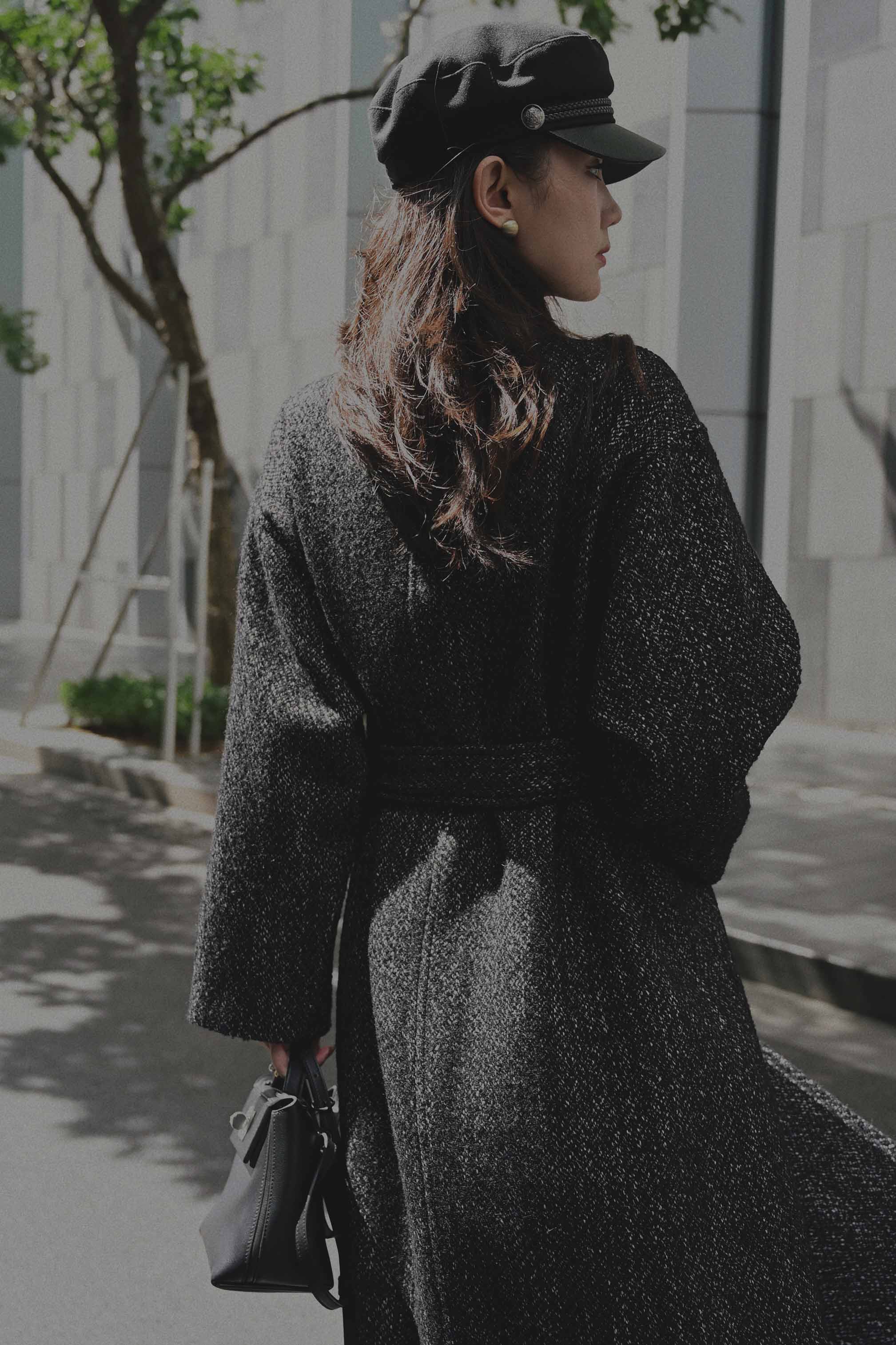 经典百搭的灰黑杂色风衣,立领帅气高级,直线门襟的穿搭更显修长