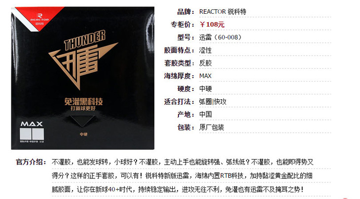 Reactor锐科特黑迅雷乒乓球胶皮反手用速度型涩性反胶乒乓球套胶