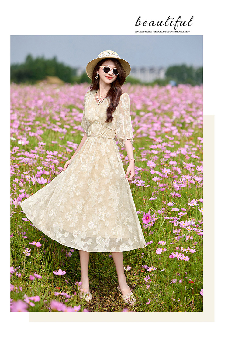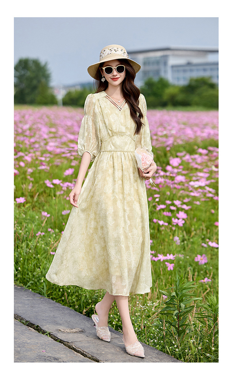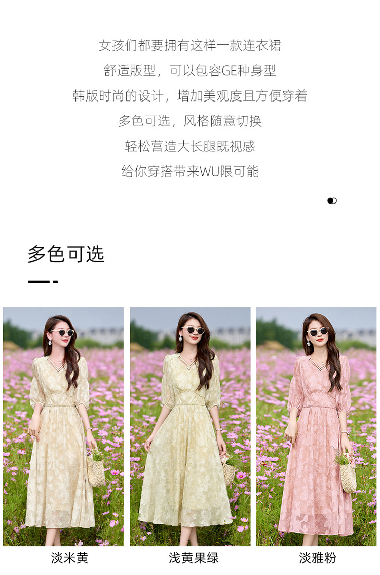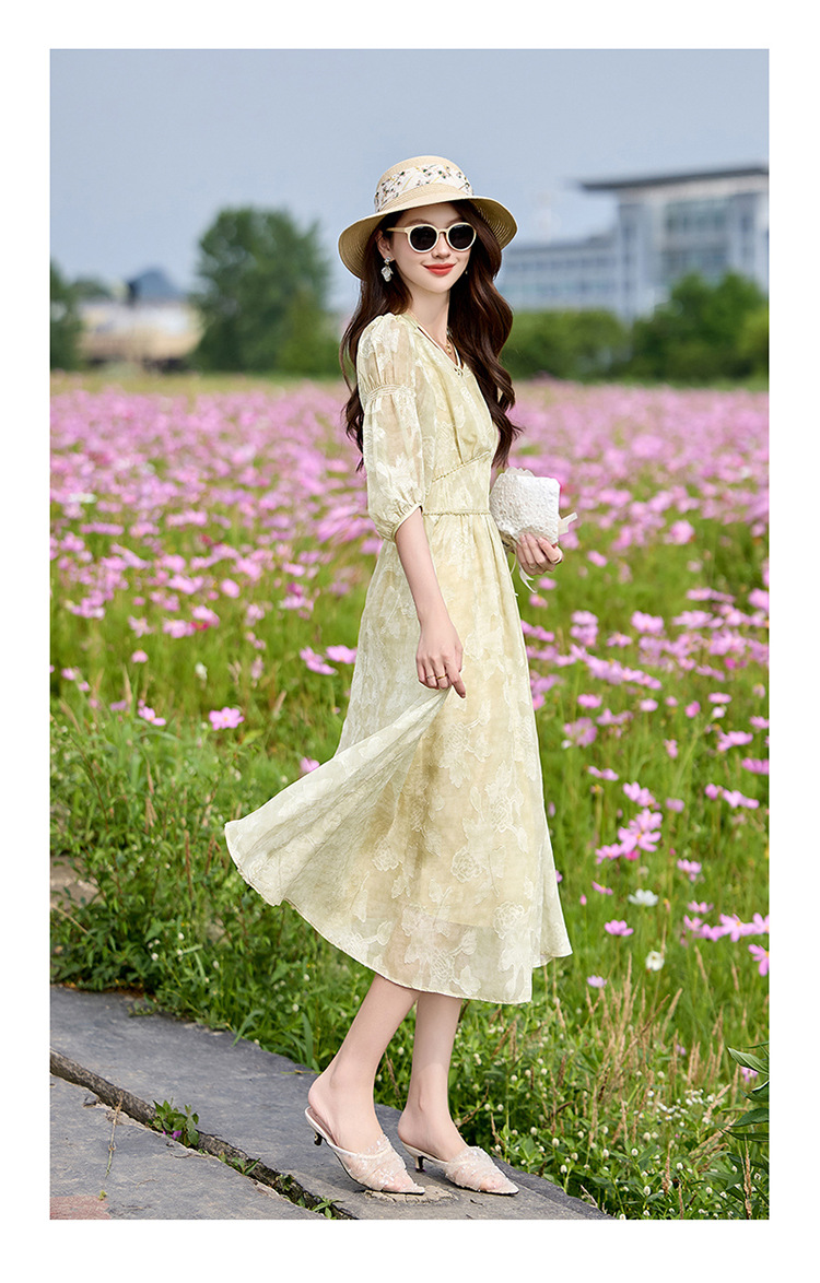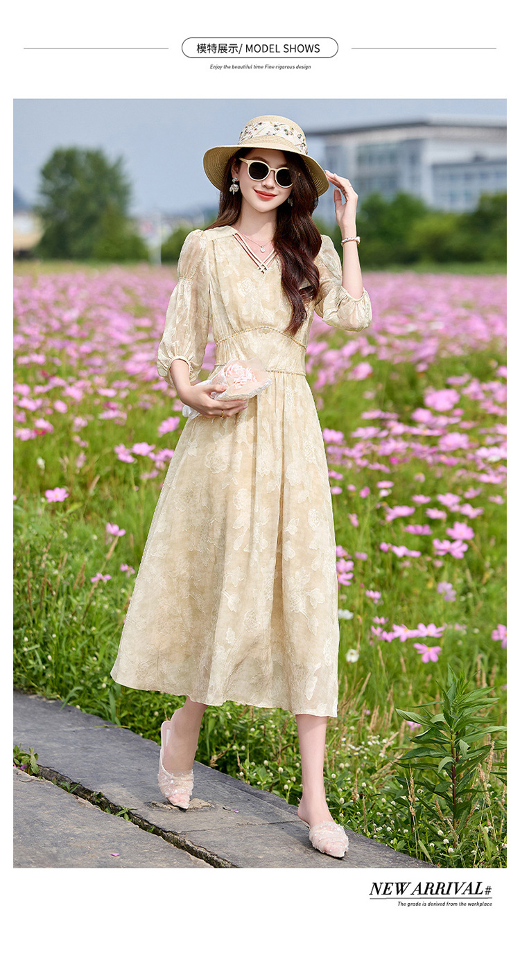 HR SNX3001气质领型中袖袖口穿着轻薄透气高腰显瘦连衣裙