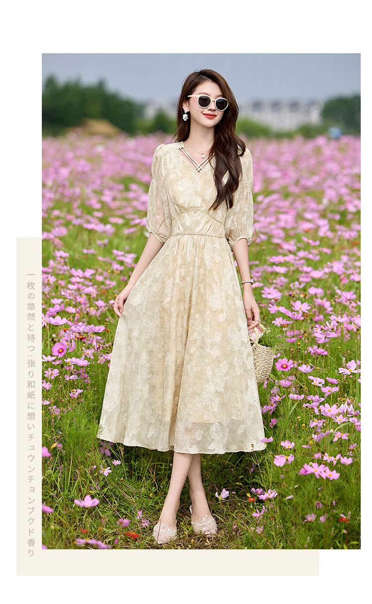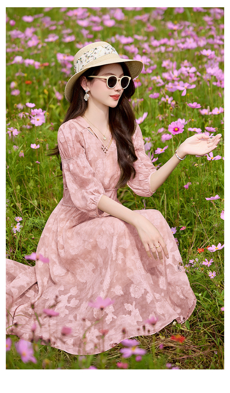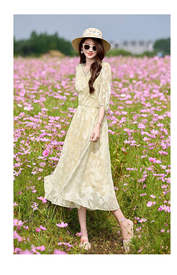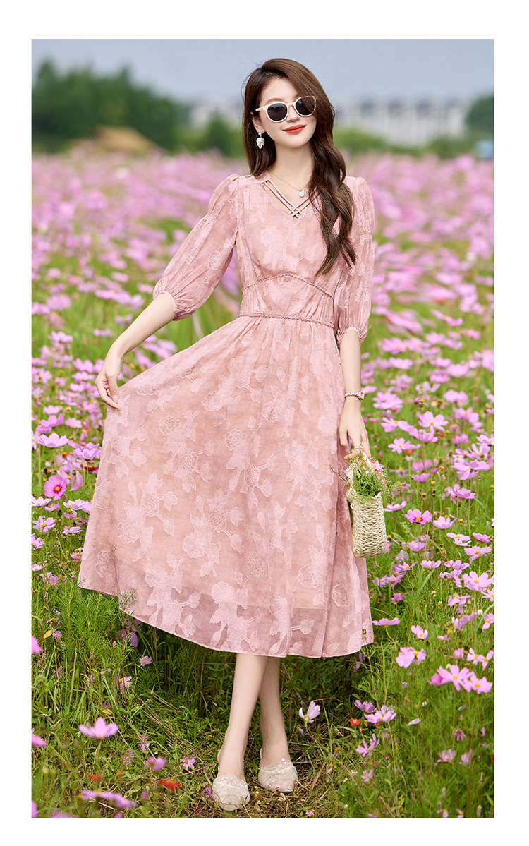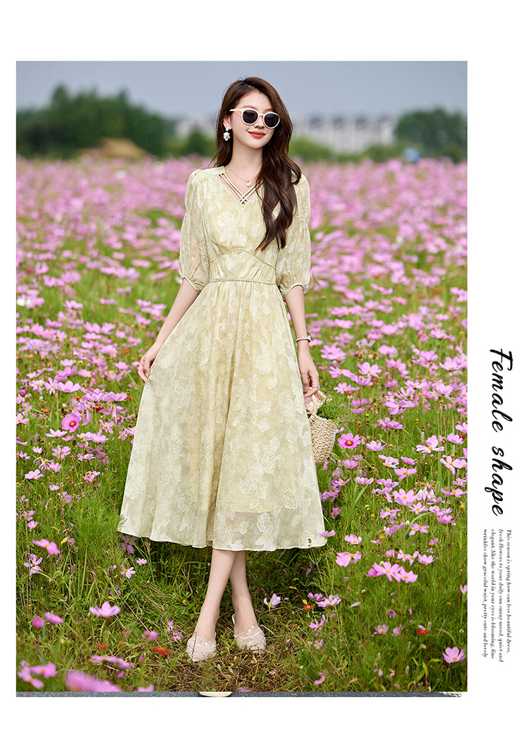 HR SNX3001气质领型中袖袖口穿着轻薄透气高腰显瘦连衣裙