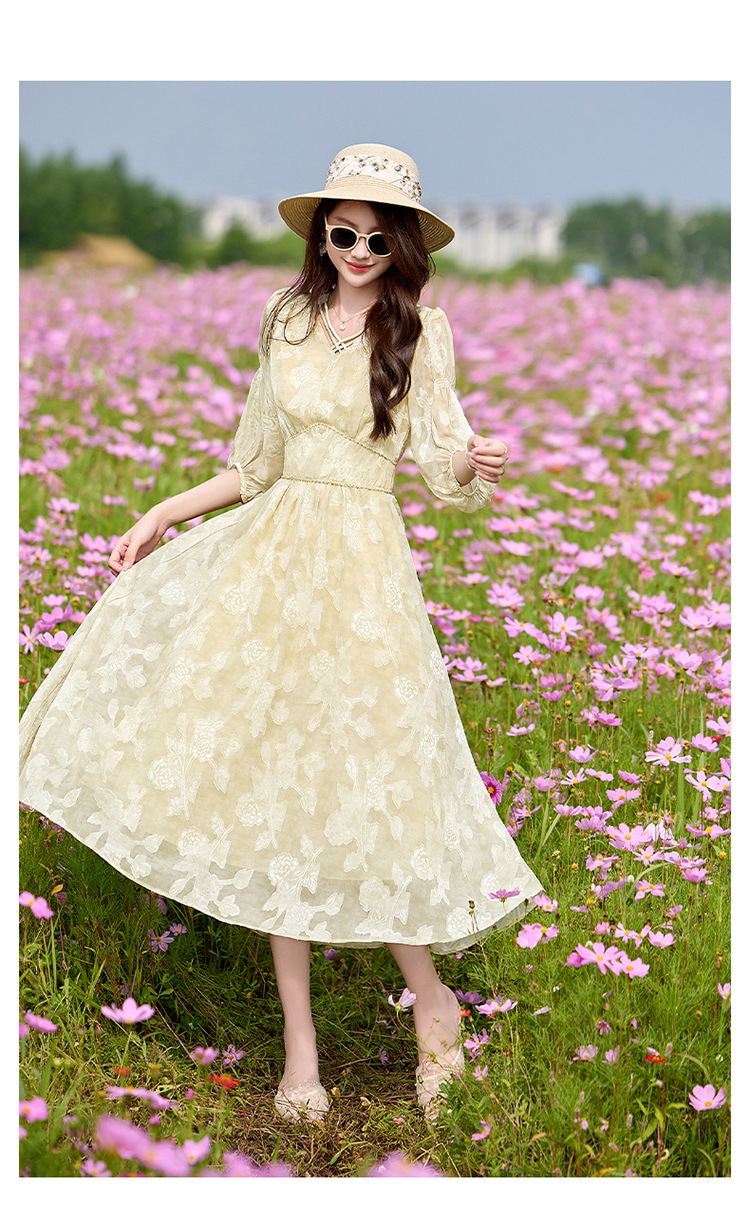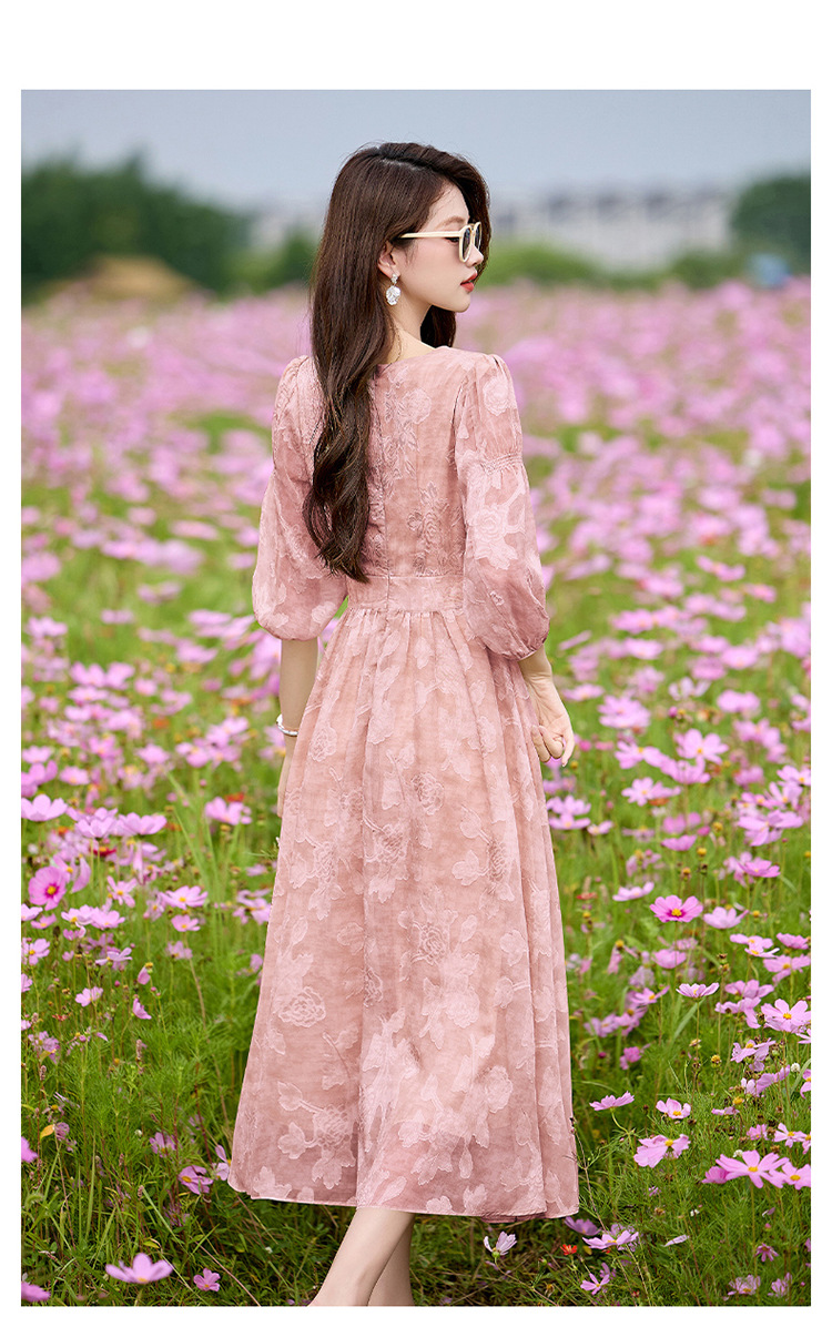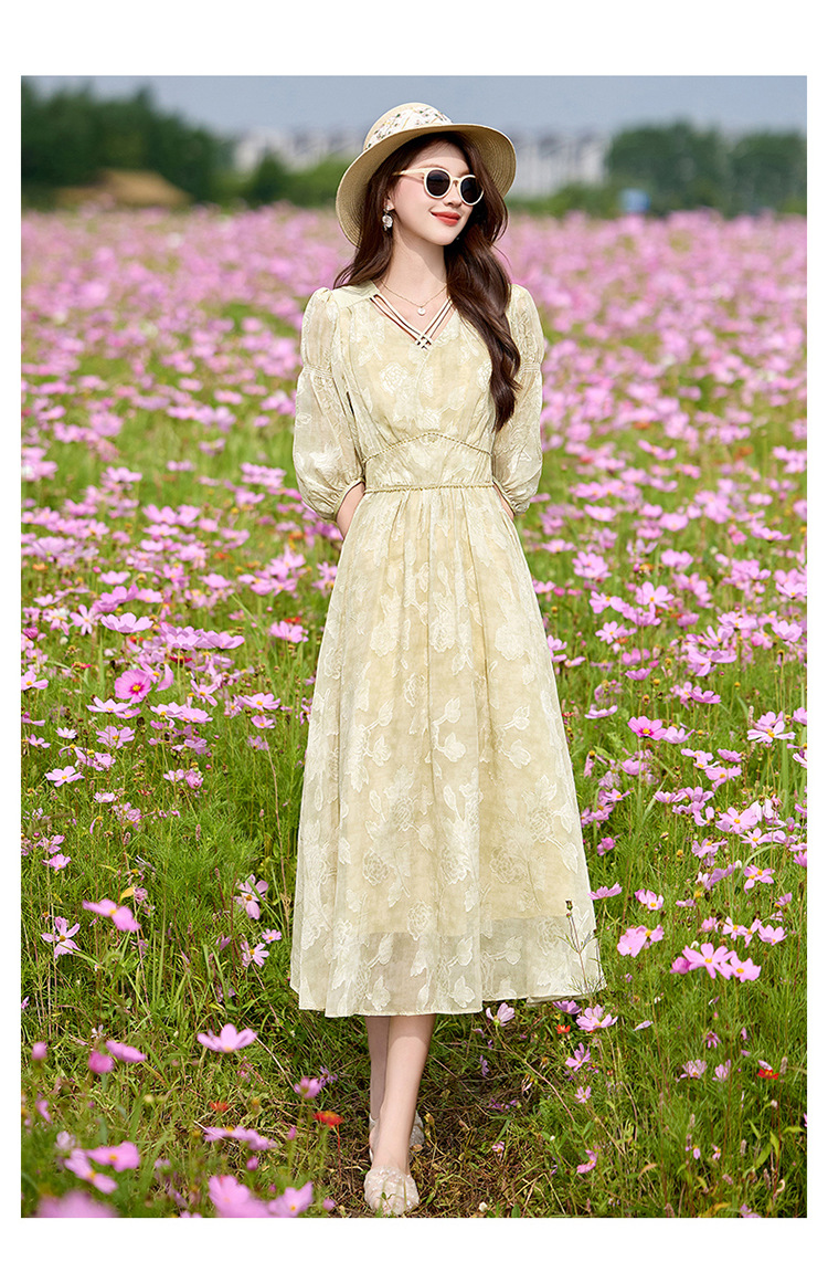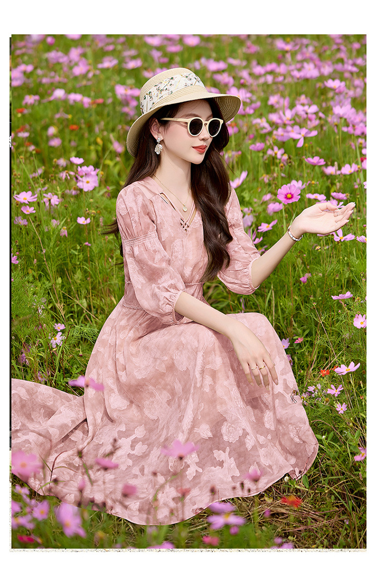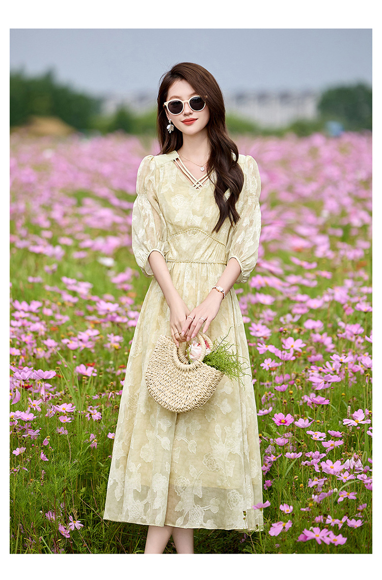 HR SNX3001气质领型中袖袖口穿着轻薄透气高腰显瘦连衣裙