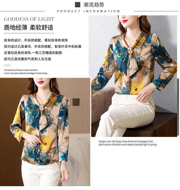 MZSMZ0334 2023蝴蝶结系带长袖缎面雪纺衫女小领结宽松显瘦套头衬衫气质上衣