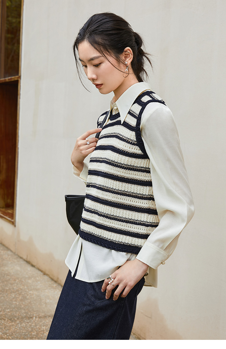 轻奢高级感坑条 Polo 领针织衫女 米白色撞色条纹拉链短袖 小个子通勤气质显瘦上衣