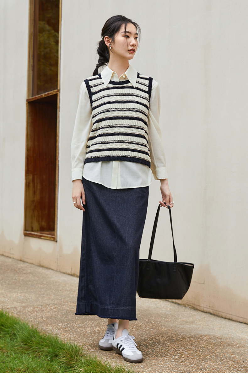 复古深蓝牛仔半裙 春季新款高腰毛边显瘦通勤中长裙